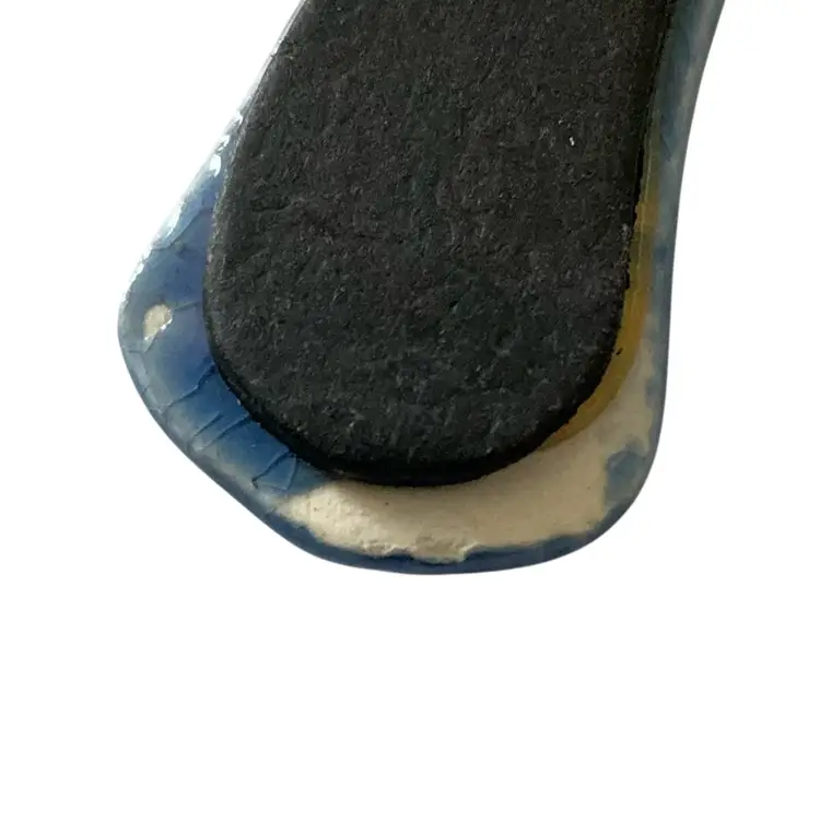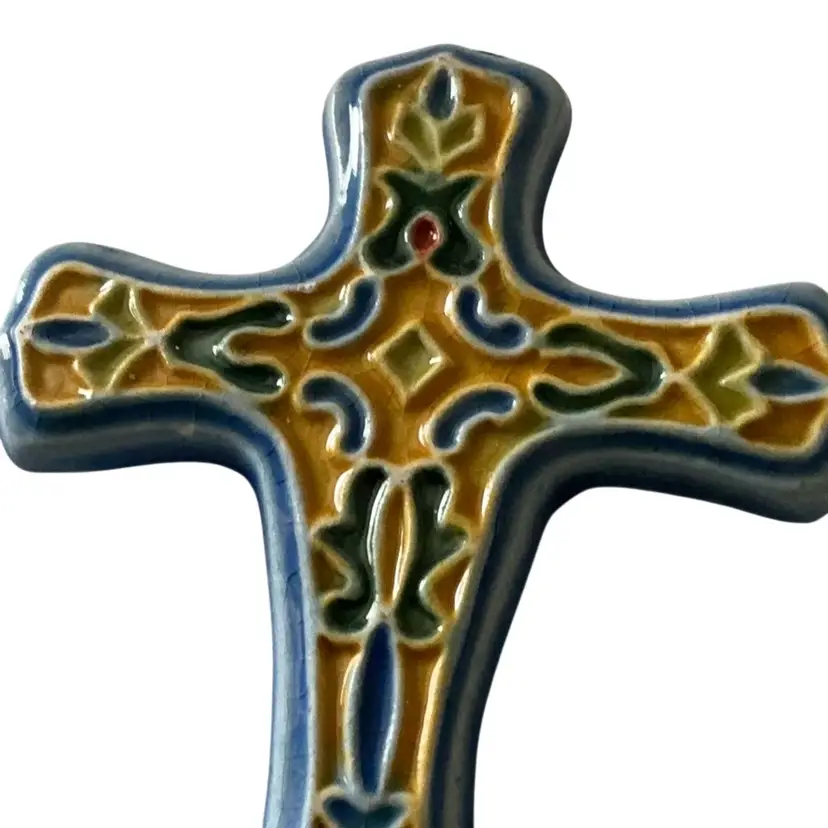 Lovely hand painted Talavera ceramic cross. Has metal backing and metal hanger so it can be placed on a wall. Pretty light blue, yellow and green colors adorn this item. A couple of small chips on the back of cross that cannot be seen from the front or interfere with the beauty of the piece.