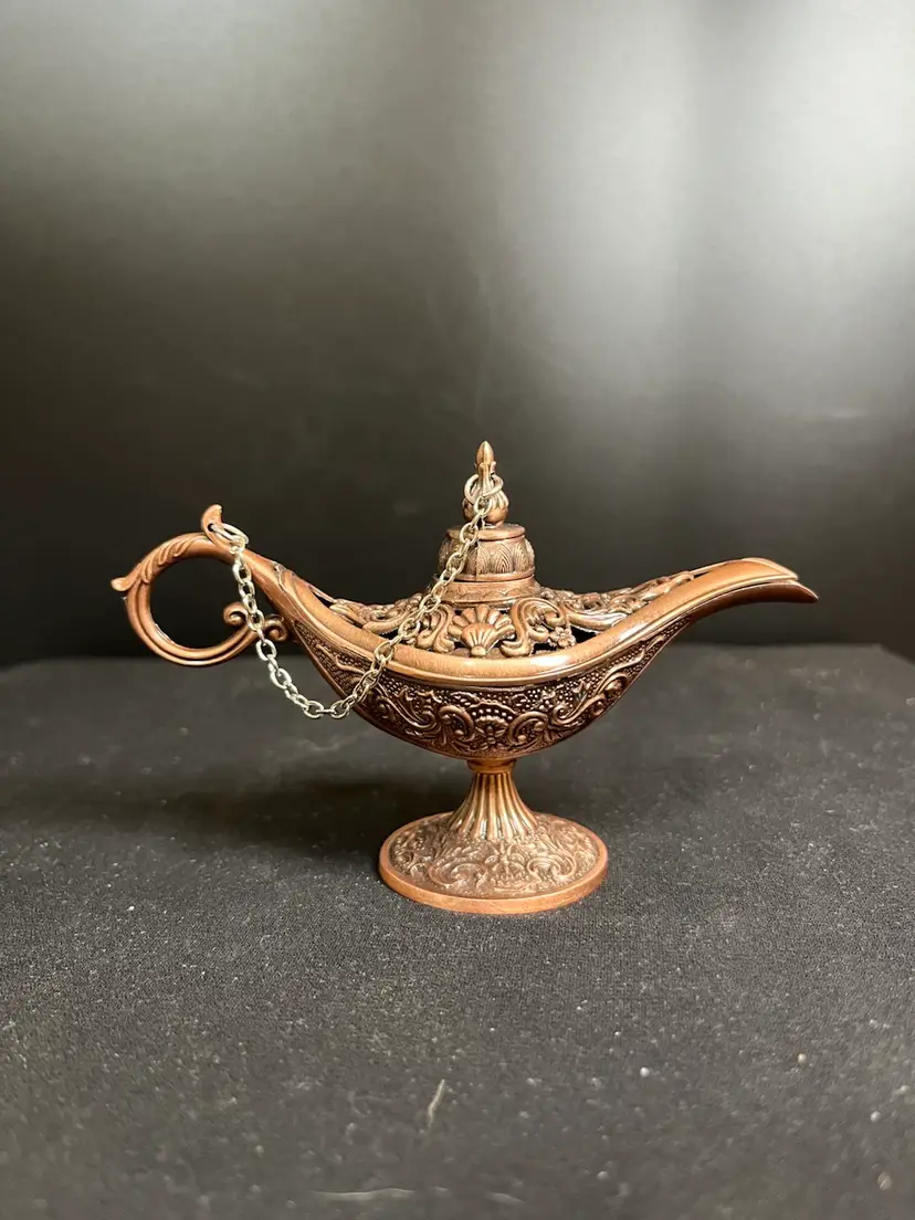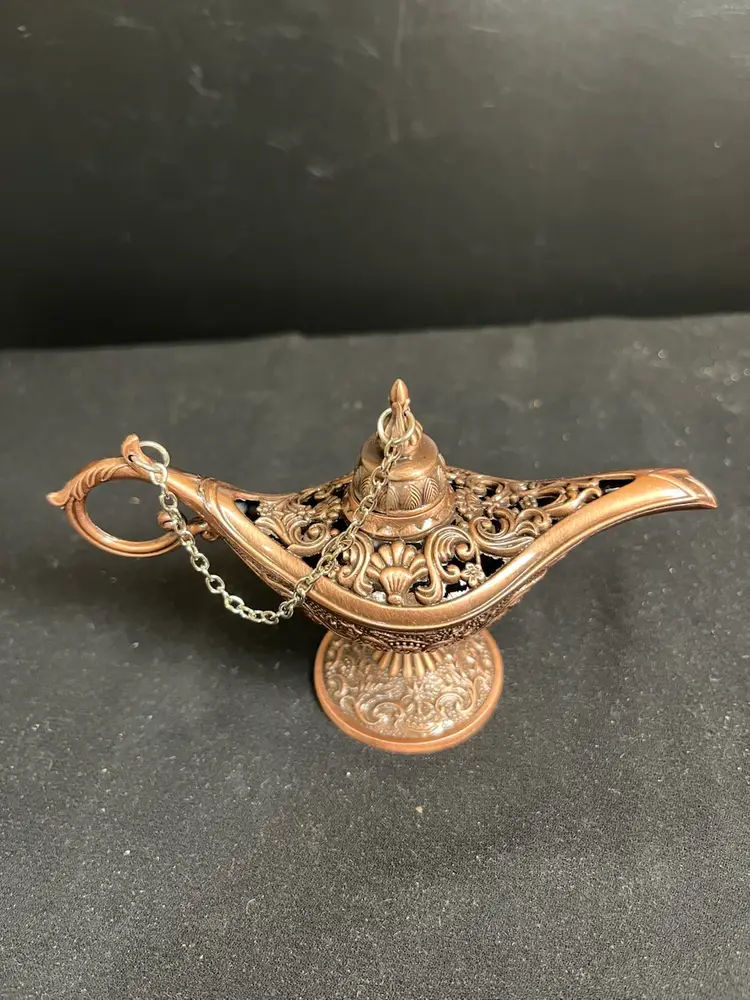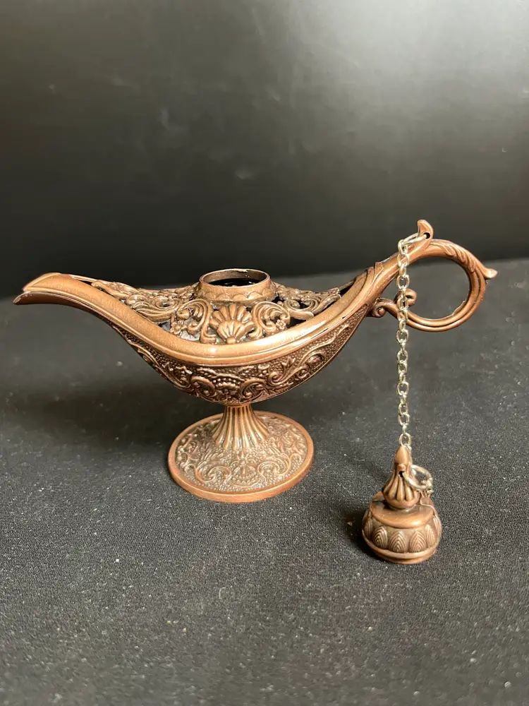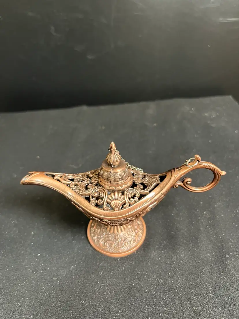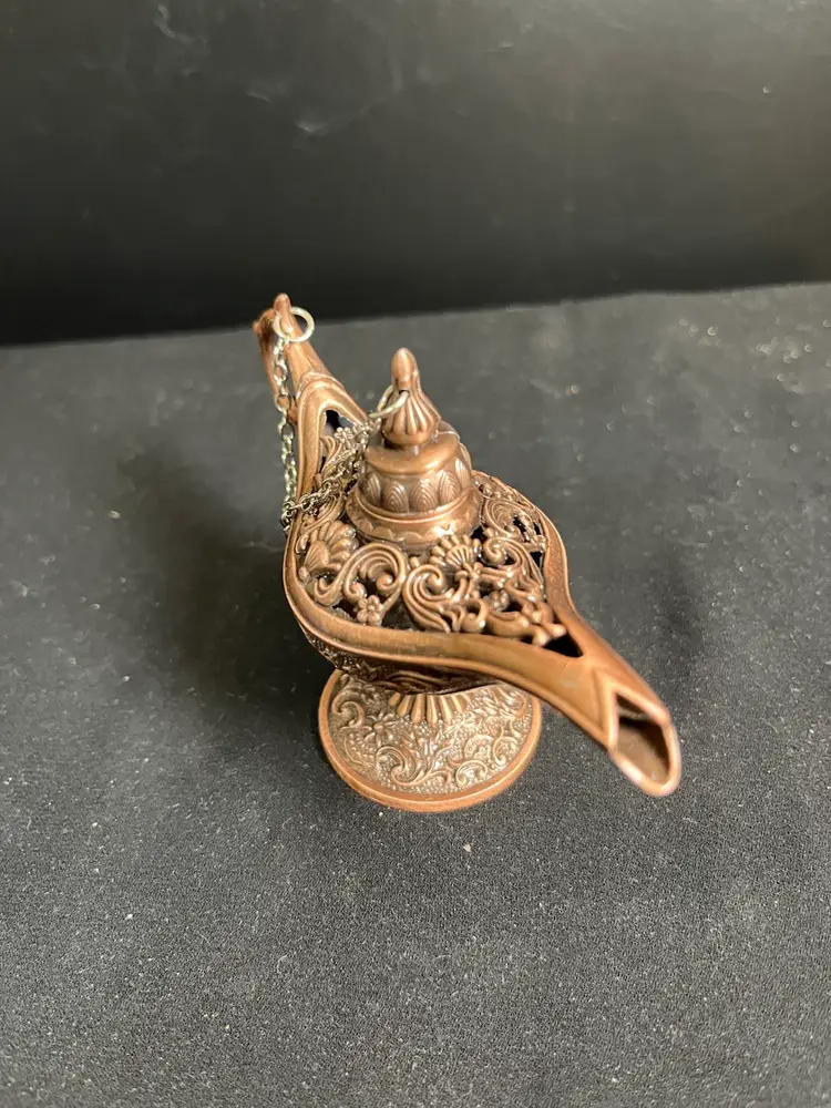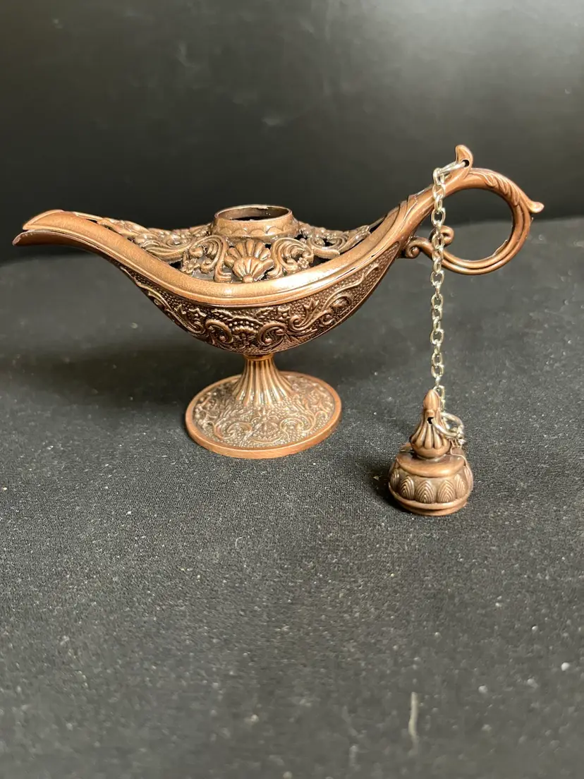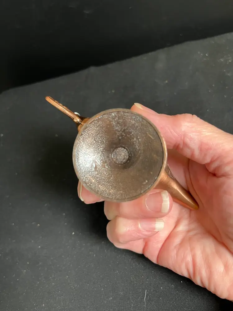 Lid has a chain that attaches to handle. Very nicely crafted. Is in great vintage condition. Measures approx 3" x 5", 2.3 Oz