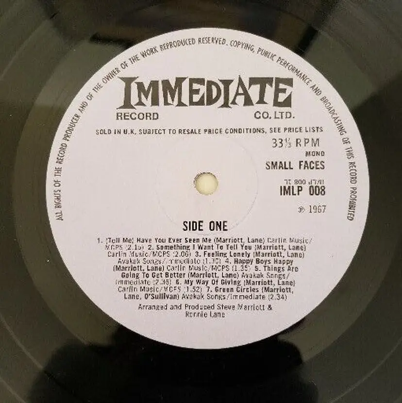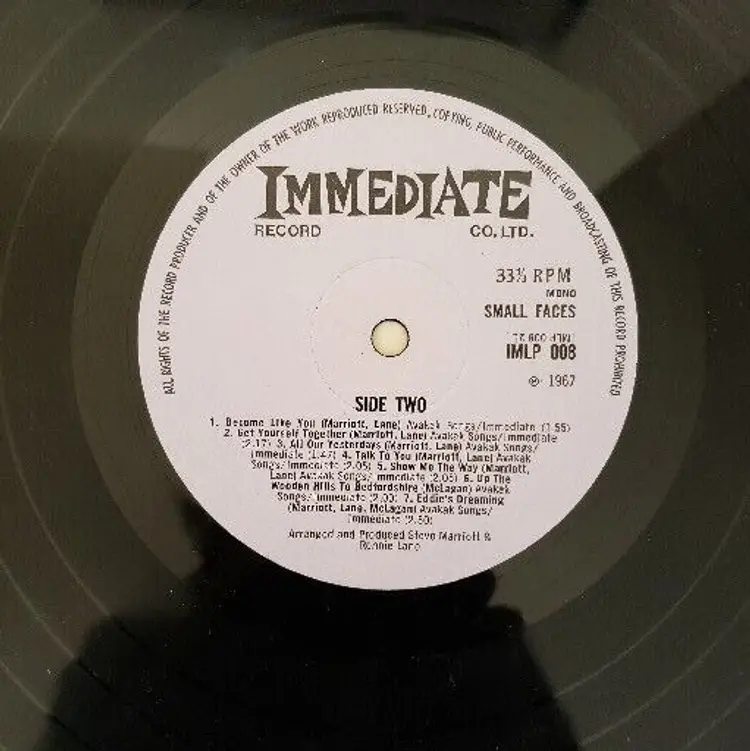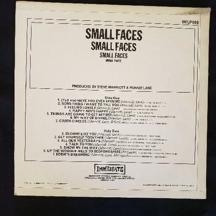 Artist: Small Faces Speed: 33 RPM Record Label: Immediate Release Title: Small Faces Case Type: Cardboard Sleeve Color: Multicolor Material: Vinyl Inlay Condition: Good Plus (G+) Type: LP Format: Record Record Grading: Very Good Plus (VG+) Release Year: 1967 Sleeve Grading: Good (G) Record Size: 12" Style: 1960s, British Invasion, Mod, Psychedelic Rock Genre: Rock Country/Region of Manufacture: United Kingdom Number of Audio Channels: Mono