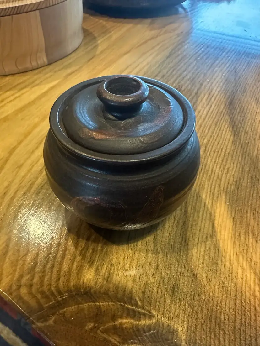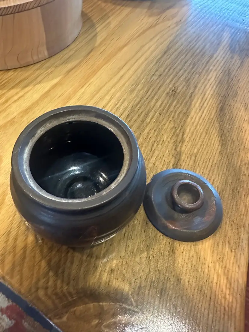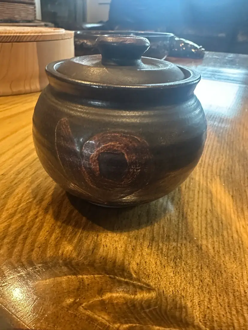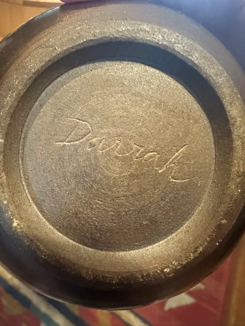 Signed, Appx 3.5 inches. In great shape other than the very small flea bite in lid.