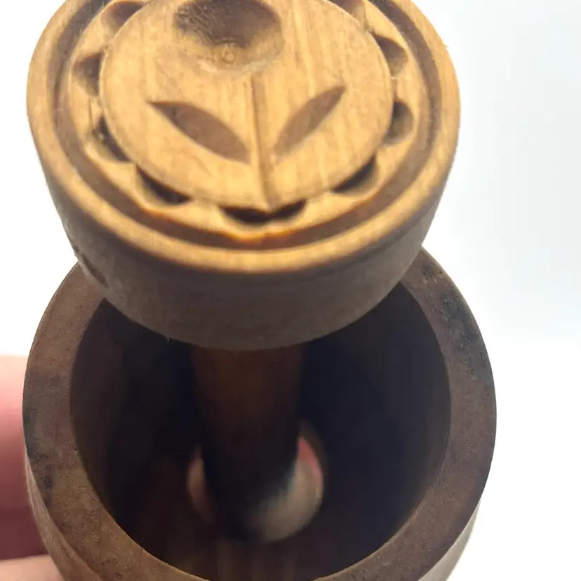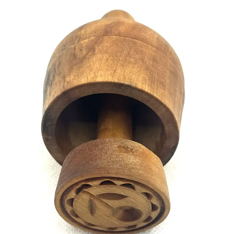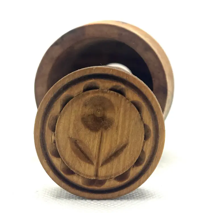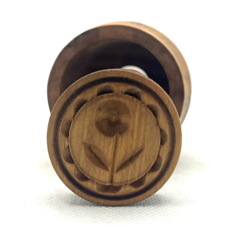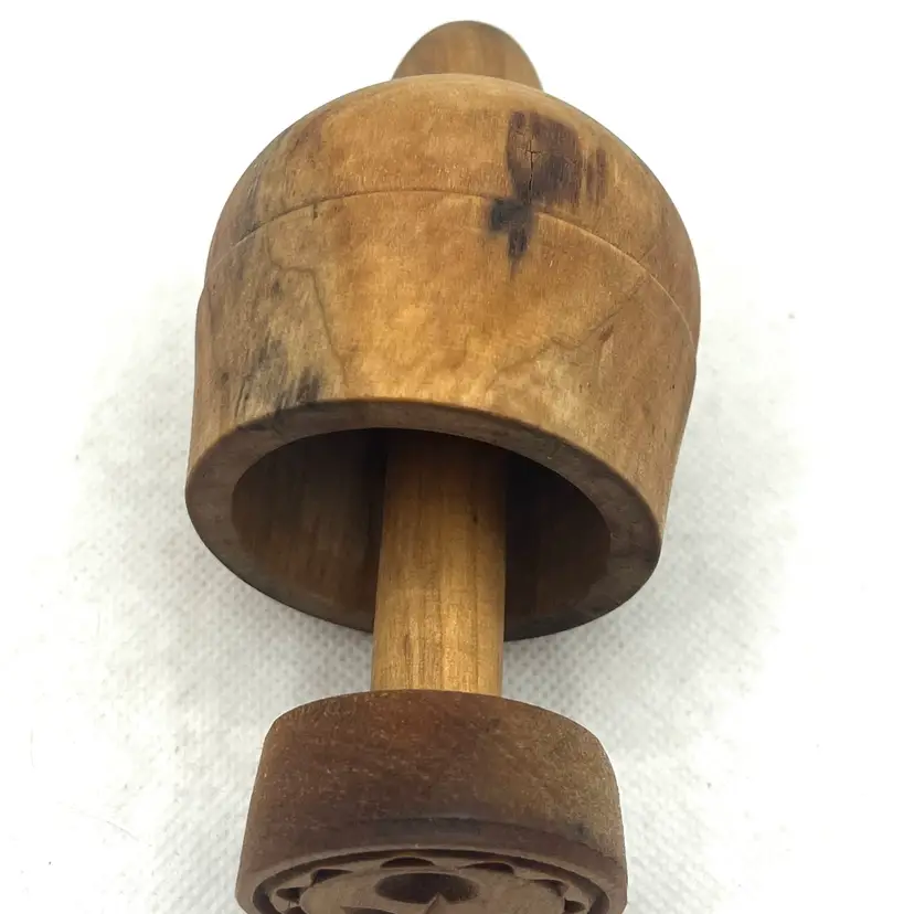 This item is an antique wooden butter mold, commonly used in the 19th century to shape and decorate butter. Used to mark butter with a unique design before it cooled and hardened. Constructed from wood, often cherry, maple, or poplar. Features a hand-carved stamp on a plunger to imprint a floral pattern. The mold was typically soaked in ice water before use to prevent the butter from sticking. Stands 5” with natural aged patina and wear.