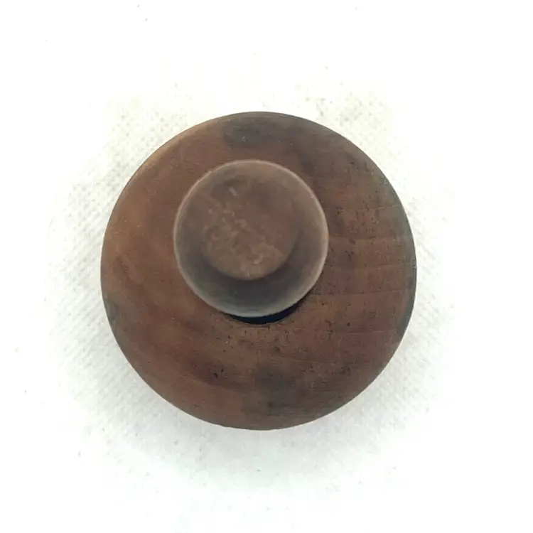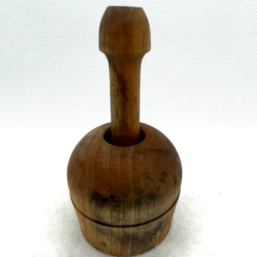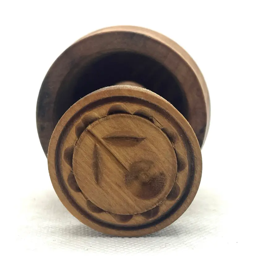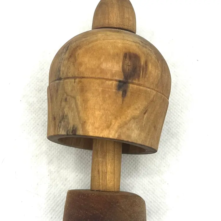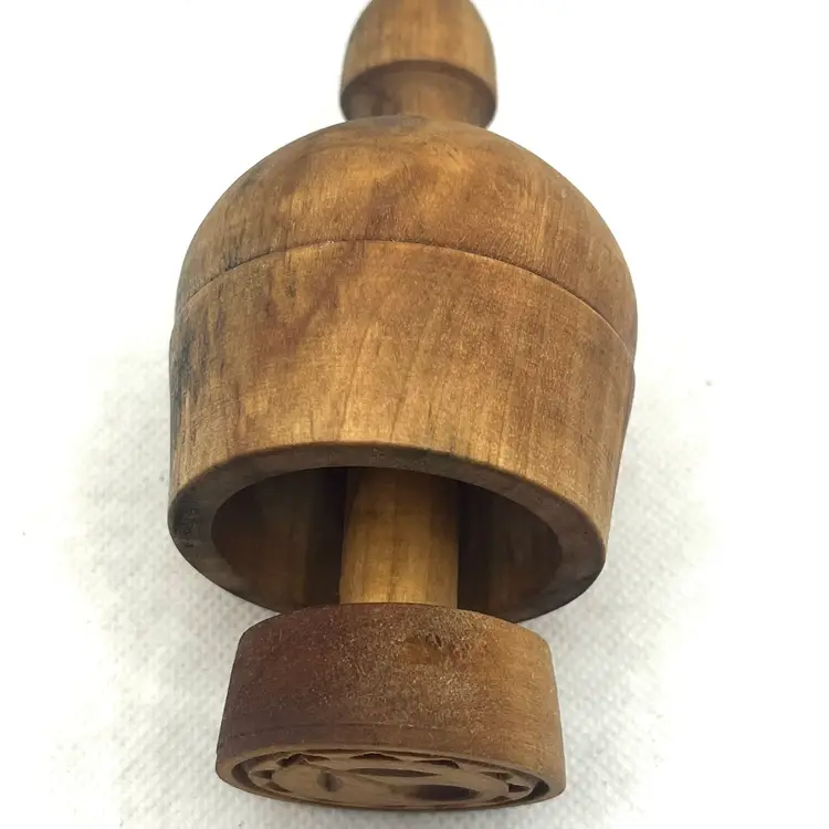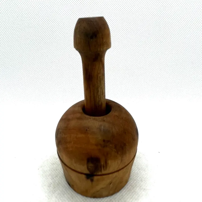 This item is an antique wooden butter mold, commonly used in the 19th century to shape and decorate butter. Used to mark butter with a unique design before it cooled and hardened. Constructed from wood, often cherry, maple, or poplar. Features a hand-carved stamp on a plunger to imprint a floral pattern. The mold was typically soaked in ice water before use to prevent the butter from sticking. Stands 5” with natural aged patina and wear.