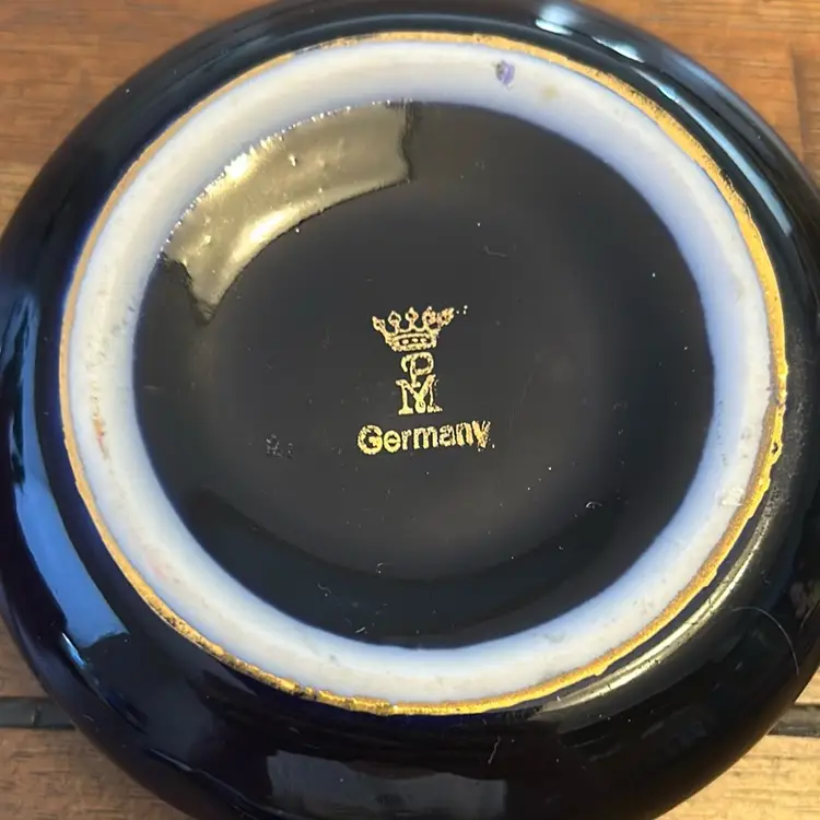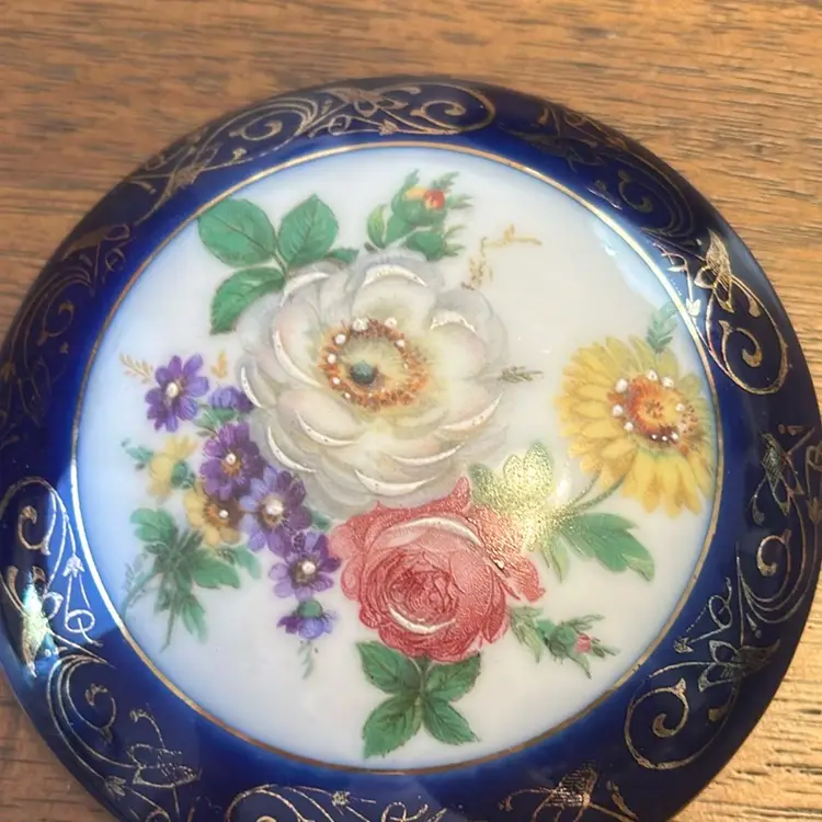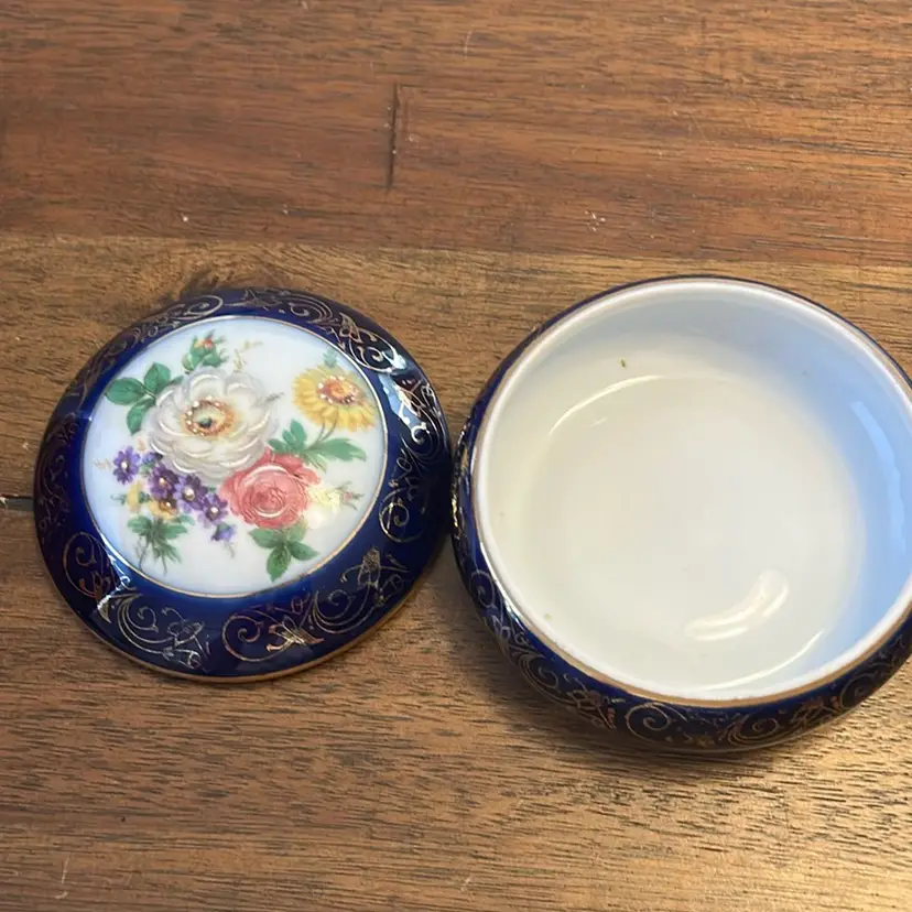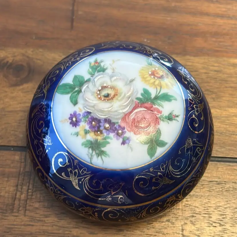 This hand painted trinket dish has a lid and is from Germany. It is about 2” tall and 3.5” wide.
