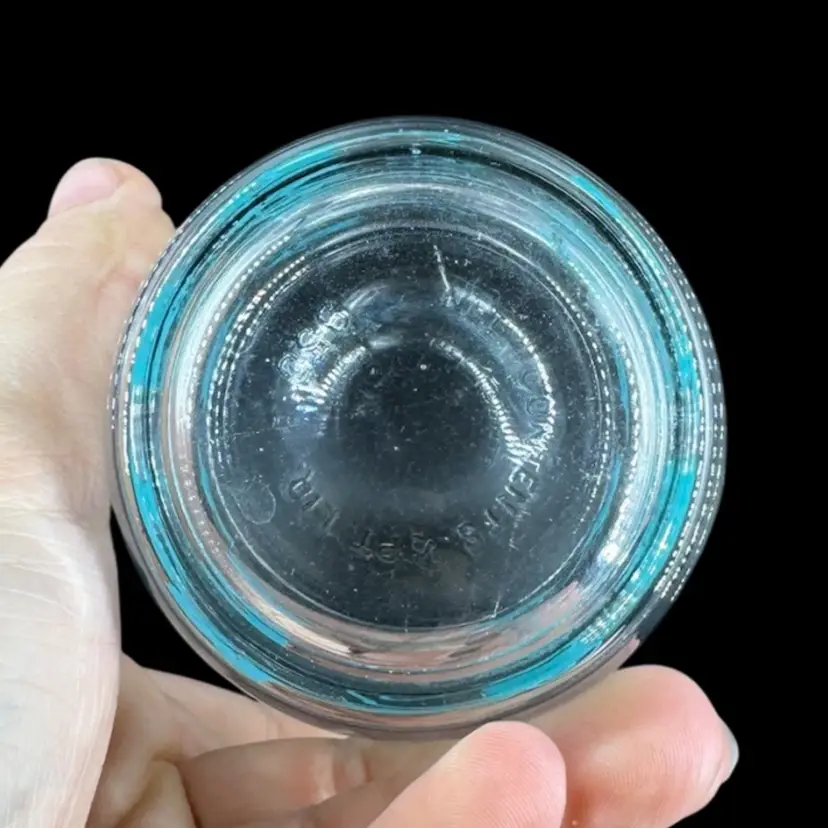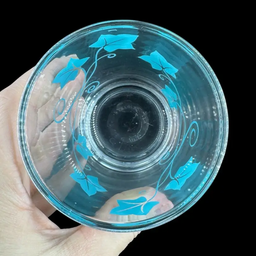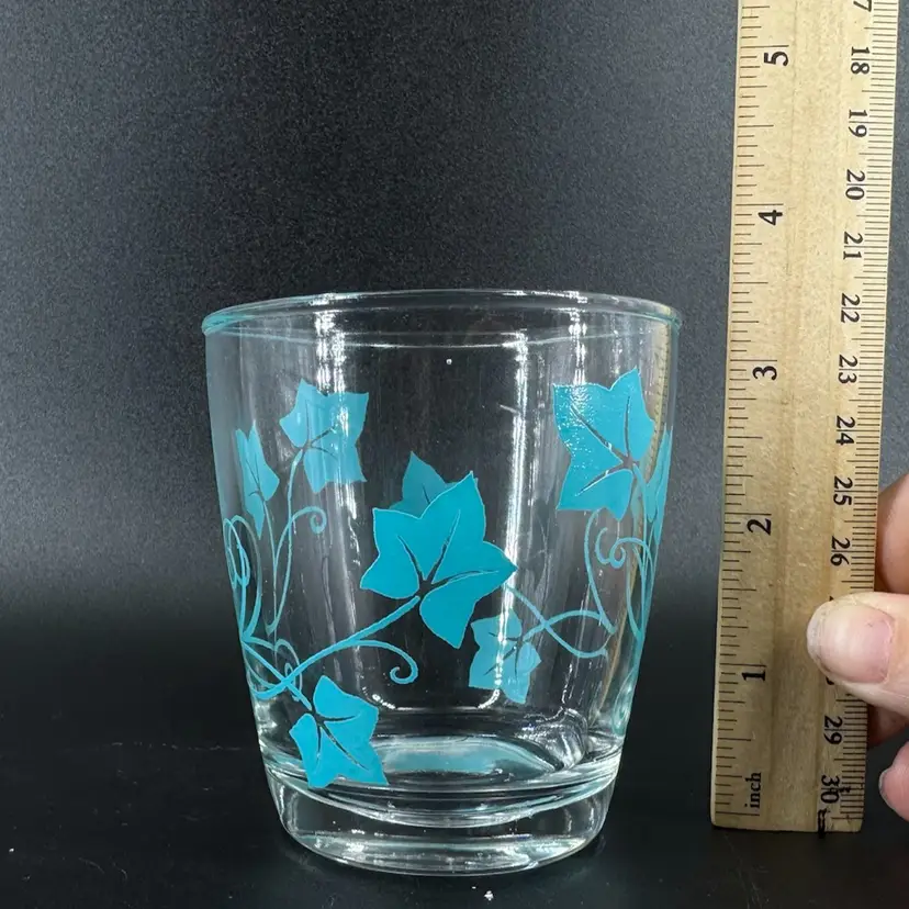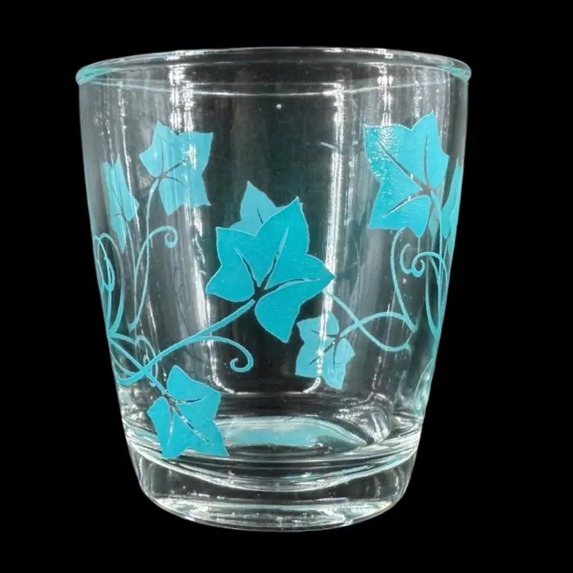 Small glass juice cup featuring blue printed vines. No wear detected on the print. Made of thicker glass with a thicker base. No chips or cracks in glass. Slight small scratching due to usage. No signatures or markings. Cup measures approximately 3.5” tall and 3” wide.