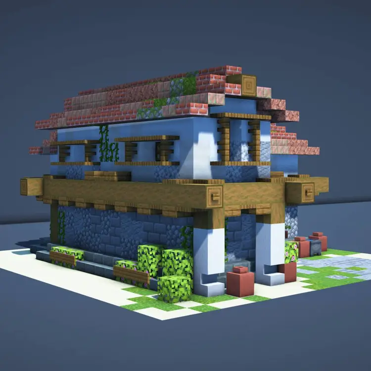 Key feature(s): • Mossy brick roof • Hefty stripped spruce support beams • Mediterranean architecture