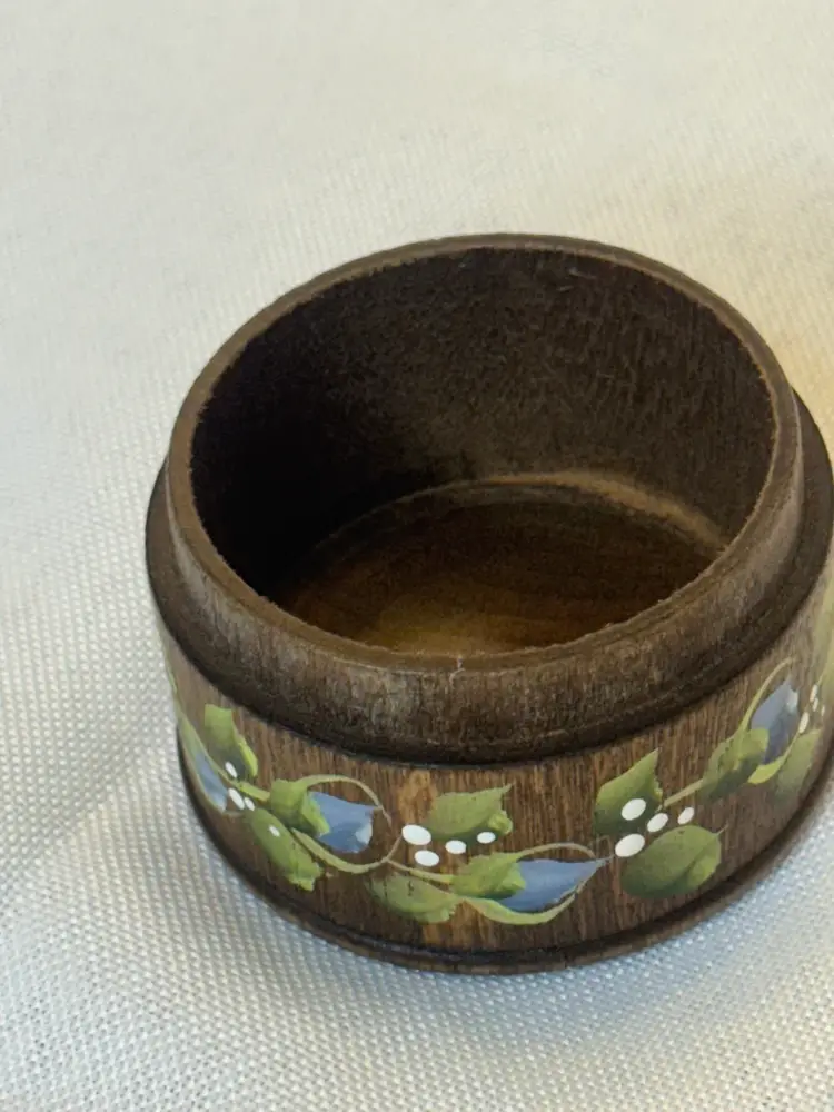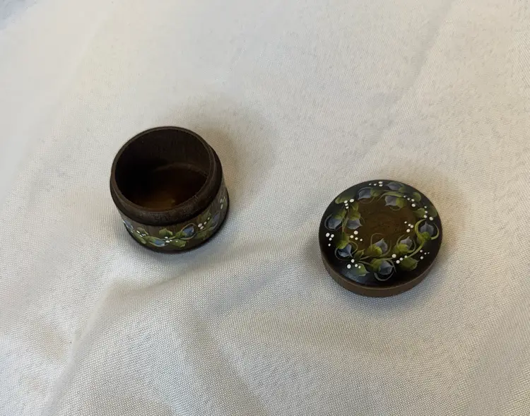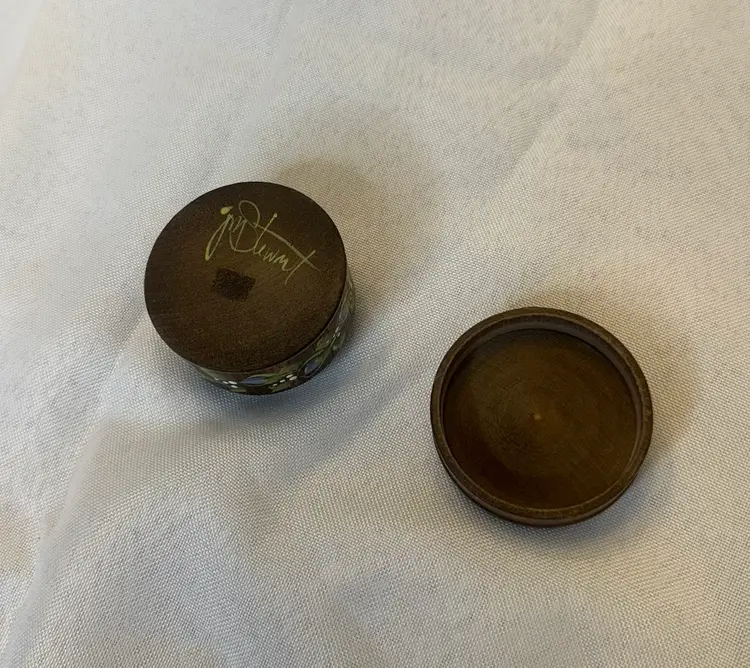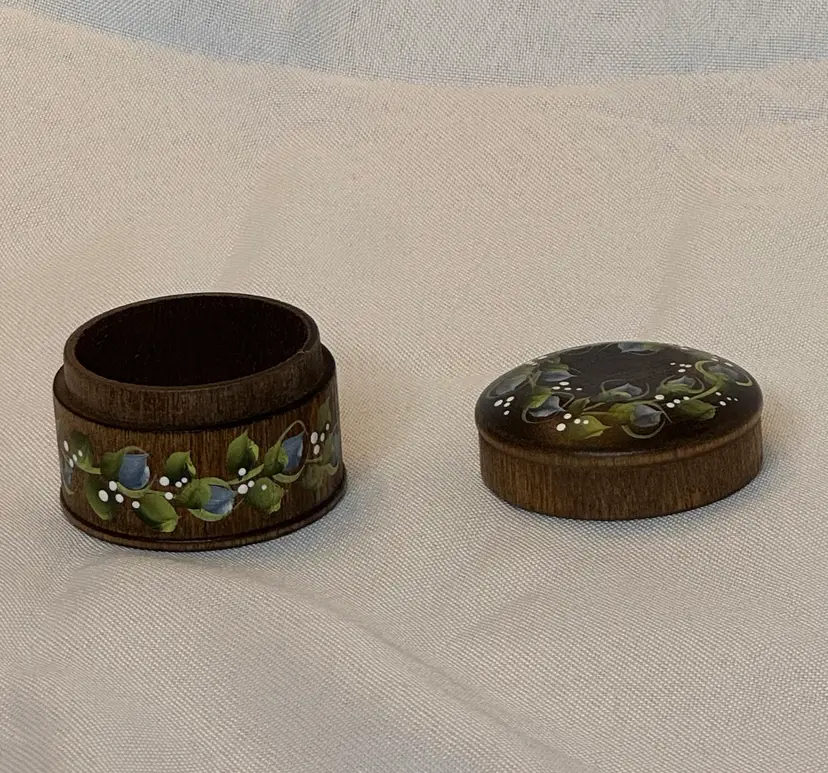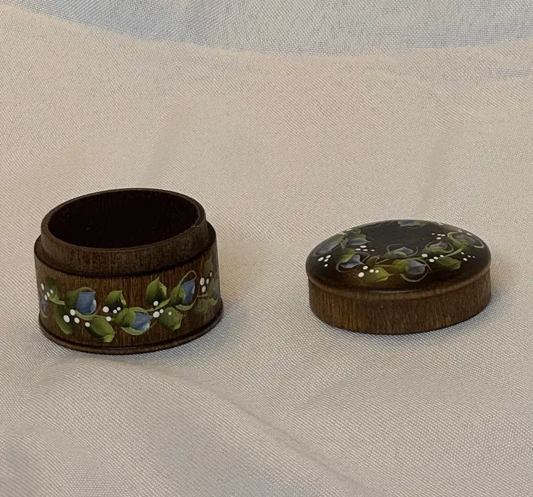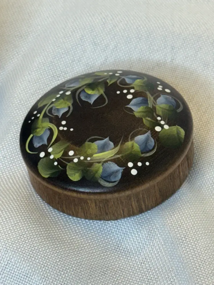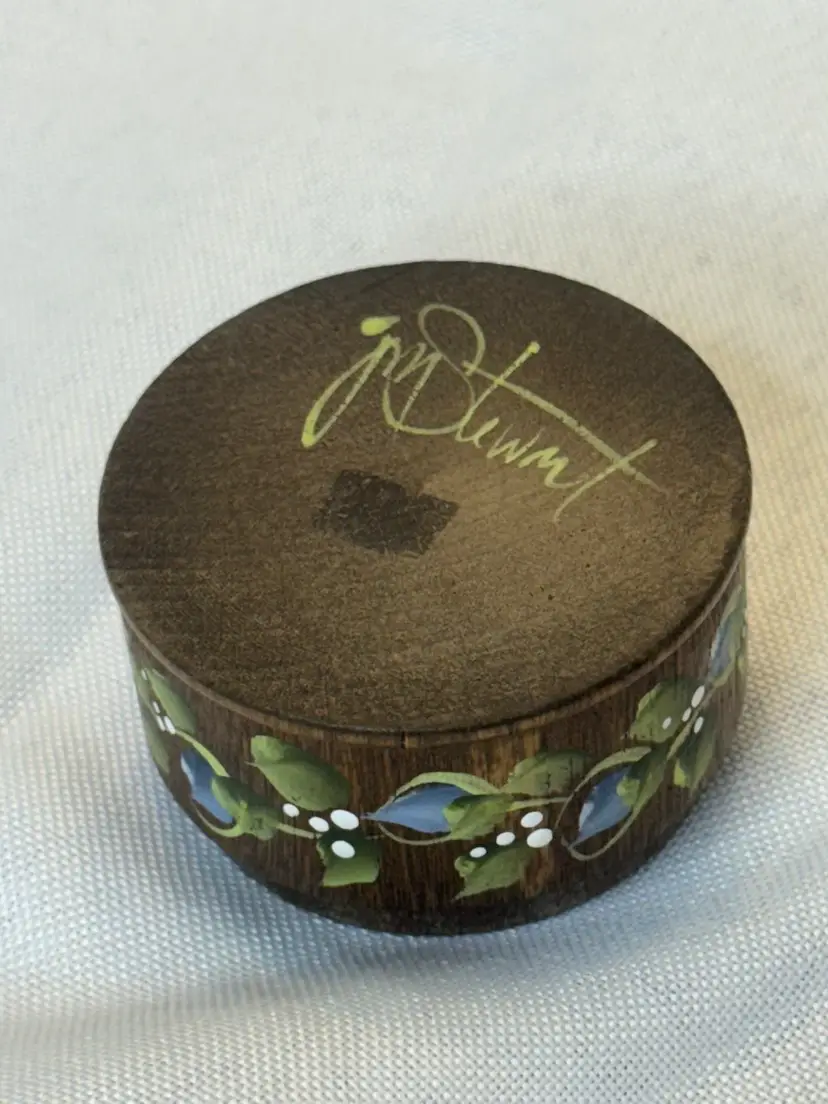 This lovely hand-painted wooden trinket box has a floral tole design in a folk art style. It is signed Jim Stewart and is 1.5” in height; 2.5” diameter.