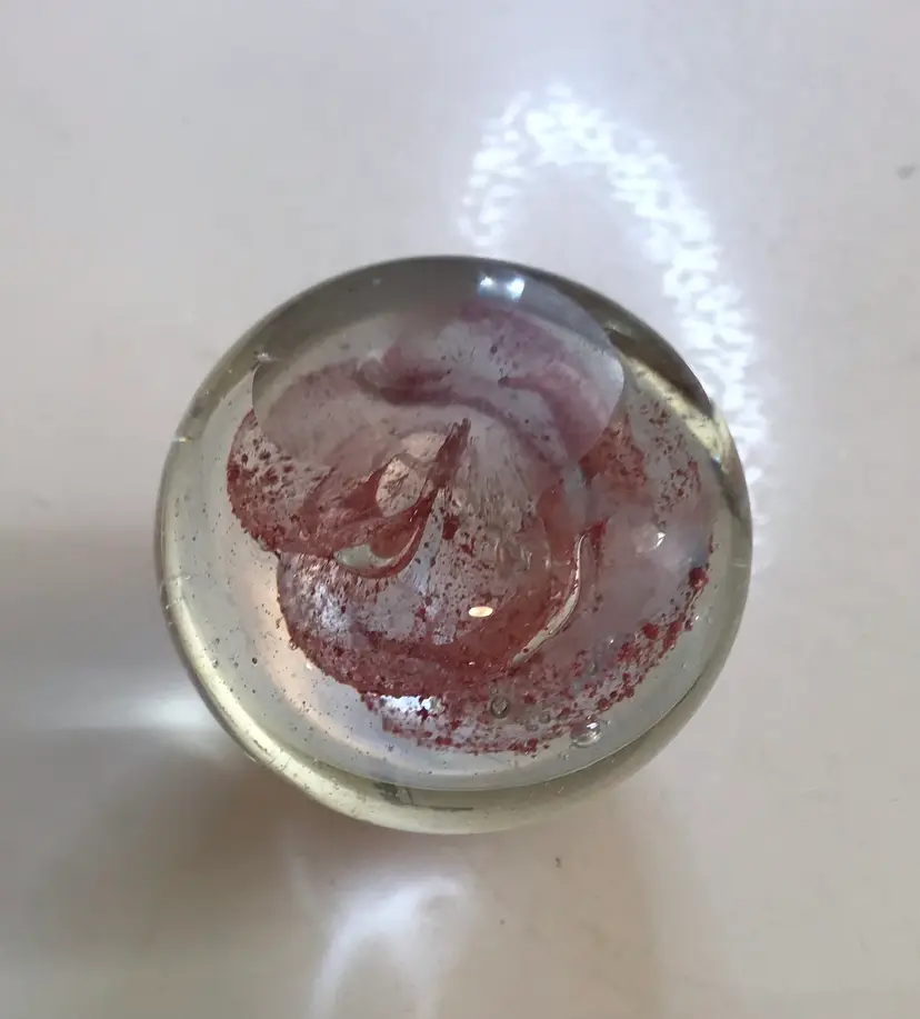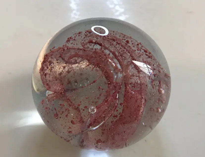 This is a hand-blown art glass paperweight, possibly in the Murano style, featuring a hot pink swirl design with controlled bubbles. It is a collectible item, often used for decorative purposes in homes or offices. The design is encased in clear glass. Slight cloudiness on bottom. small bruise or imperfection on the bottom