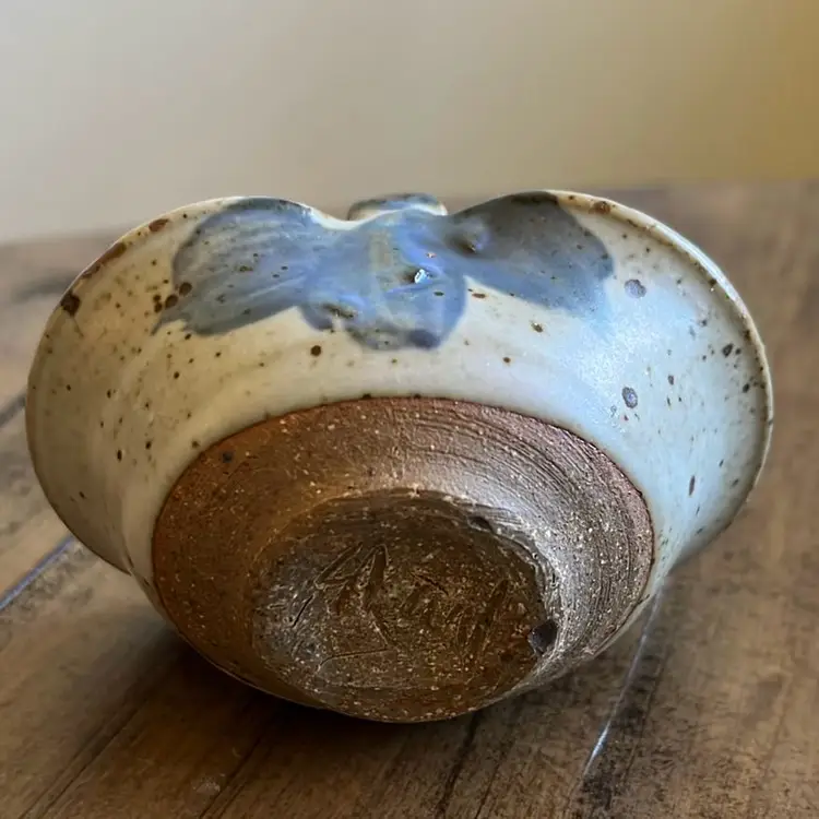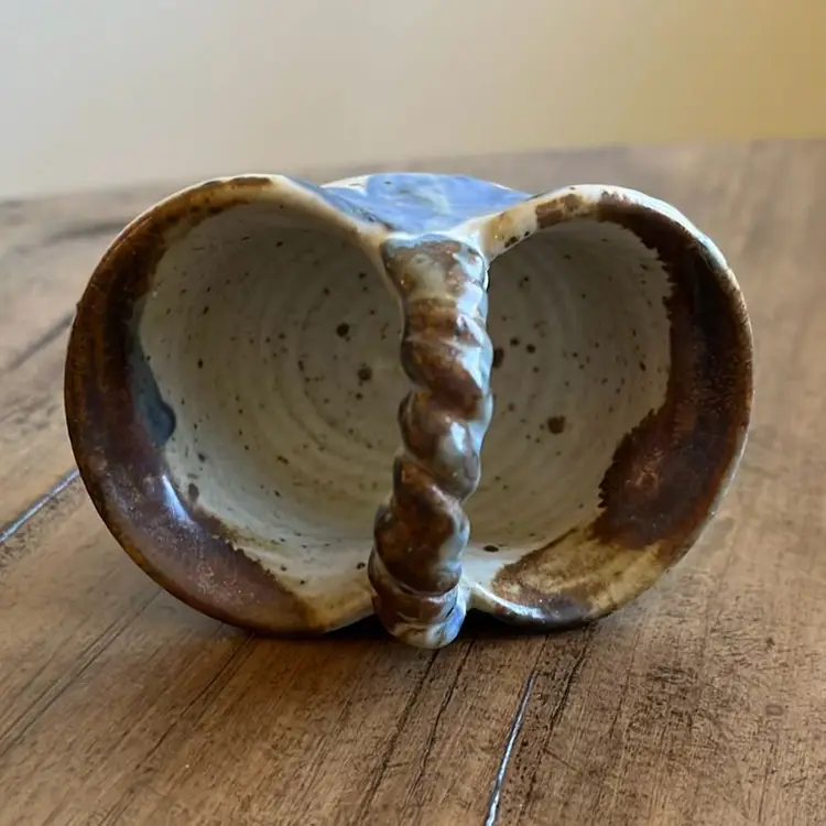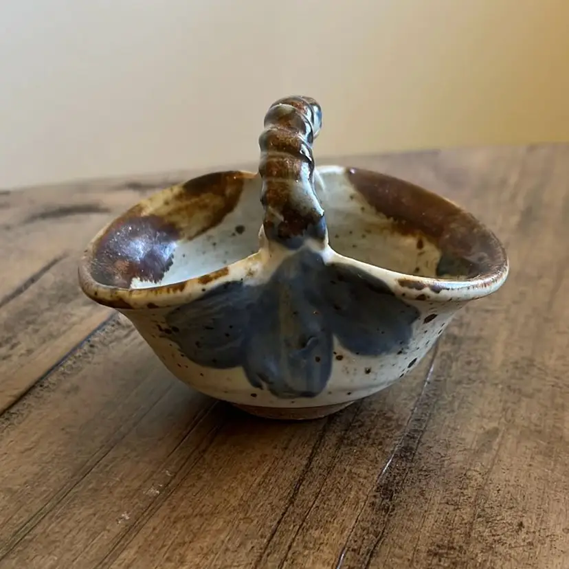 Small handmade pottery basket signed by the artist. Measures 3” tall by 3 1/2” wide.