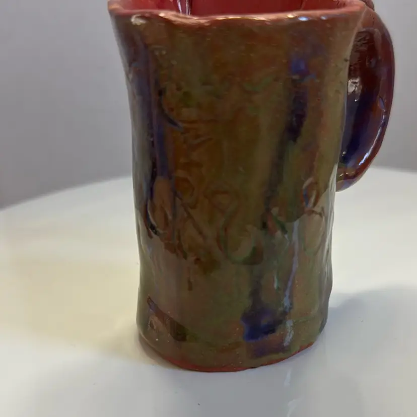 Cute child made miniature mug. Measures 3 1/4 inch tall. Great colors and would be awesome used as a small vase.