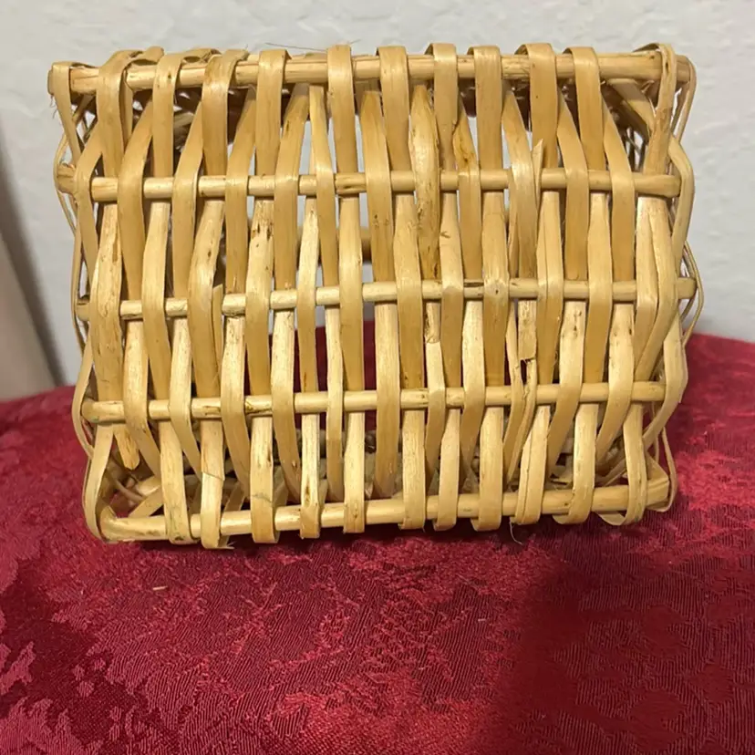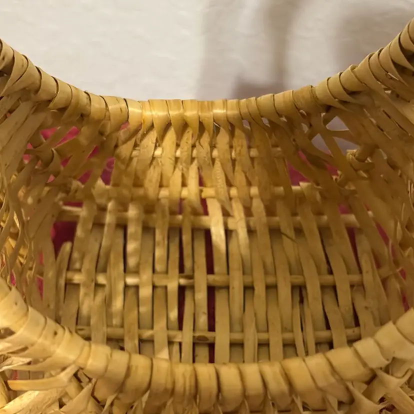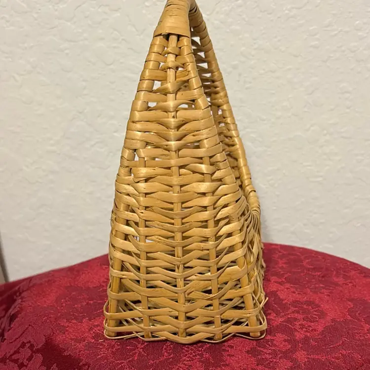 This is a vintage woven rattan or wicker wall basket. The basket is hand-woven from natural materials like wicker. It is designed with a flat back to hang on a wall or door. The item has an integrated handle for easy carrying or hanging. It is often used for home decor, such as holding flowers, plants, or small items. Small: 5"x4"x8.5"