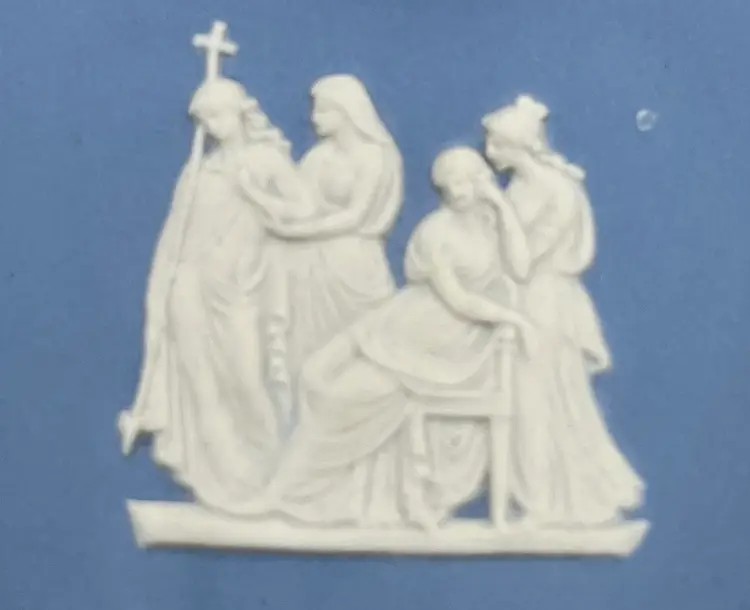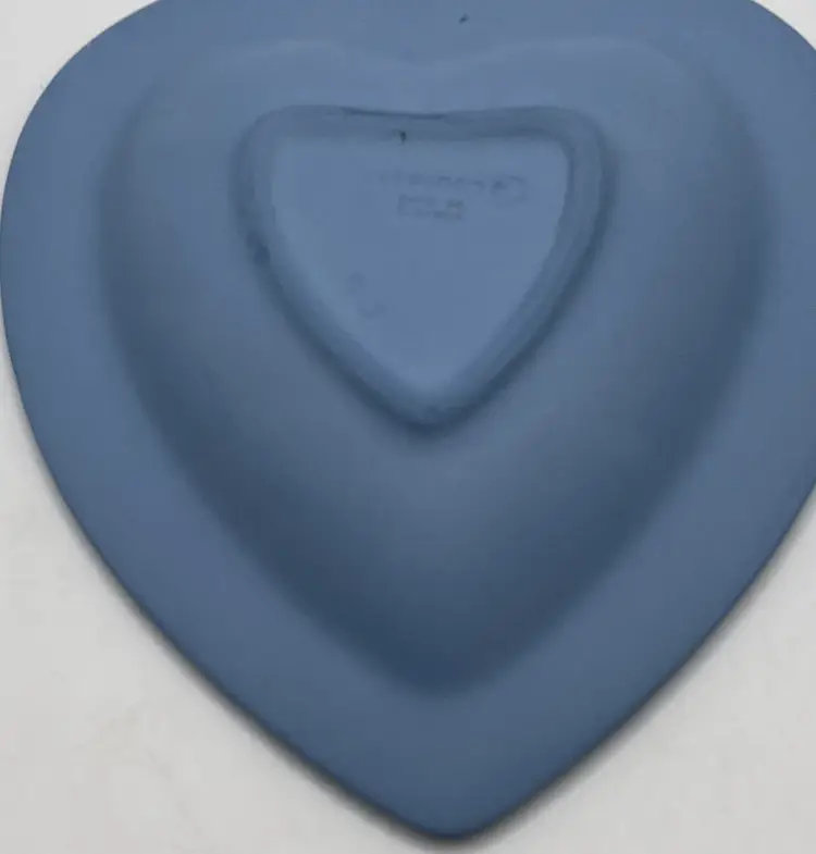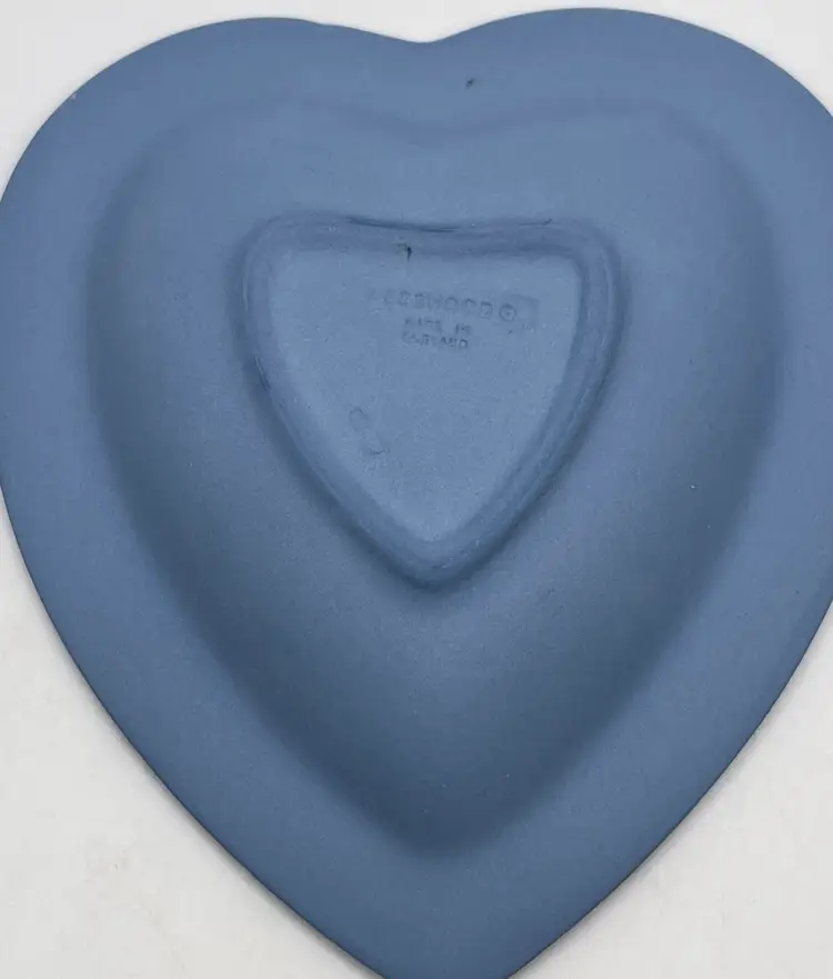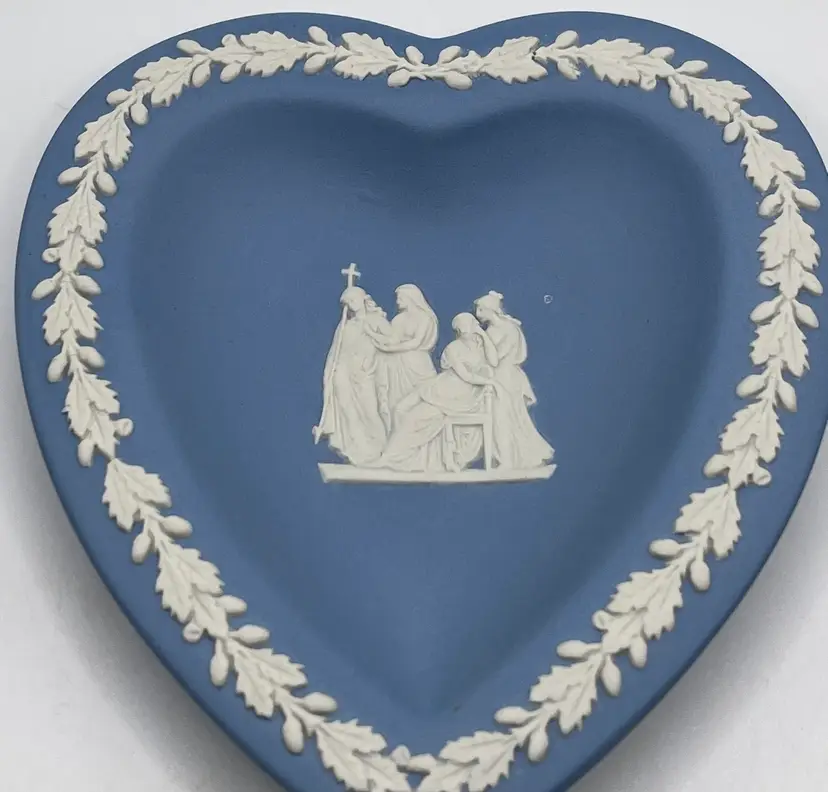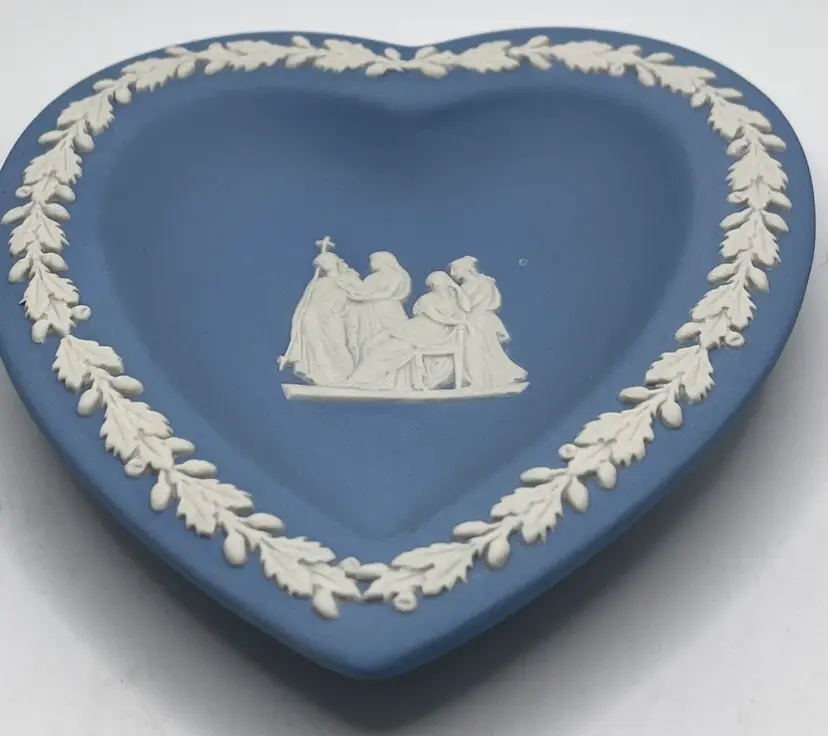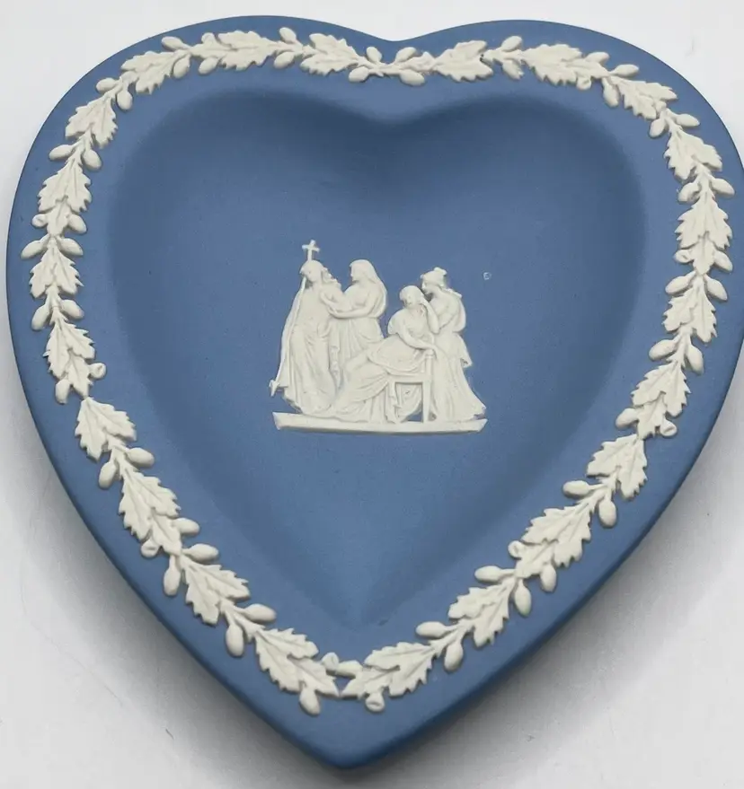 The heart shaped dish is Wedgewood jasperware featuring the design called the procession. It depicts four rope figures carrying a staff cross and was produced in England around the 1950s. What would Jasper wear is known for its matte unglazed finish and often features classical or neoclassical motives in bas-relief. The color of the dish is Wedgewood blue a shade that required extensive experimentation to achieve excellent use condition.4.25x 4.75
