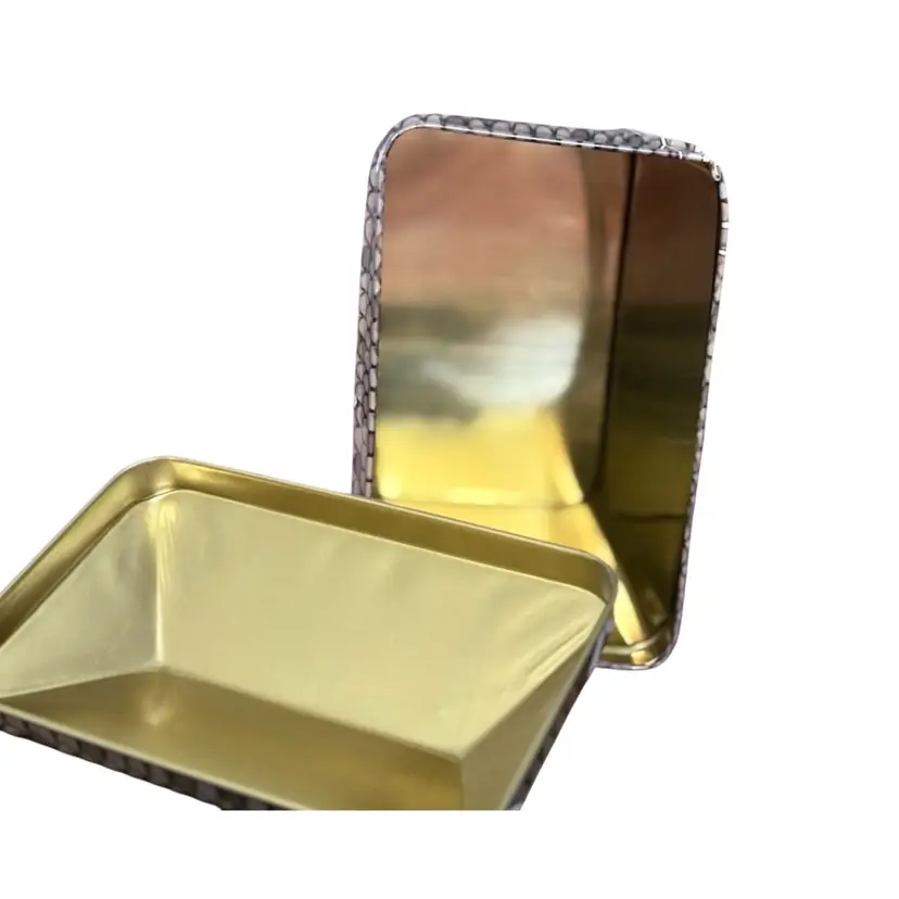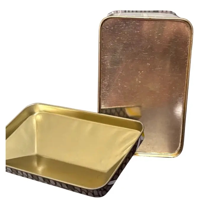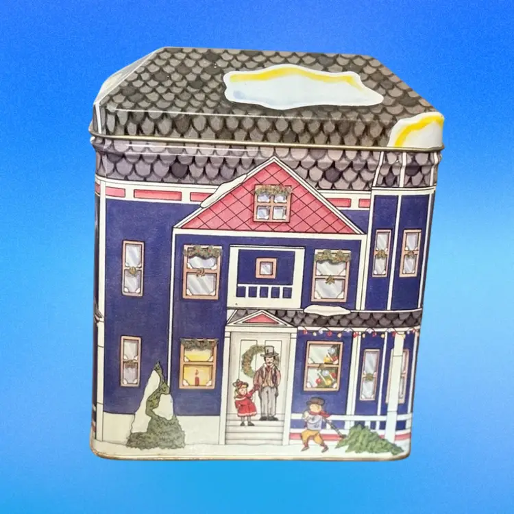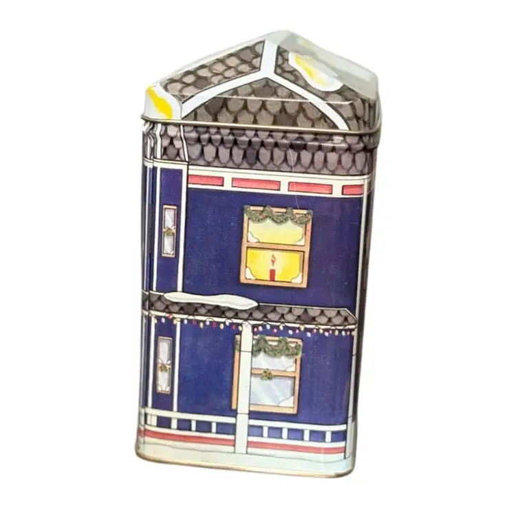 Small tin shaped like a mostly blue house Decorated for Christmas and snow on the ground 6.5 x 4.5 x 3