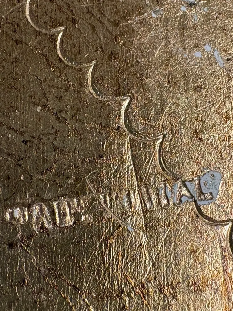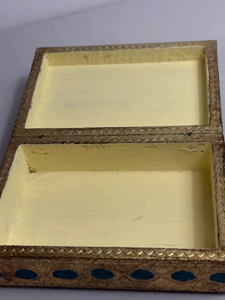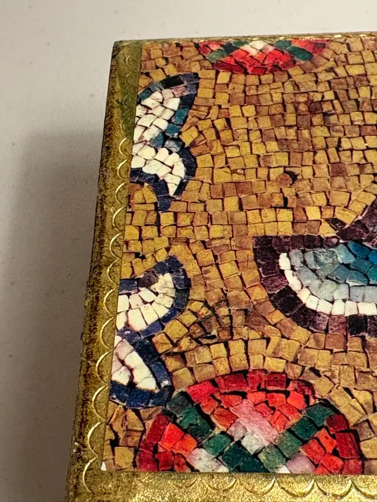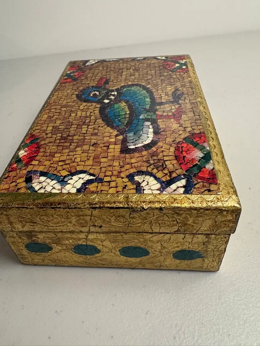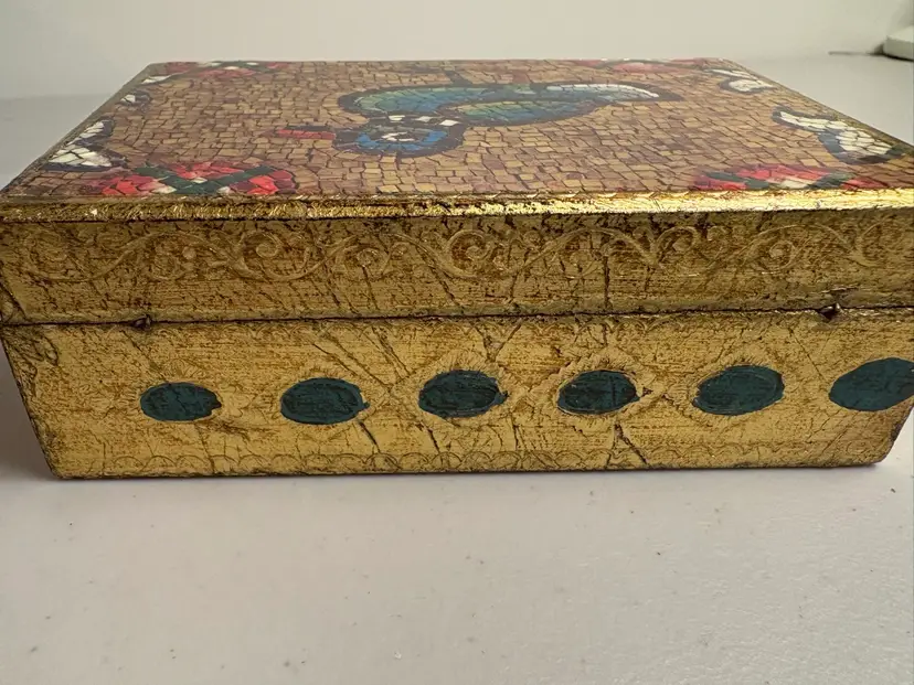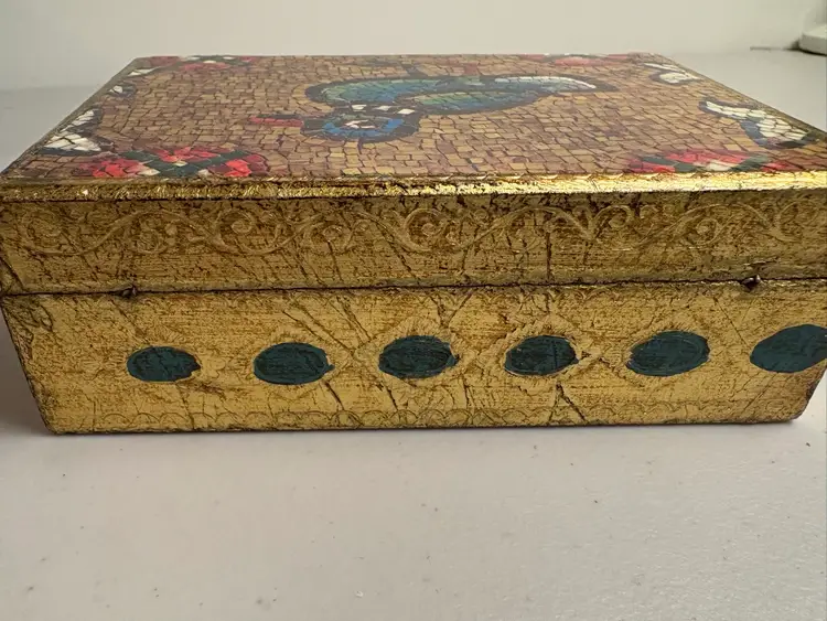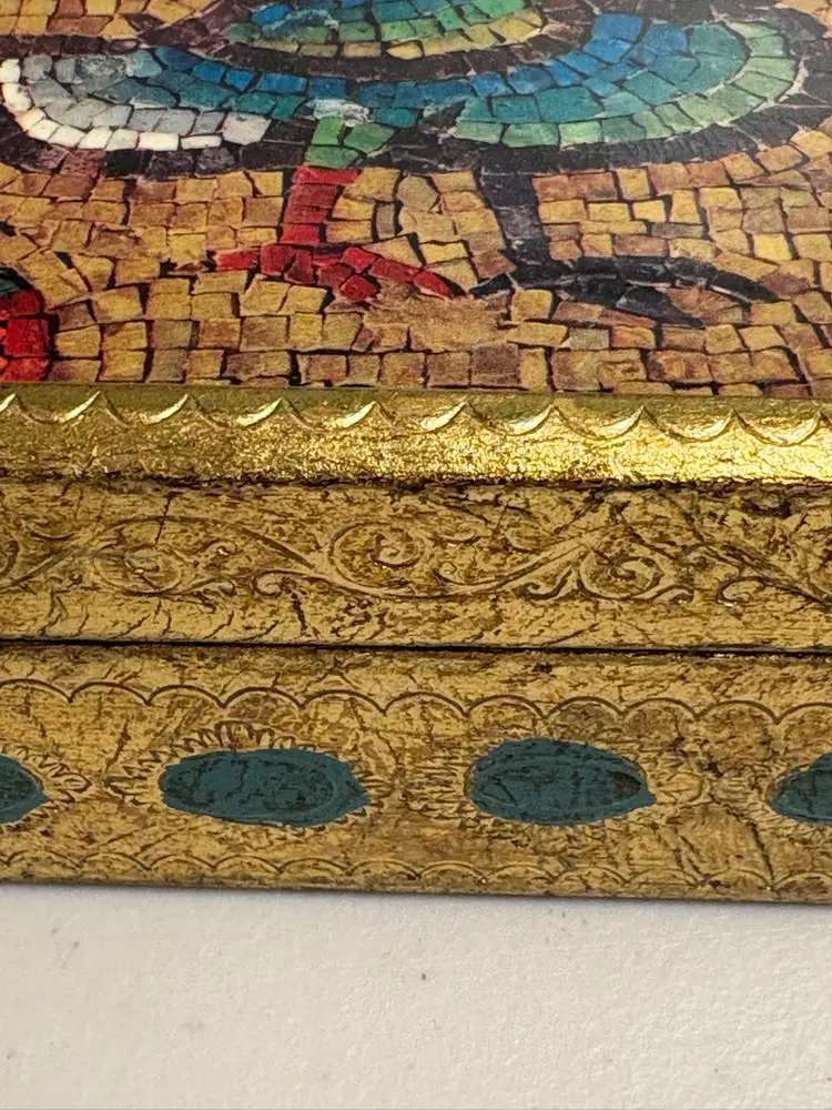 This small Italian Florentine box with a mosaic duck design is a decorative trinket box made of wood with a gold color finish. The intricate duck design adds a unique touch to the piece, making it a collectible item perfect for displaying small treasures or jewelry. The Italian style and mosaic pattern give it a charming and elegant look, making it a stand-out piece in any collection or decor setting.