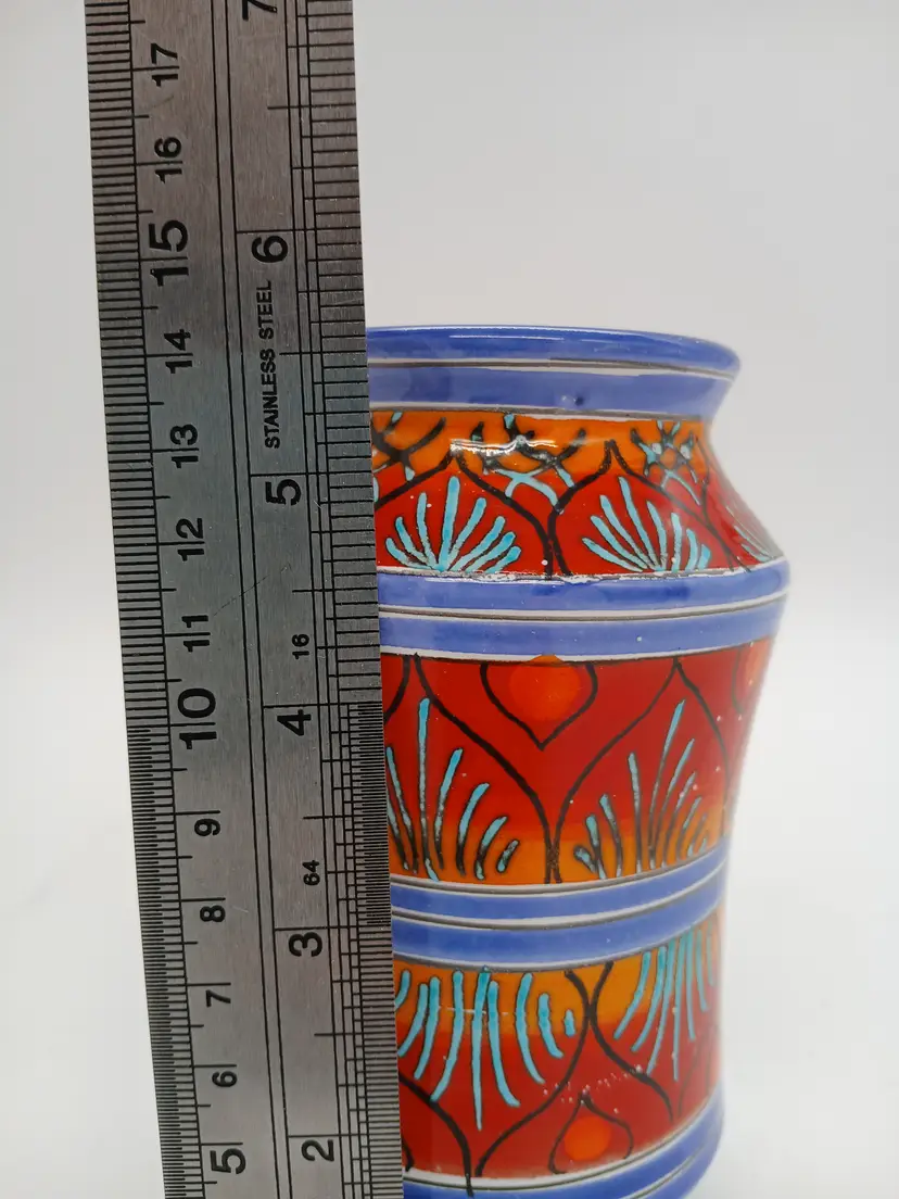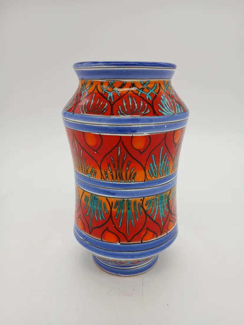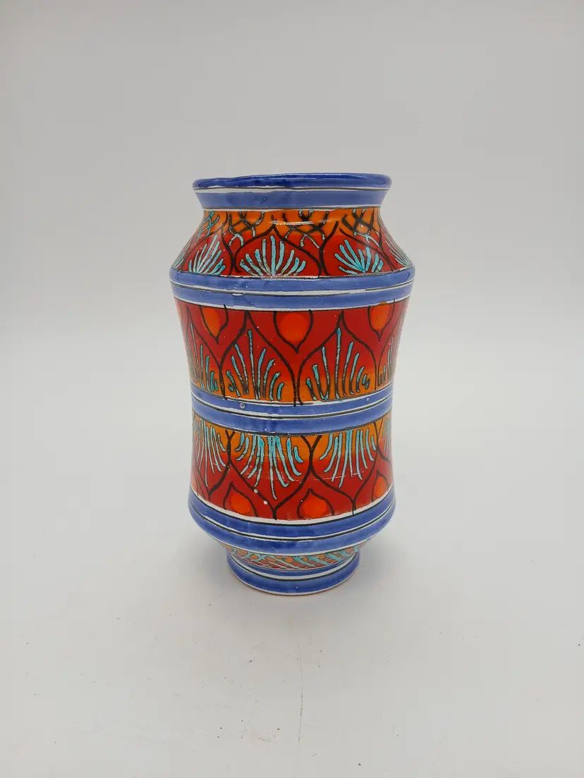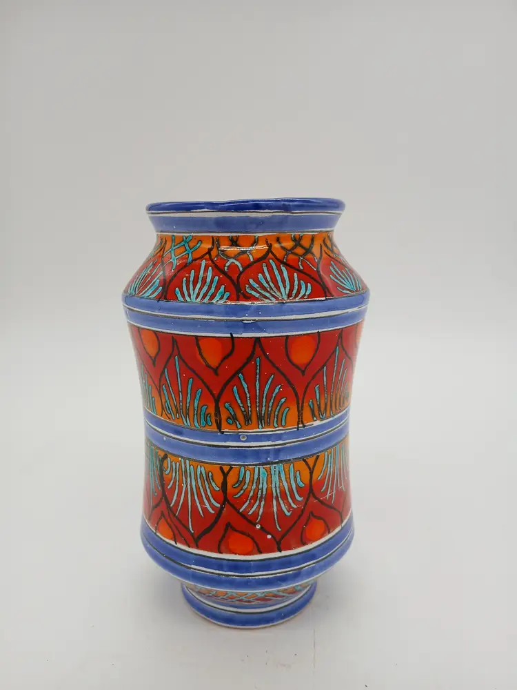 Beautiful red and blue pottery vase signed by G. Pallo. All over geometric design. About 5.5" tall. Love the colors, love the shape!