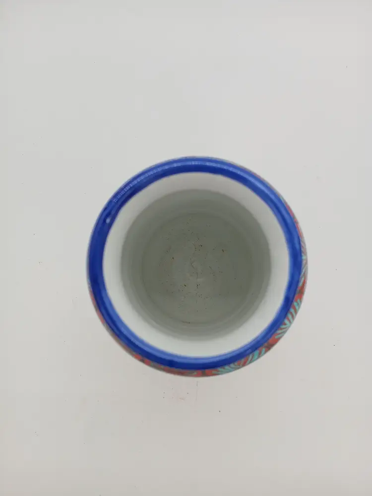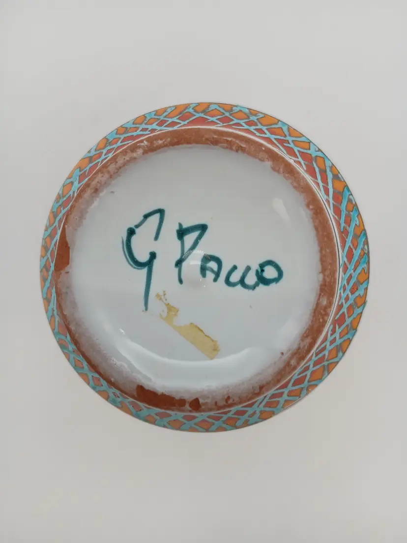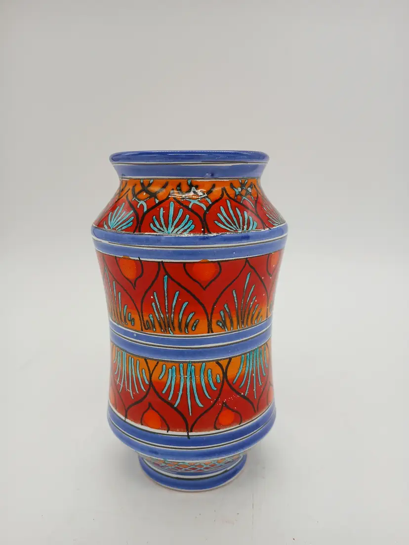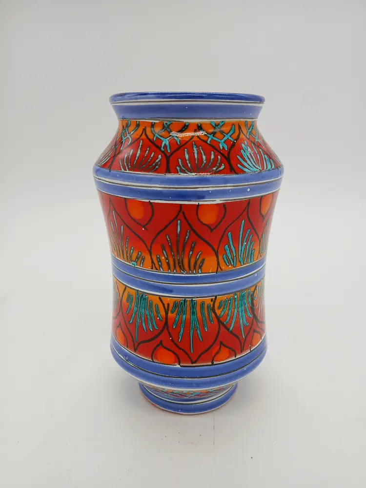 Beautiful red and blue pottery vase signed by G. Pallo. All over geometric design. About 5.5" tall. Love the colors, love the shape!