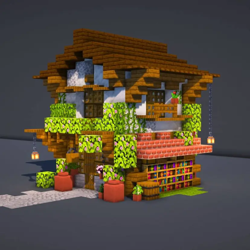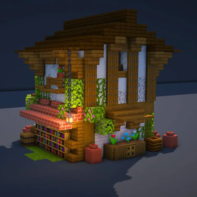 Key feature(s): • Outdoor bookstore browsing area • Messy overgrown plants • Balconies on three different sides