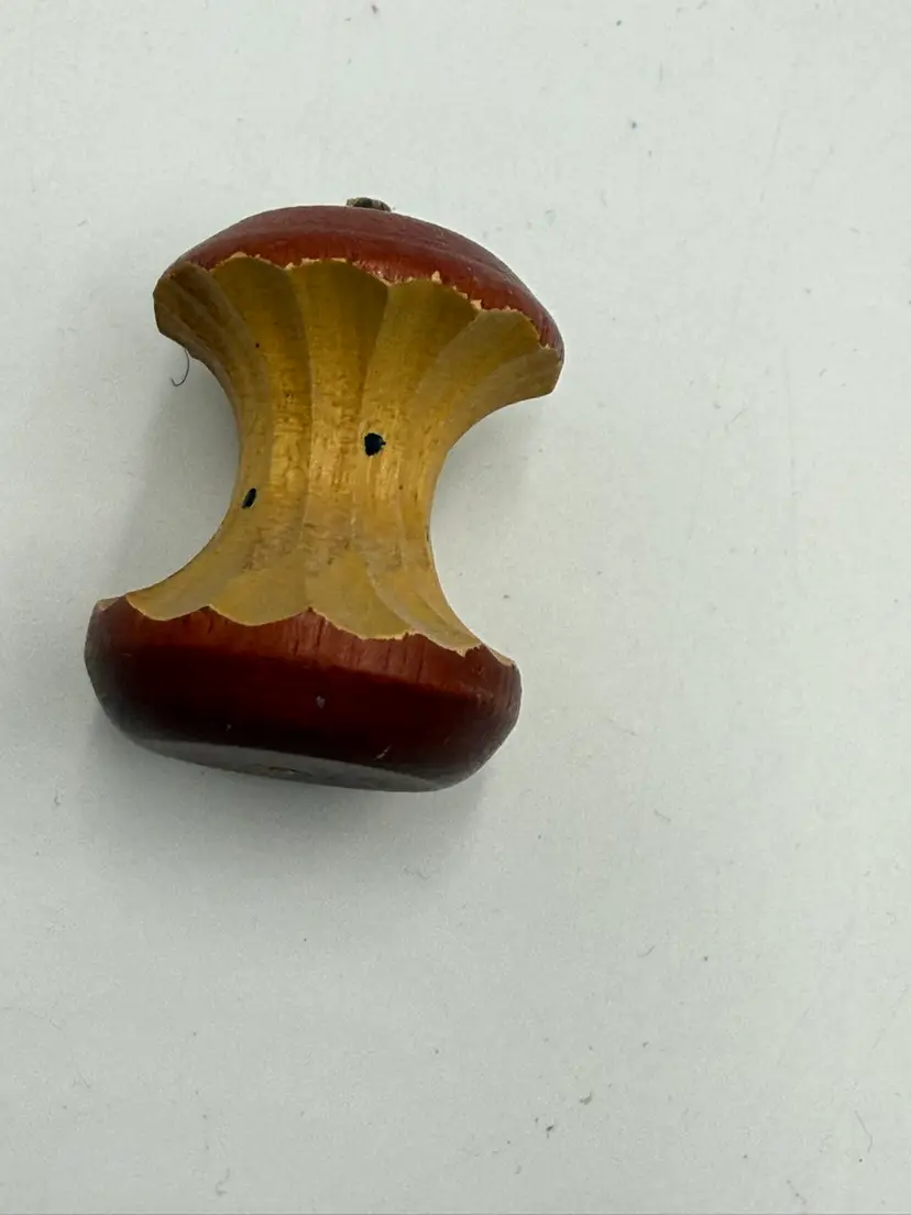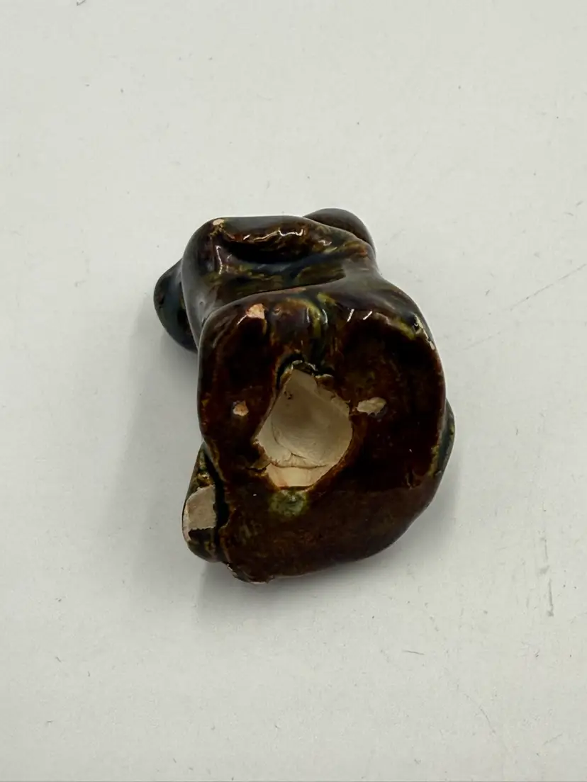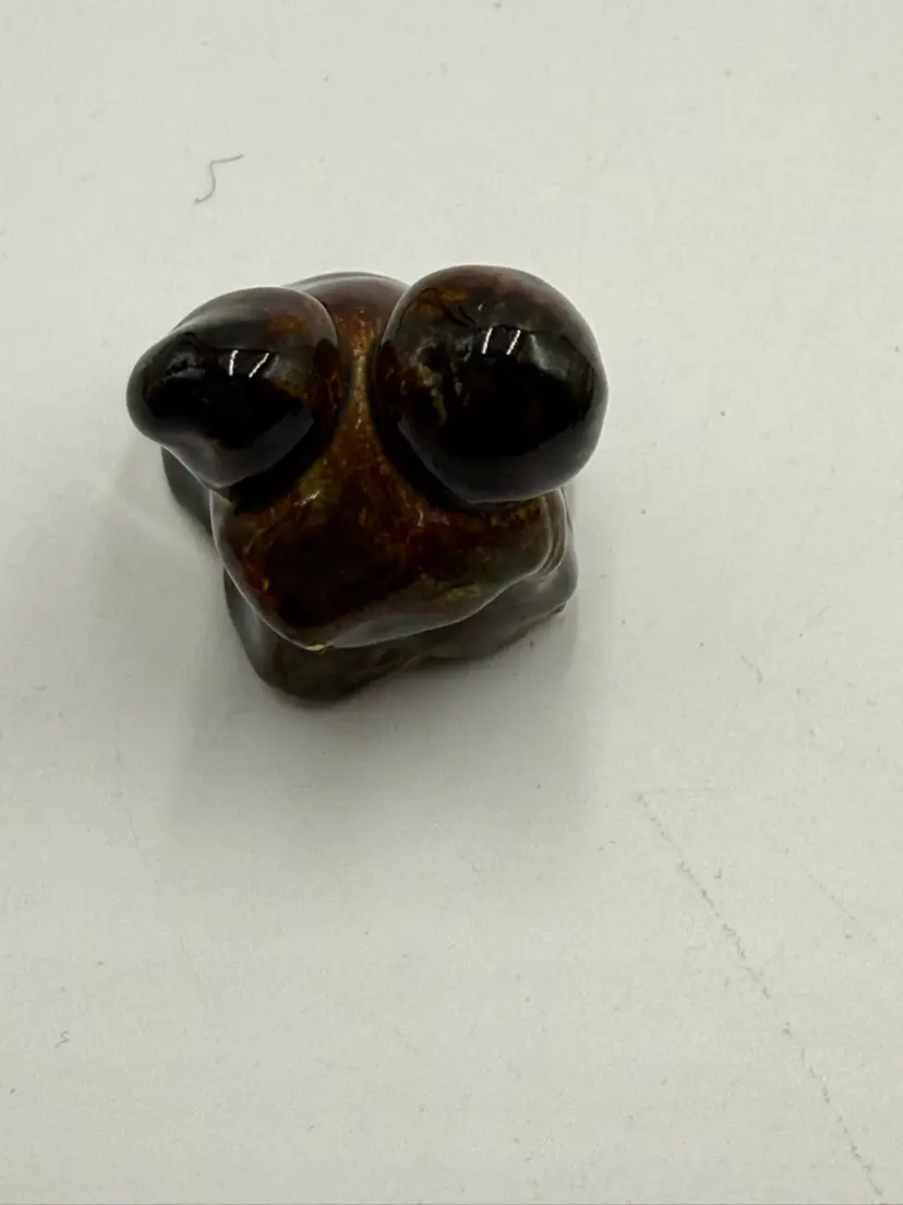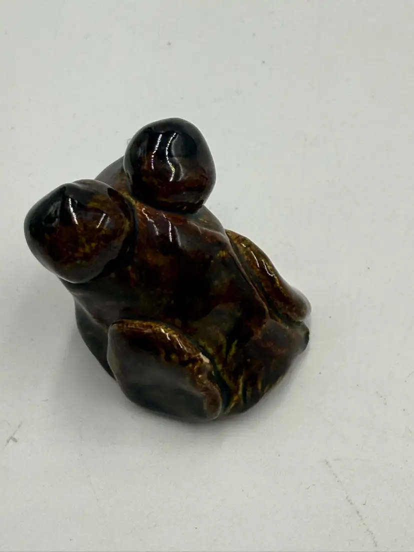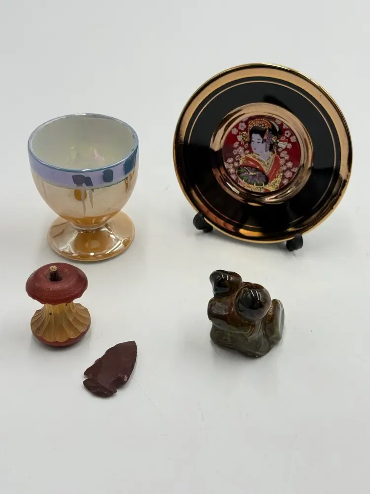 Random lot consists of: 3 in mini plate with stand 1 1/4 in pottery frog figurine 1 1/5 in wooden eaten apple figurine 2 in porcelain egg cup 1 1/4 in arrow head