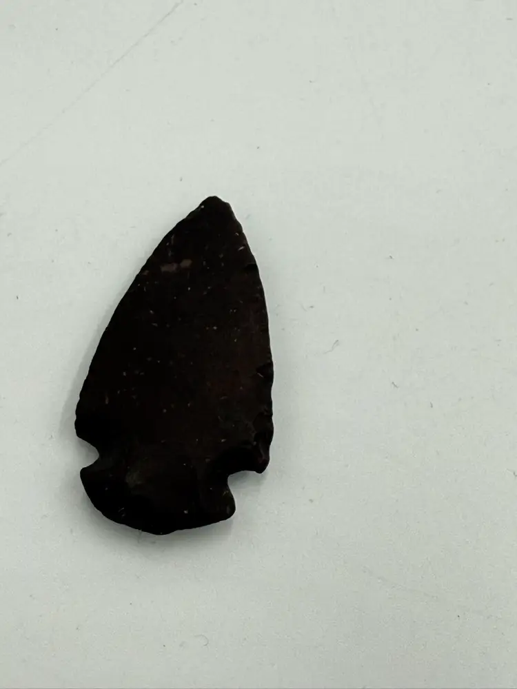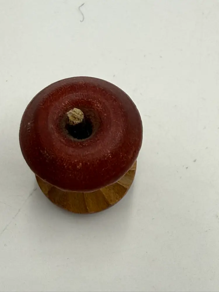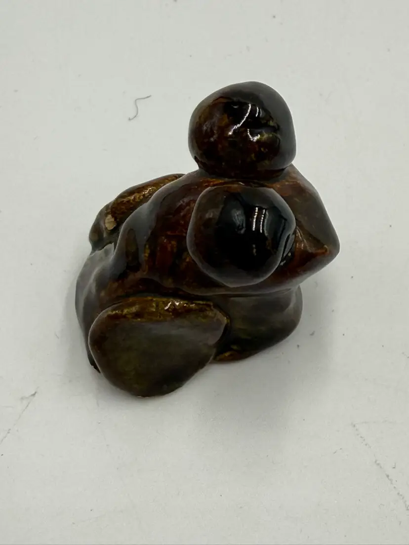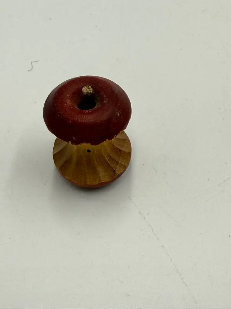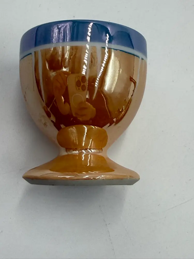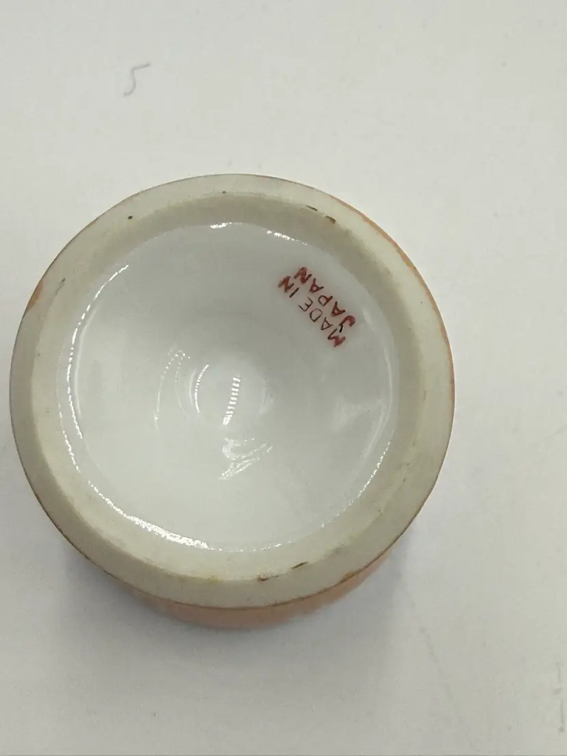 Random lot consists of: 3 in mini plate with stand 1 1/4 in pottery frog figurine 1 1/5 in wooden eaten apple figurine 2 in porcelain egg cup 1 1/4 in arrow head