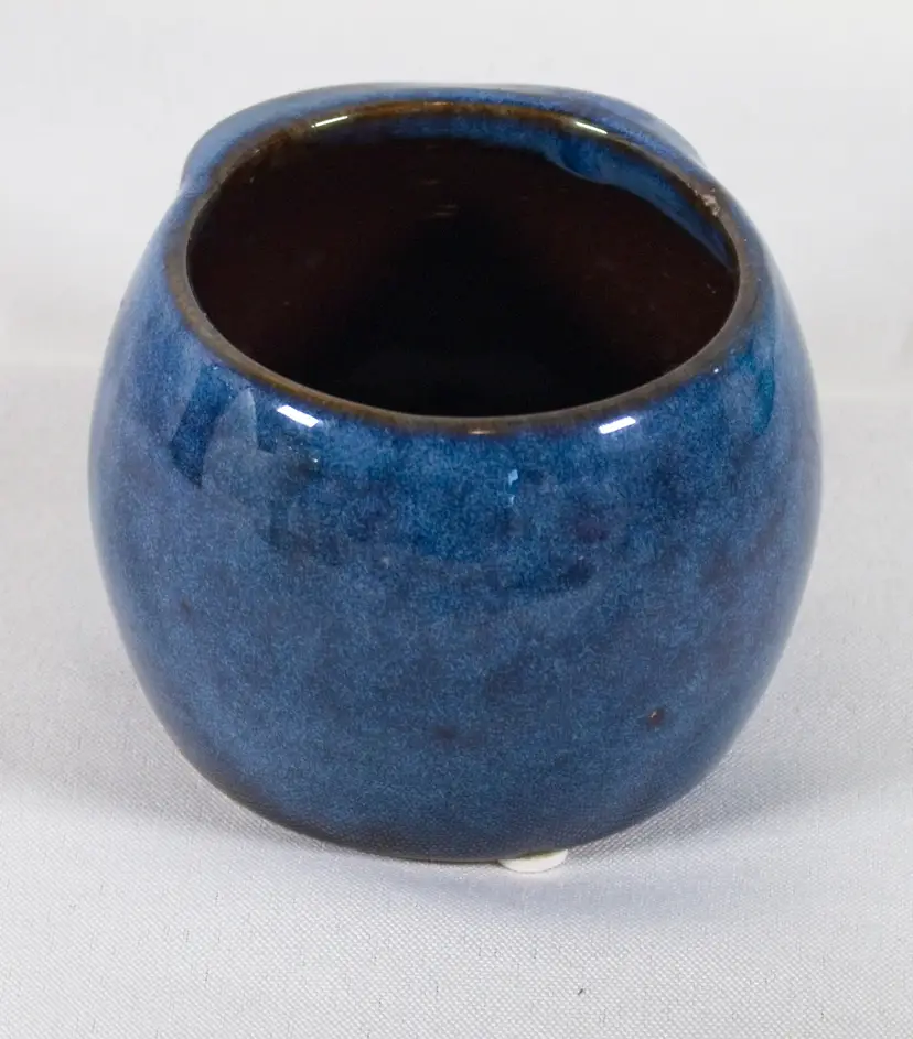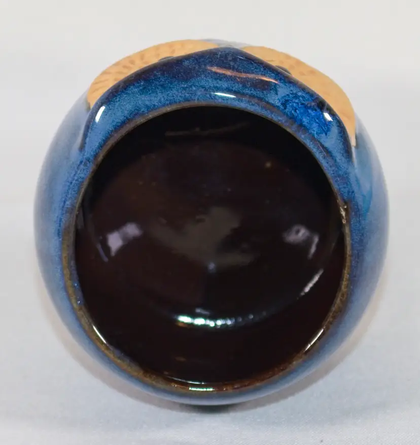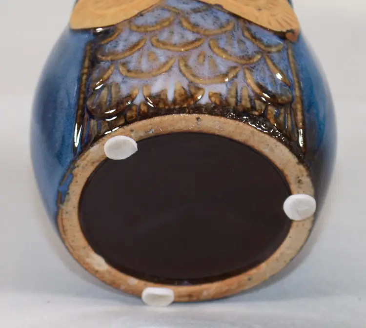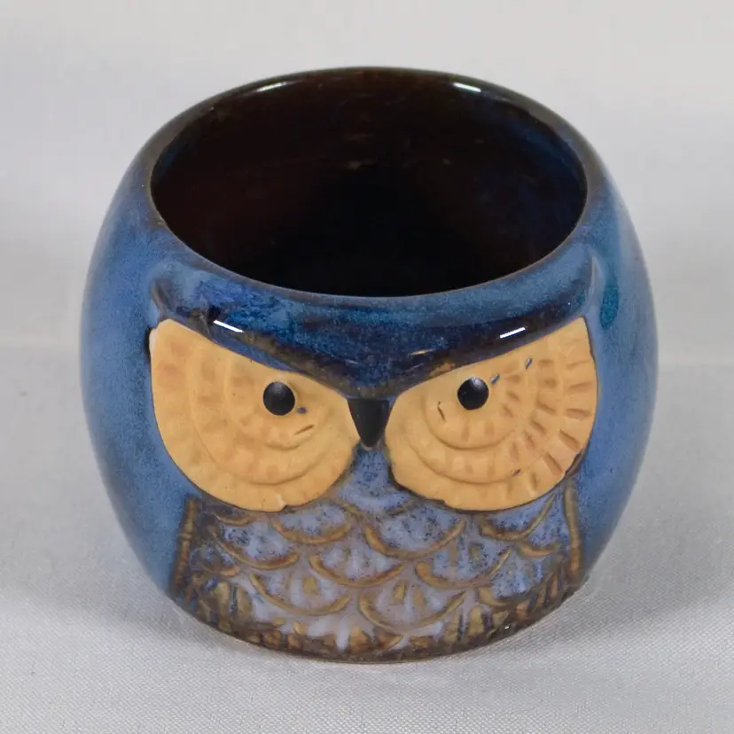 Small Owl Succulent Planter Ceramic Cobalt Blue 3" Wide x 2.5" Tall. There is a small amount of paint over splash on the eyes. Also a small burst air bubble on the back. Otherwise in good condition. 3" Wide x 2.5" Tall.