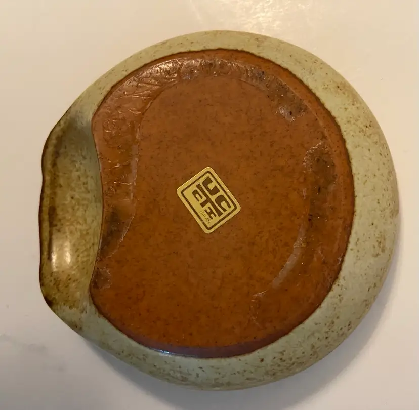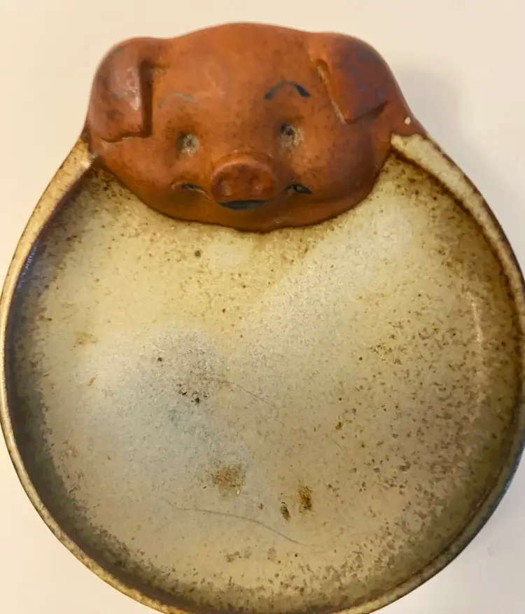 Vintage pig stoneware trinket dish by UCTI Japan. Measures 4” x 4” with earth tone ceramic. This would be a great piece to put by your bedside when you takeoff your earrings or jewelry for the evening. Very good condition with no chips or cracks.