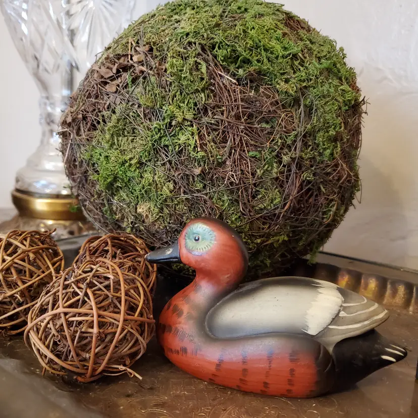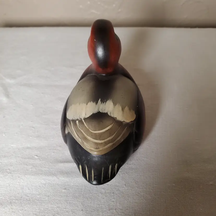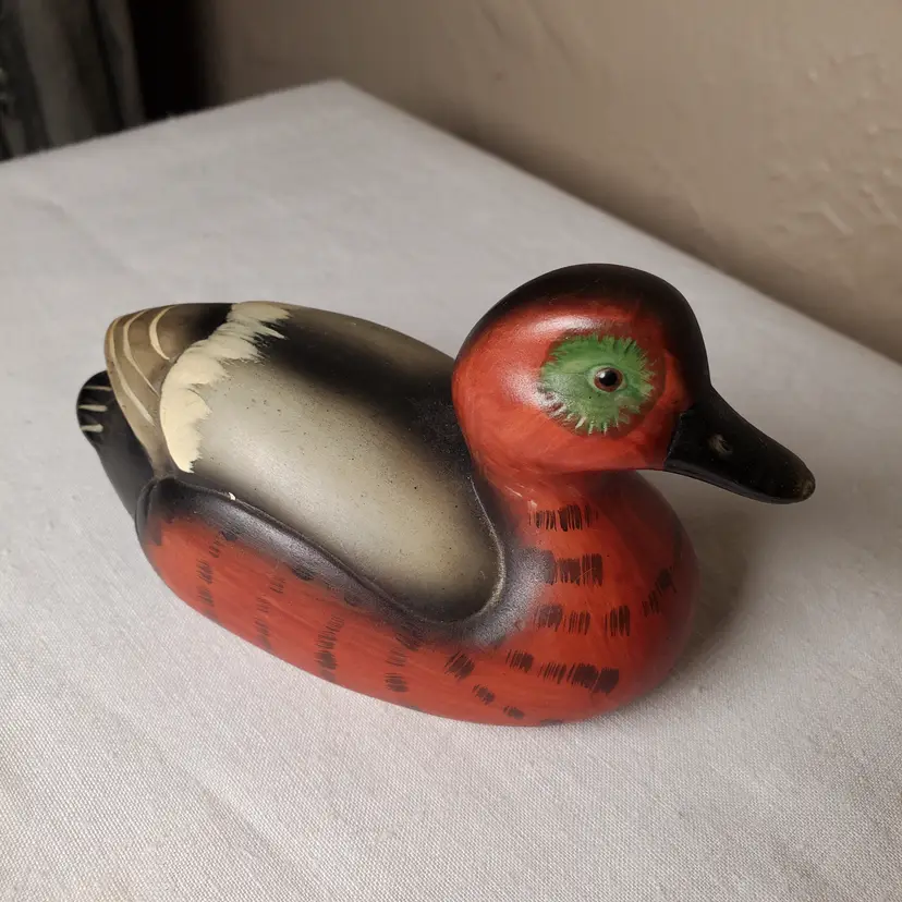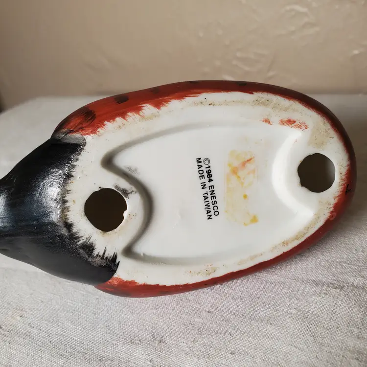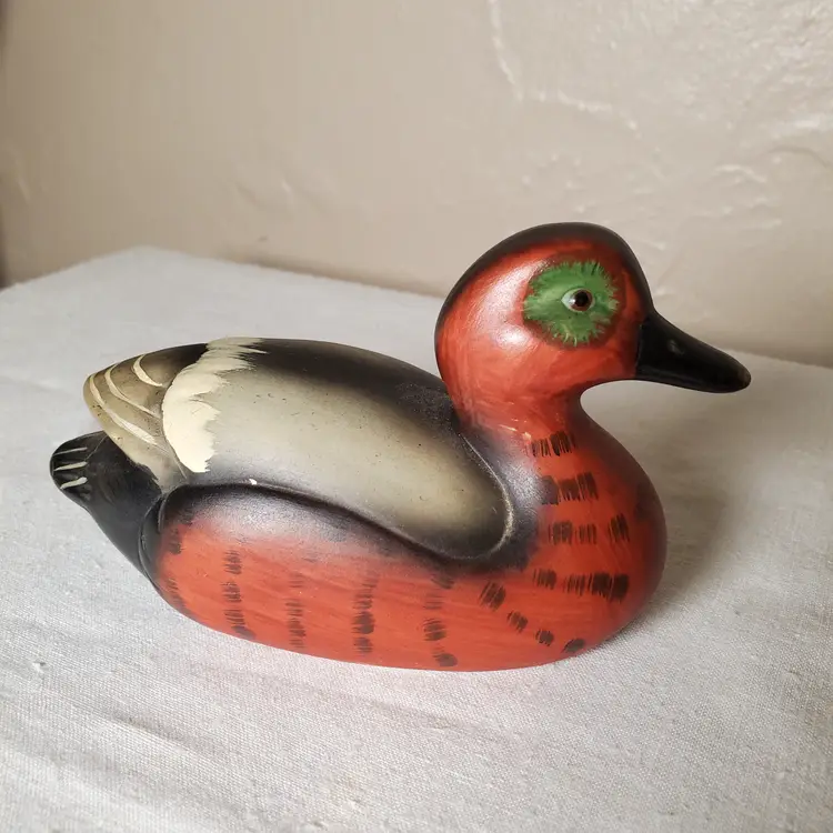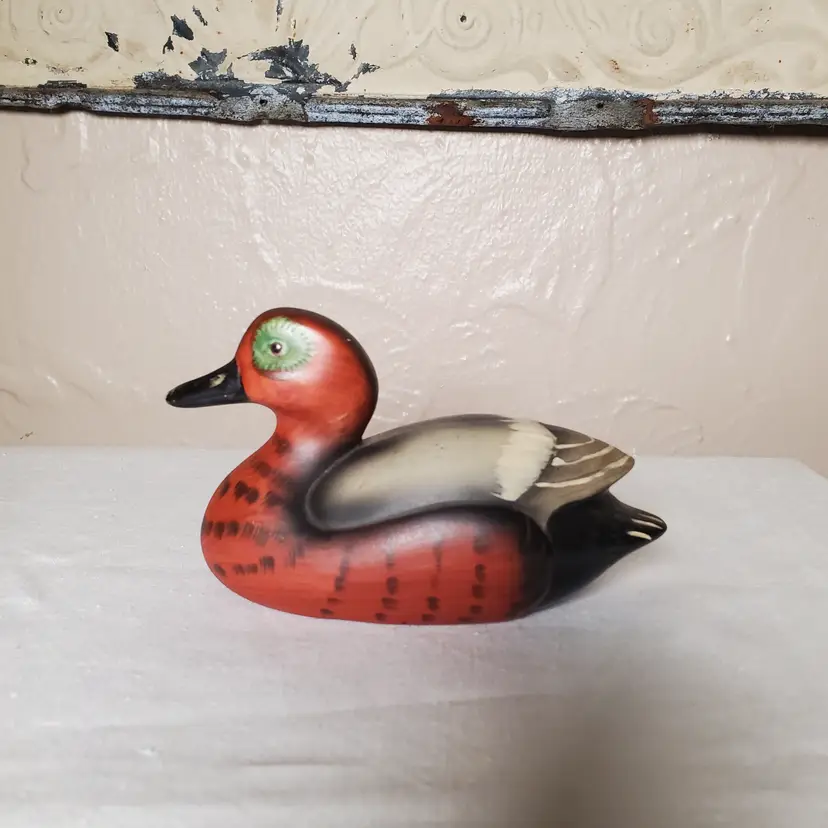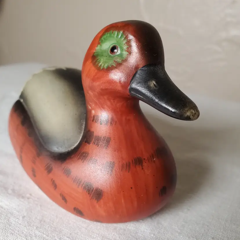 This small porcelain duck figurine would be a nice little addition to a bookshelf or tablescape. 1984 Enesco. 4.5" x 3". Small wear of paint on the bill.