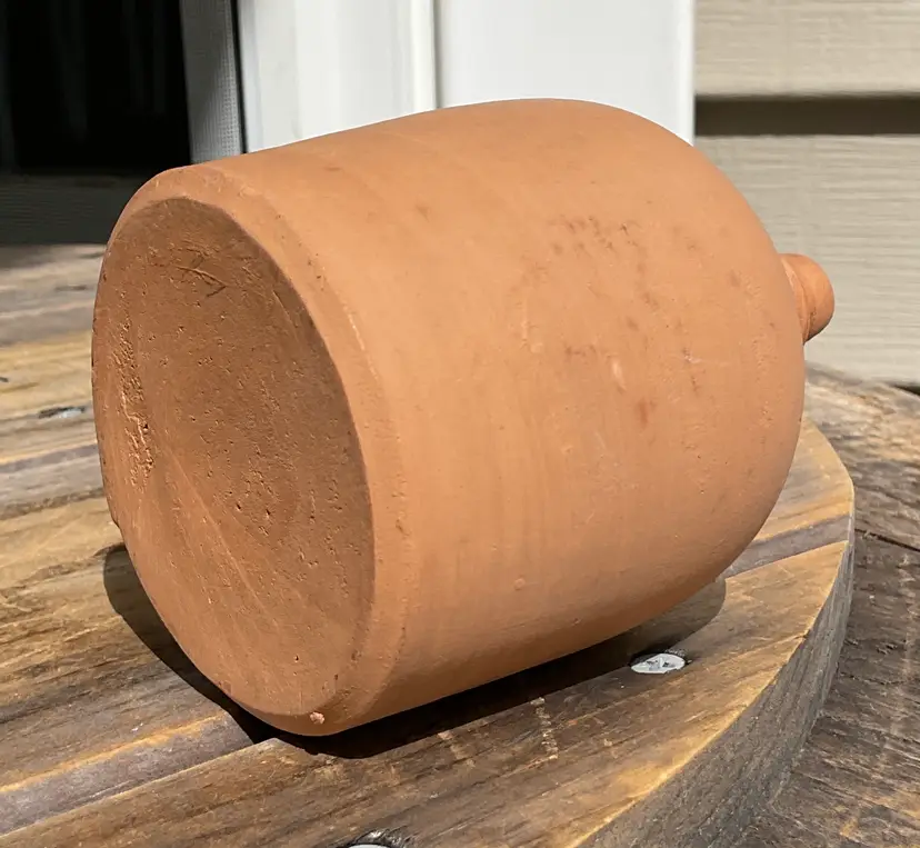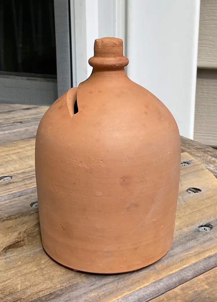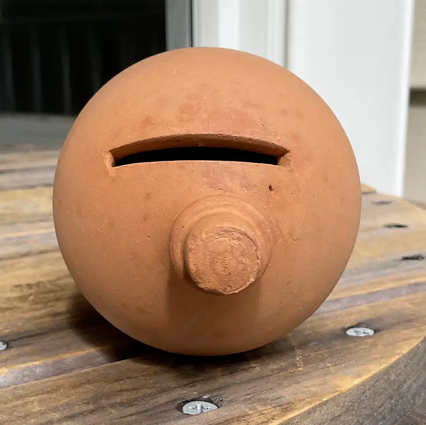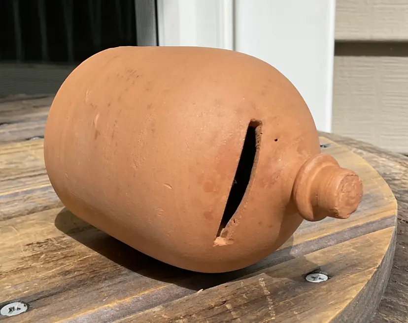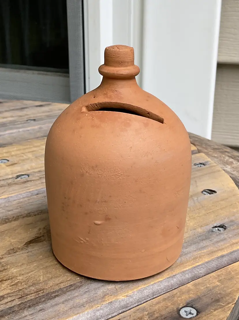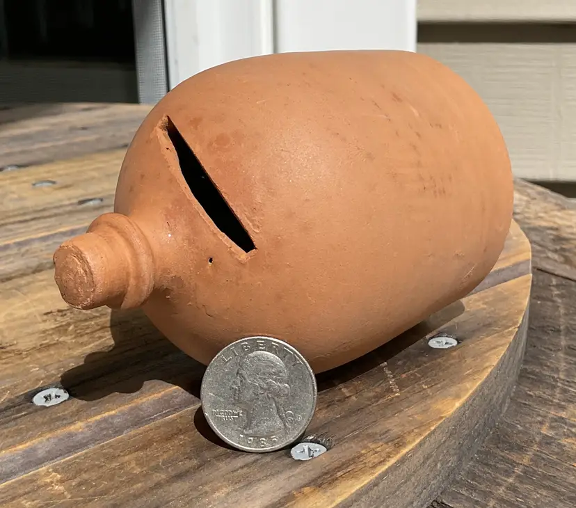 Great old small primitive penny coin still bank. It is unglazed. Unsure if this is redware or stoneware.