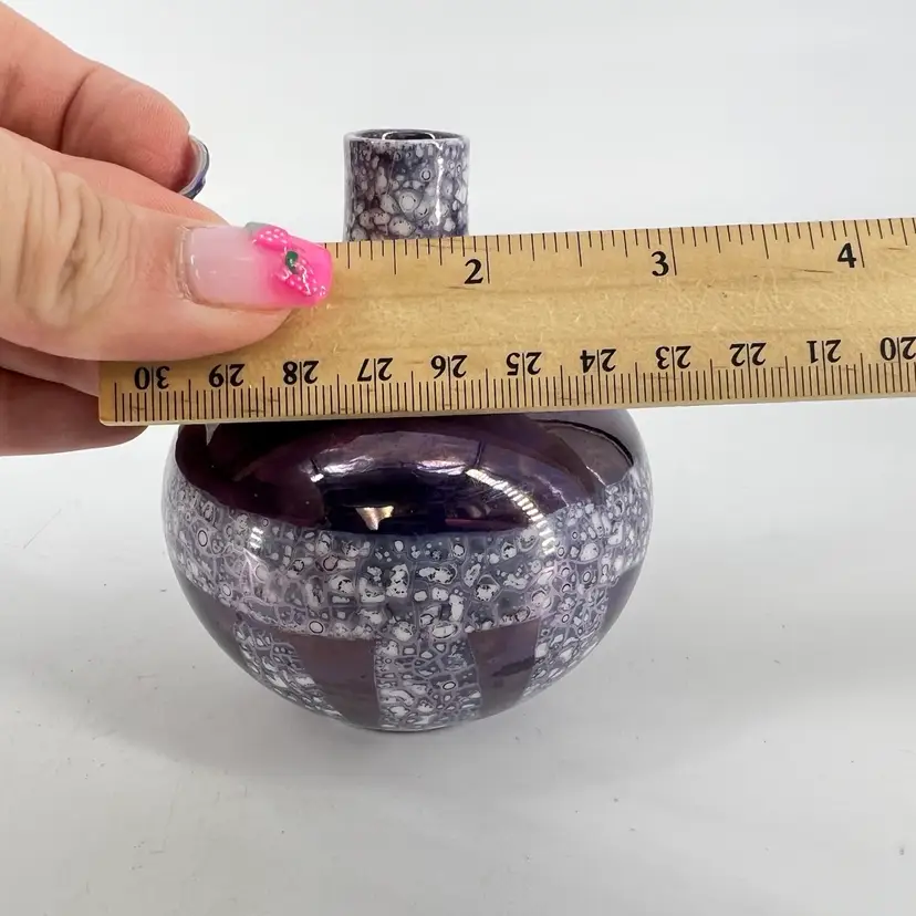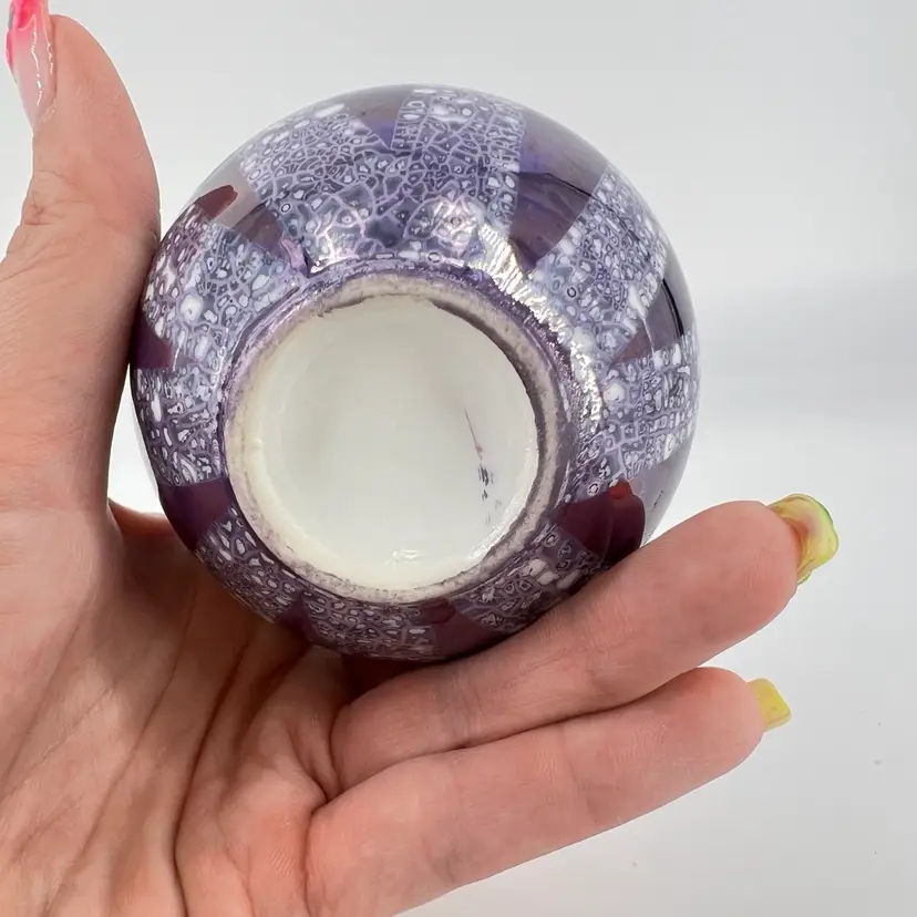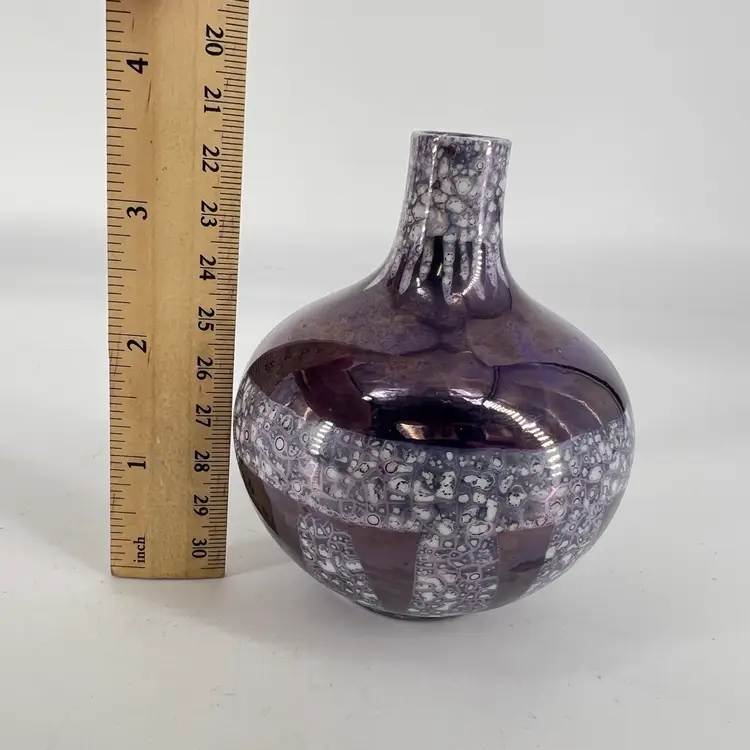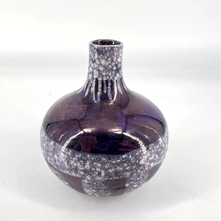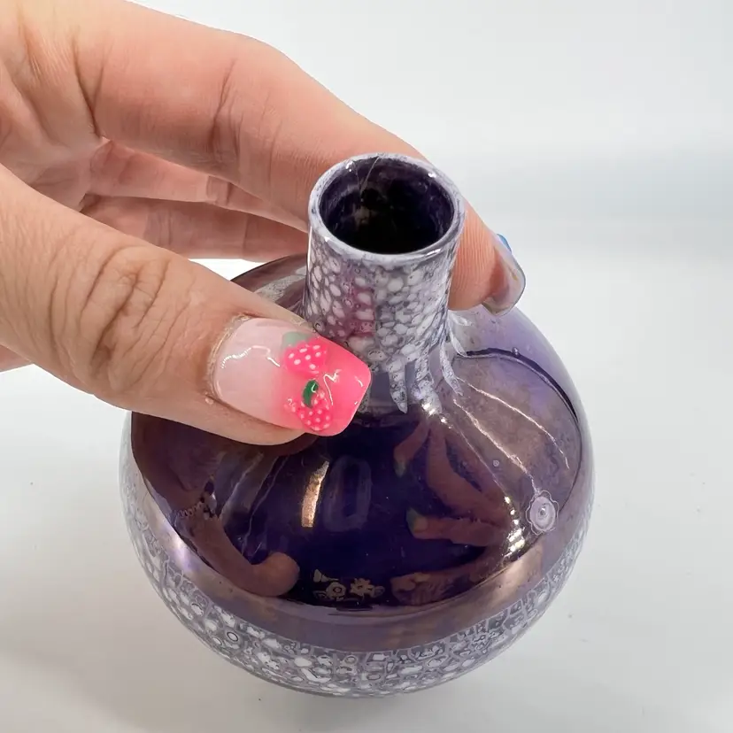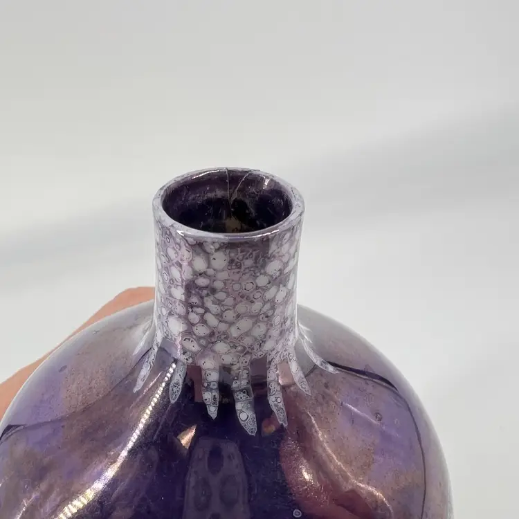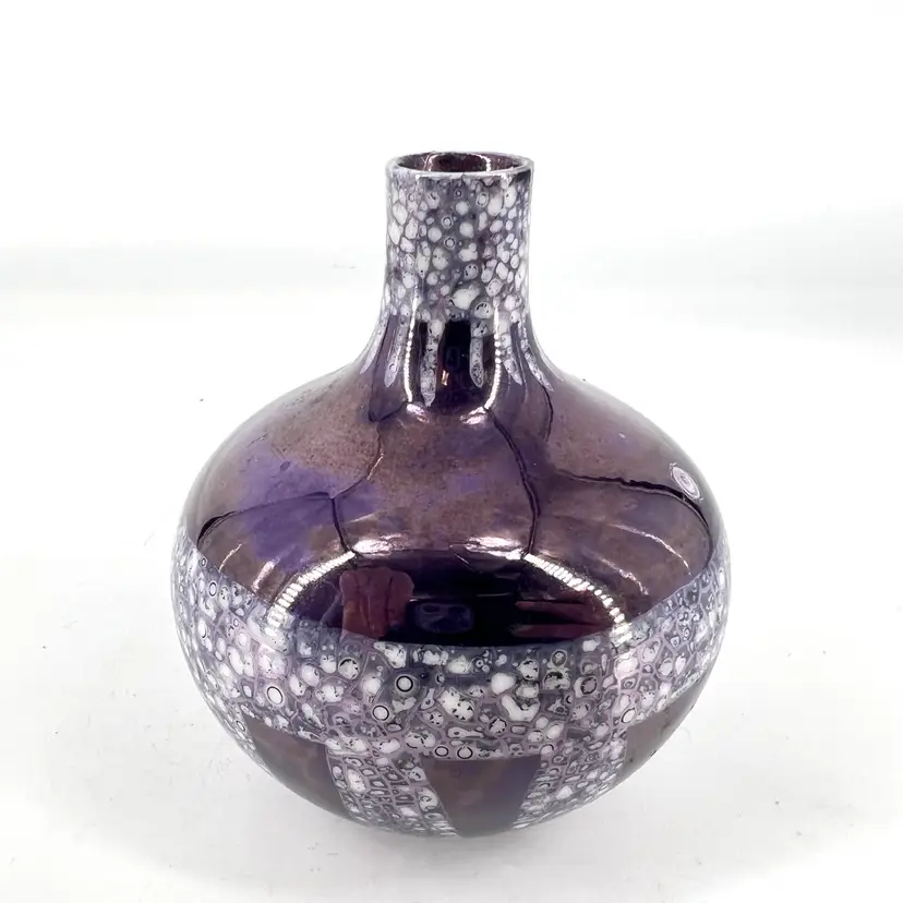 This deep purple luster vase is unsigned. It measures approx 3.75” tall.