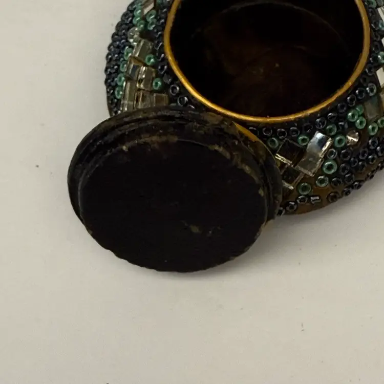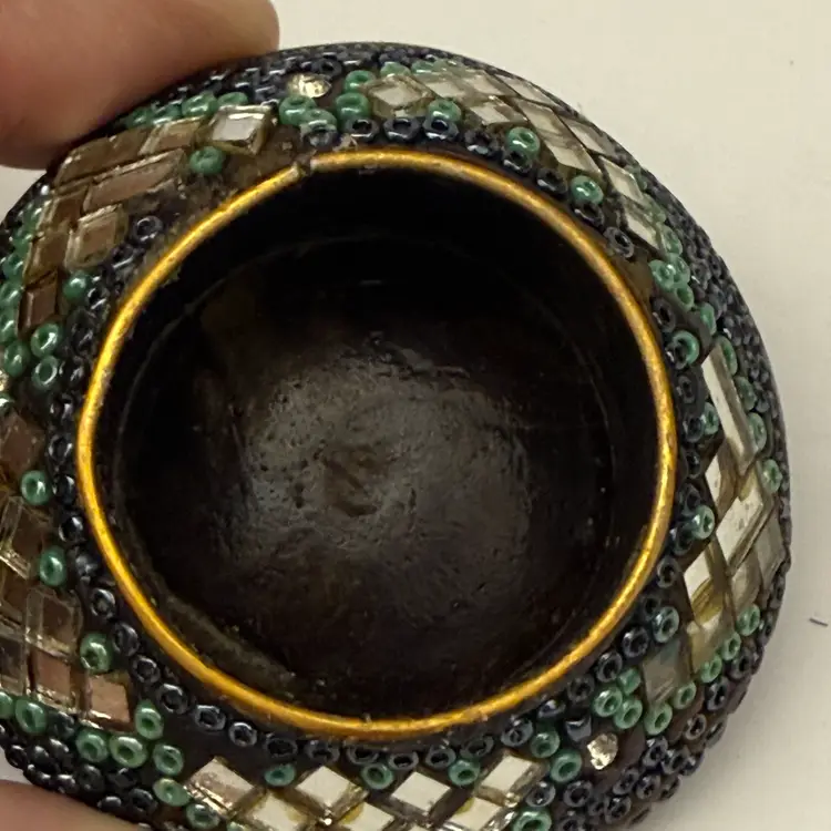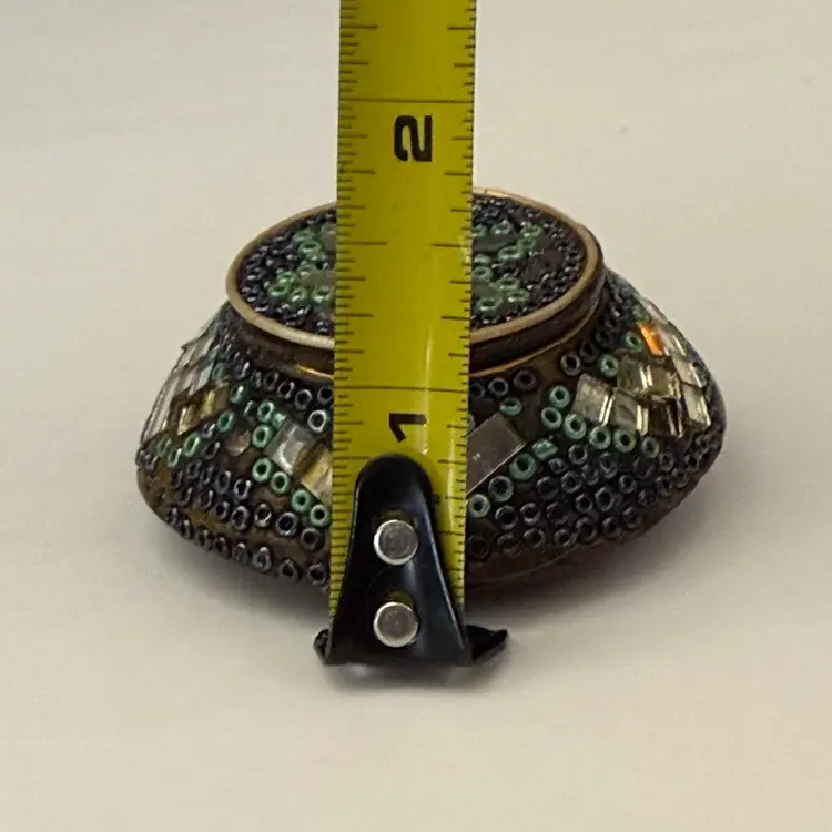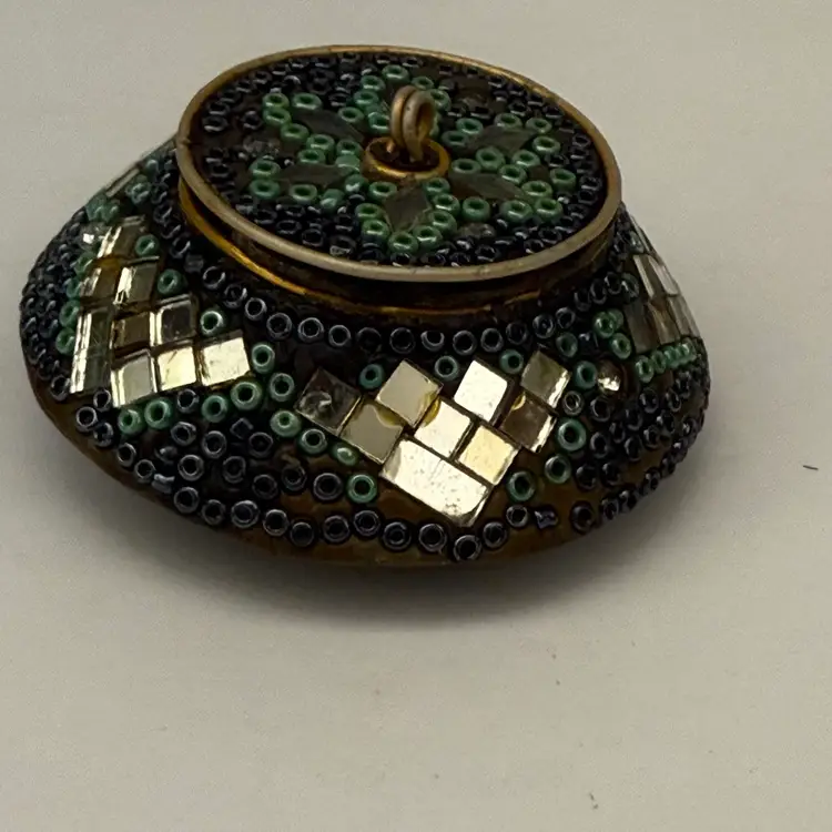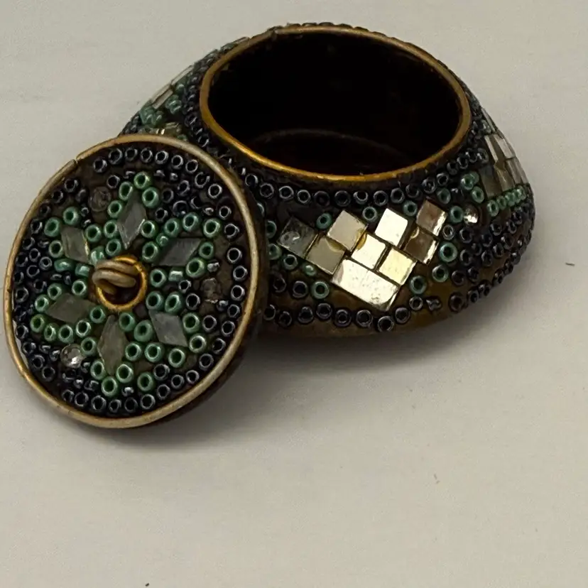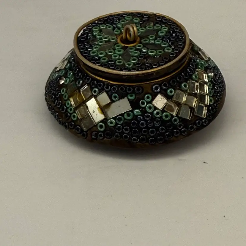 This small Trinket Box is beautifully decorated with mirrors and beads and perfect for holding small items like rings (as shown but not included), earrings, etc. It measures almost 2.5” wide by approx 1.5” tall and is in good preowned condition with a few beads missing as shown in the photos.