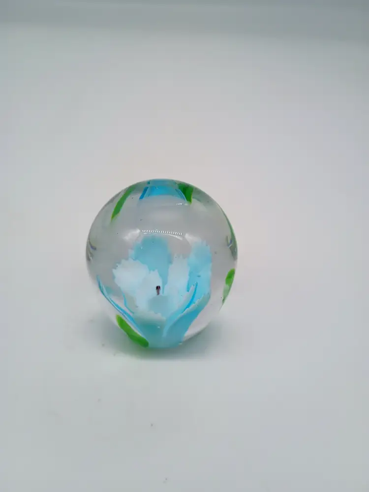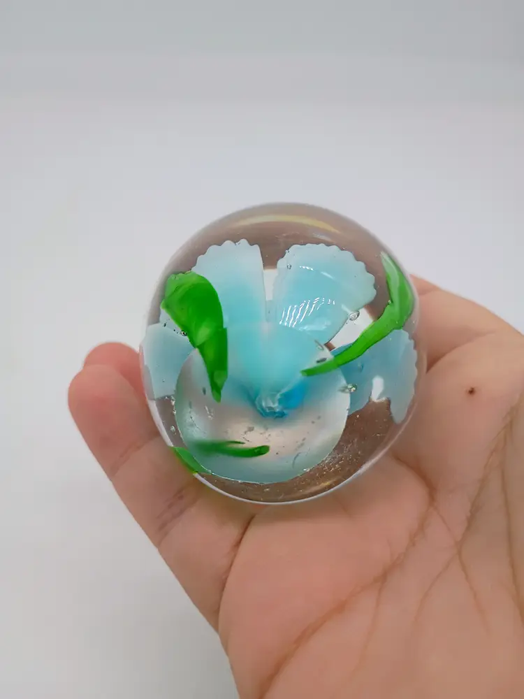 Small SILVESTRI Art Glass Blue Flower Paperweight 2.5” Vintage . Circa 1990's. Very nicely with a Pale Blue flower and green leaves in clear glass Oval shaped dome. Heavy solid glass for it's size. This is preowned. No Chips cracks or flea bites, no bruises or fractures. Smooth cloudy bottom. This had a Silvestri sticker but it came off during cleaning. Excellent condition. Ships USPS domestically and USPS International Shipping globally