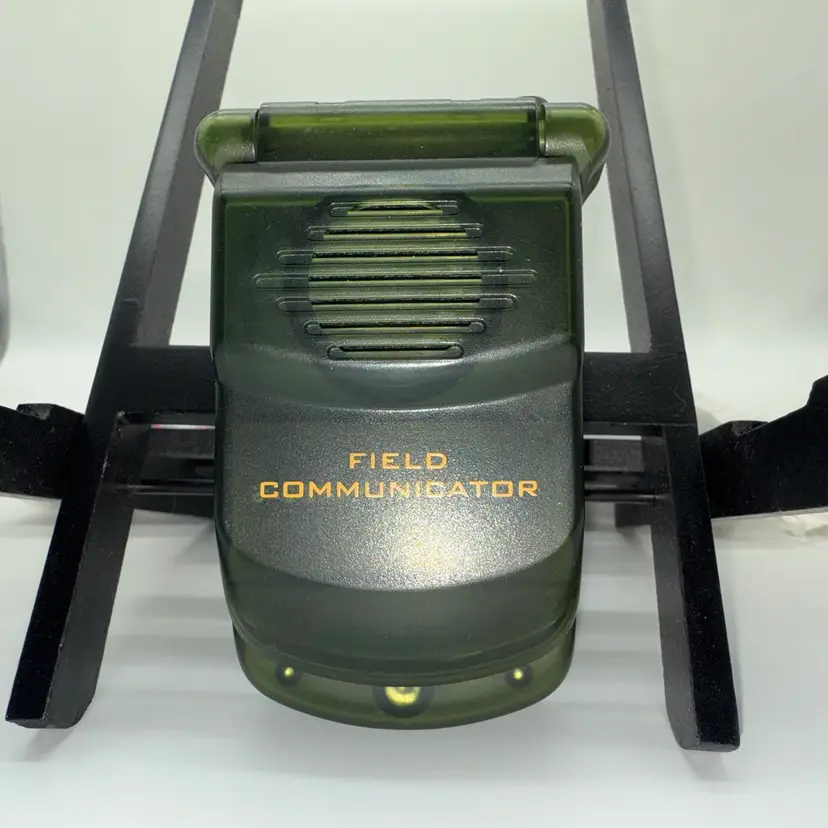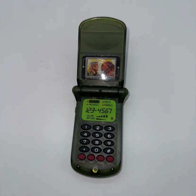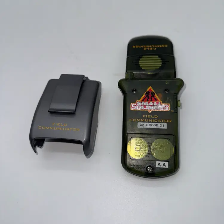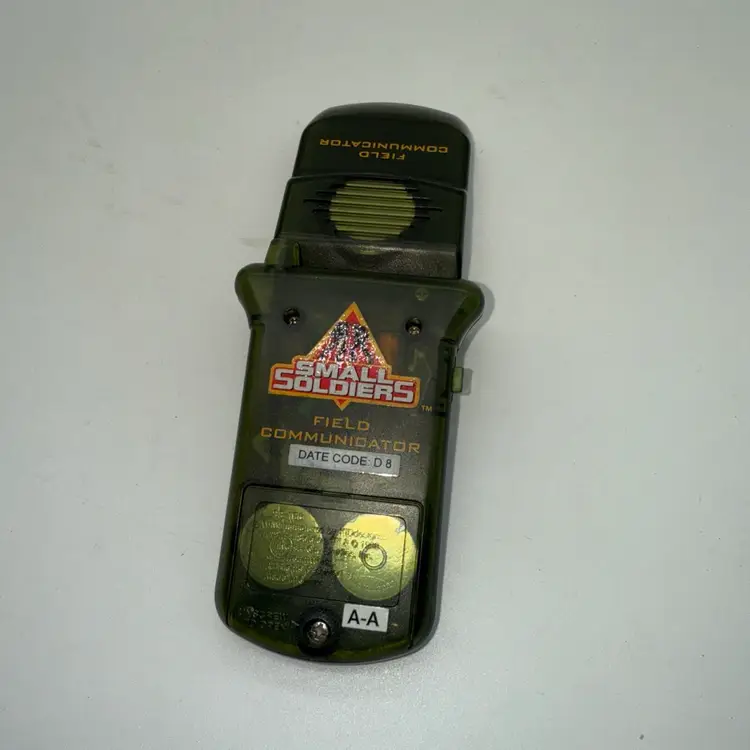 This vintage Small Soldiers Field Communicator Toy Phone from 1998 is a collectible item featuring the character Hazard from the Small Soldiers franchise. Made of plastic and standing at 6.5 inches tall, this action figure does not come with packaging. The toy phone has a broken antenna and is part of the TV, Movie & Video Games theme. It is an original Hasbro product manufactured in China during the 1990s.