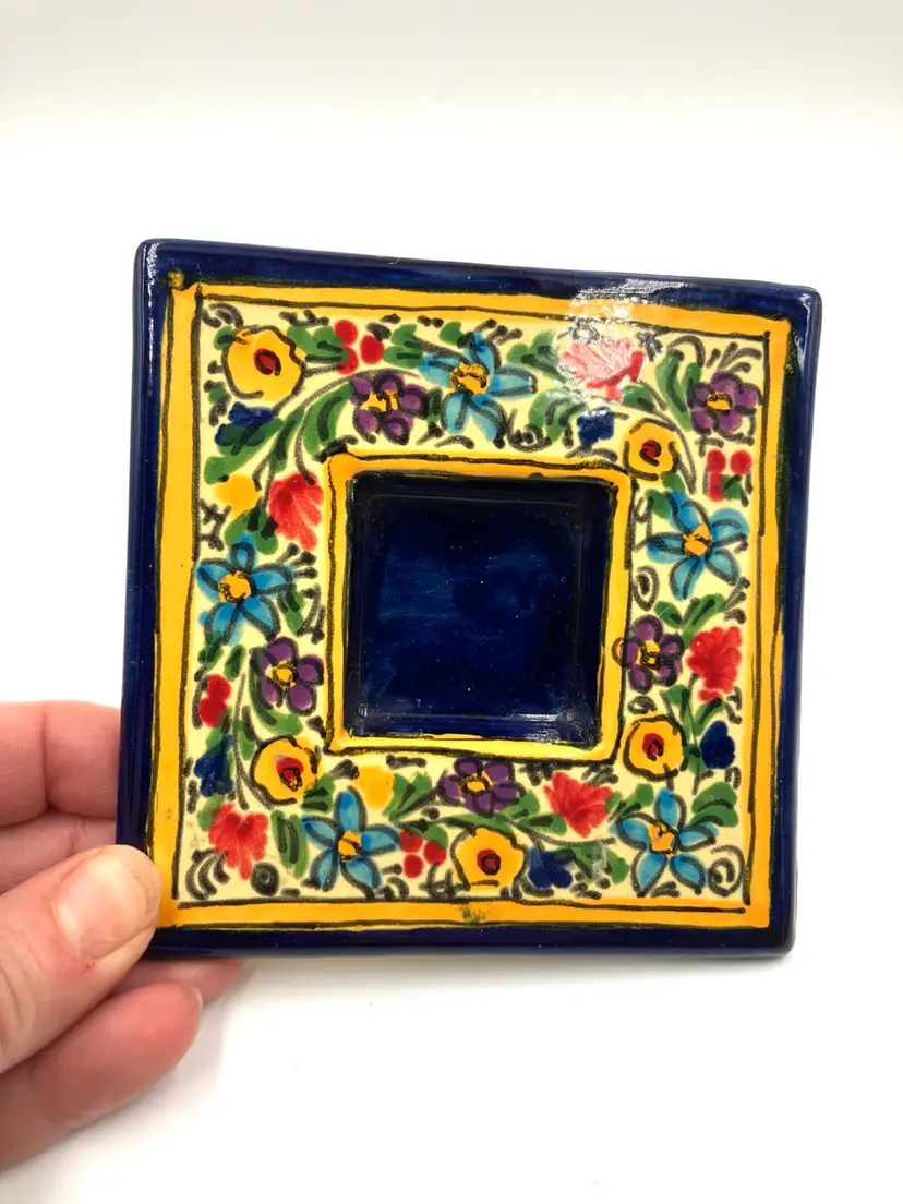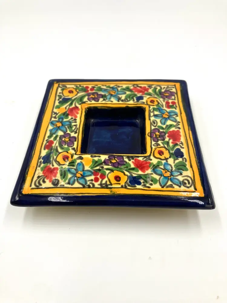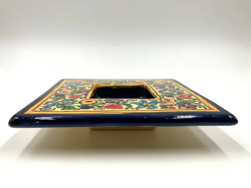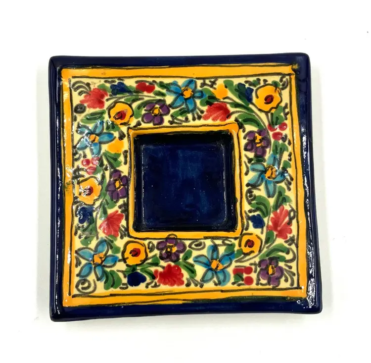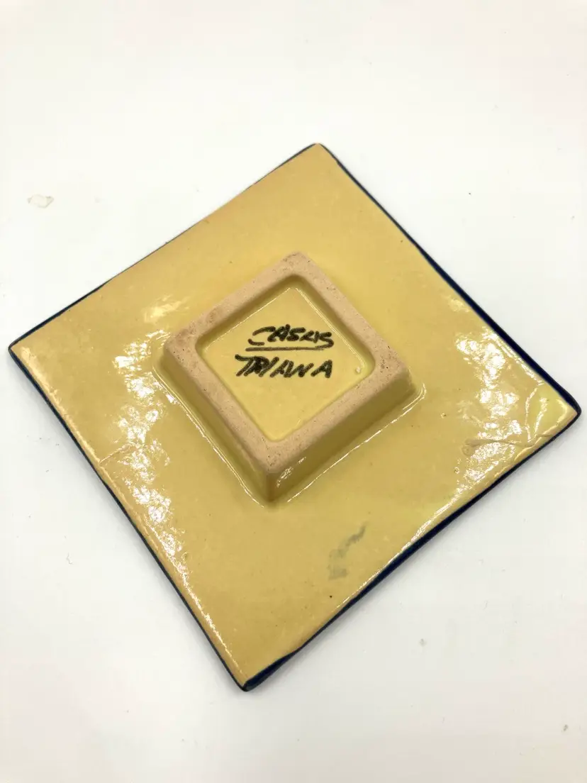 Brightly colored ceramic trinket dish / bowl signed “Casas” from Triana, Spain. Measures 4.25” square by 0.875”. Center drops down 0.375”