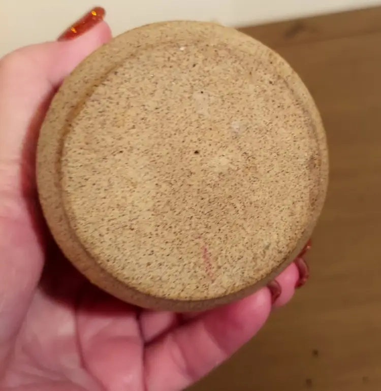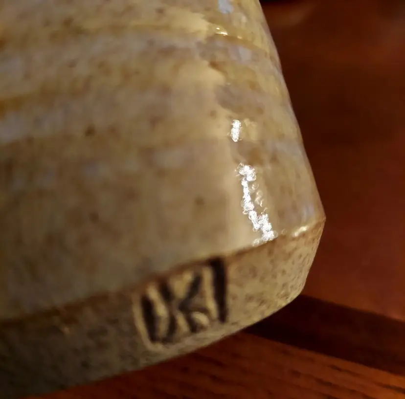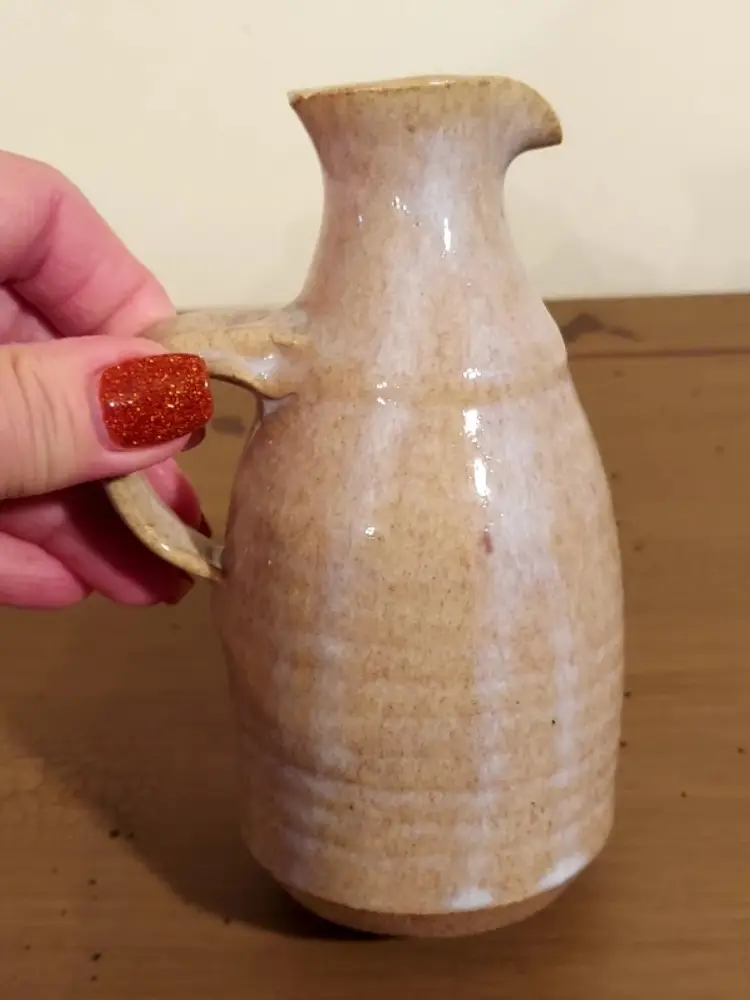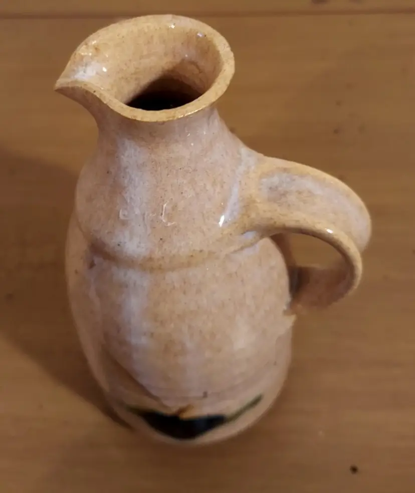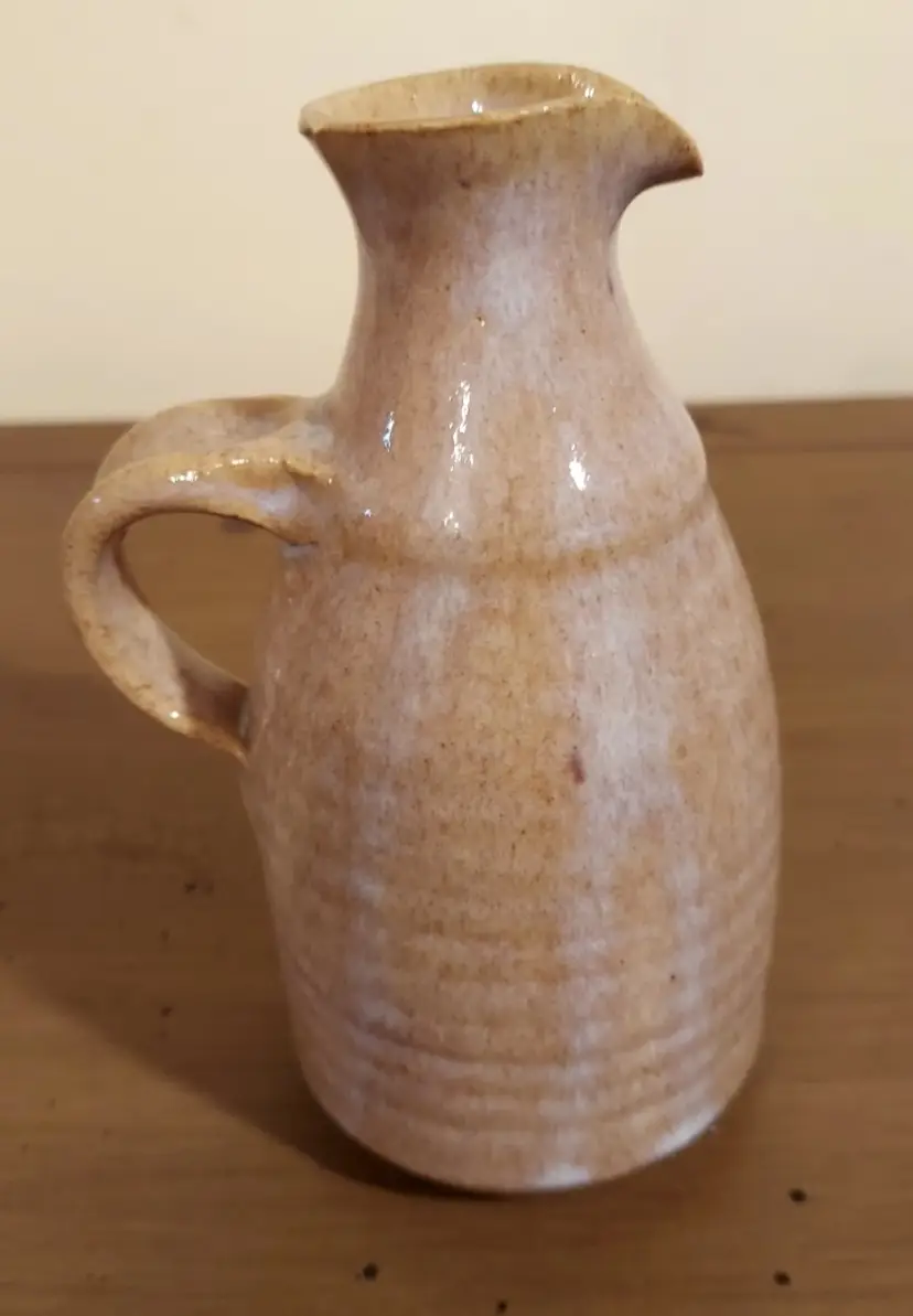 Small tan colored carafe with handle, abstract design on one side Measures 6" tall Measures 3" diameter There's a makers mark but I can't identify it No cracks or chips