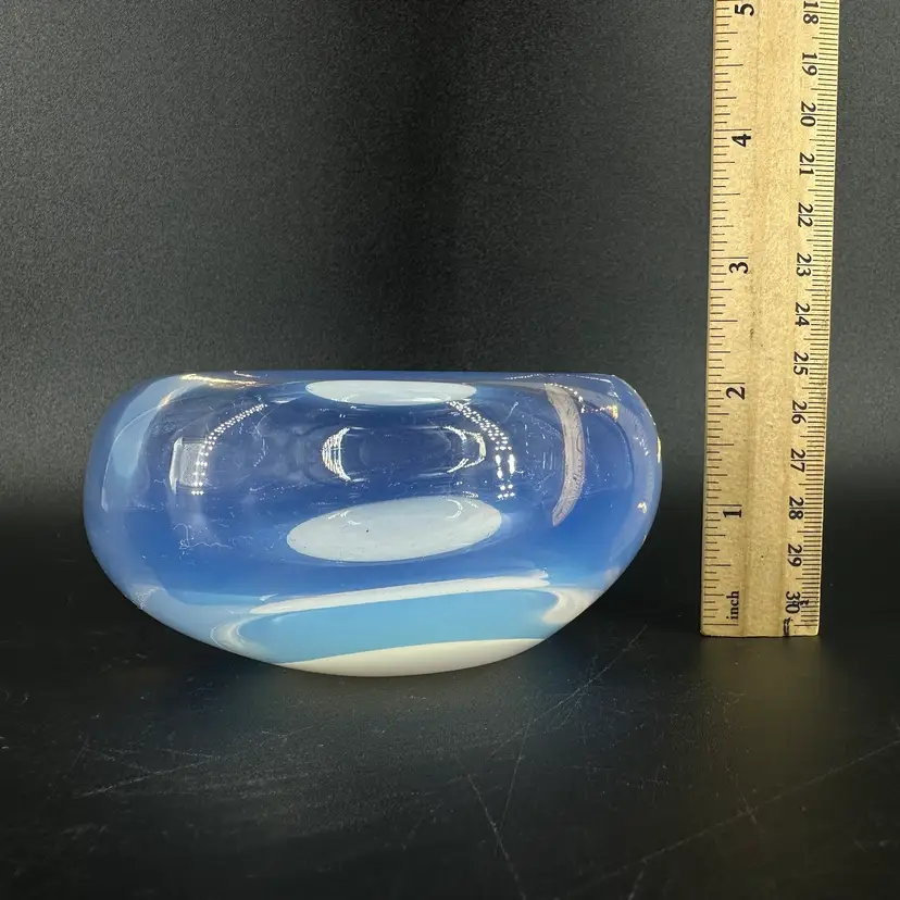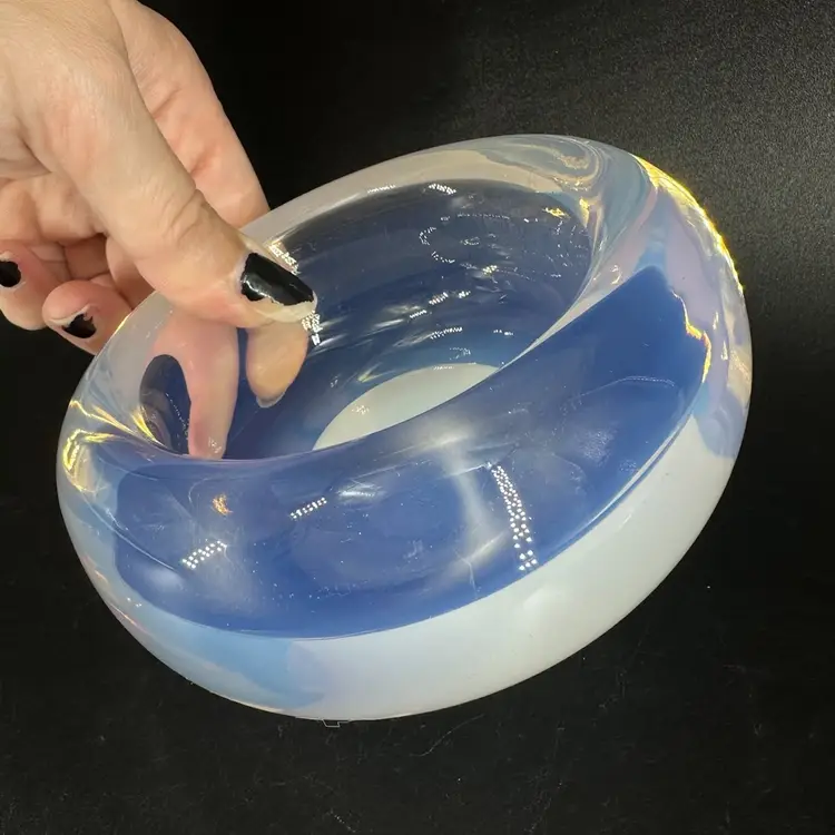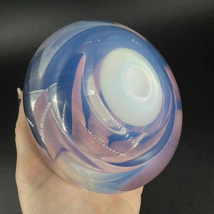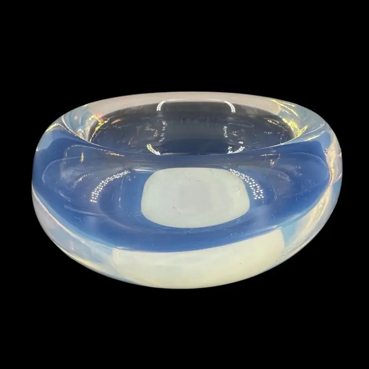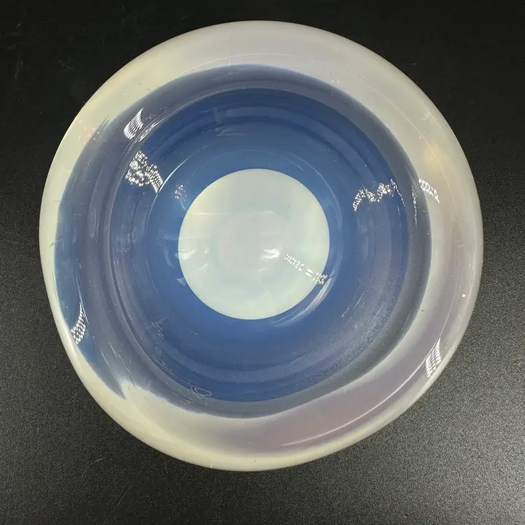 Thick opaline glass small bowl/trinket dish. No chips cracks or signatures. Has some small scratches from usage. Bowl measures approximately 2” tall and 4.5” wide.