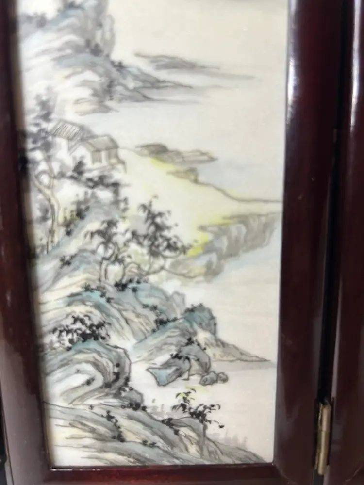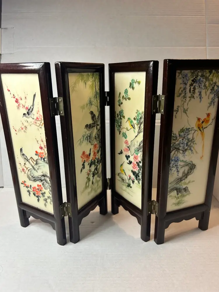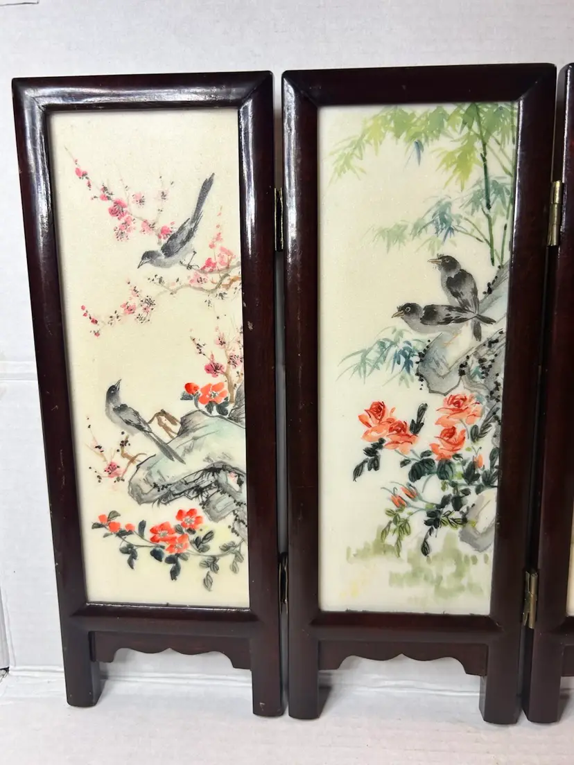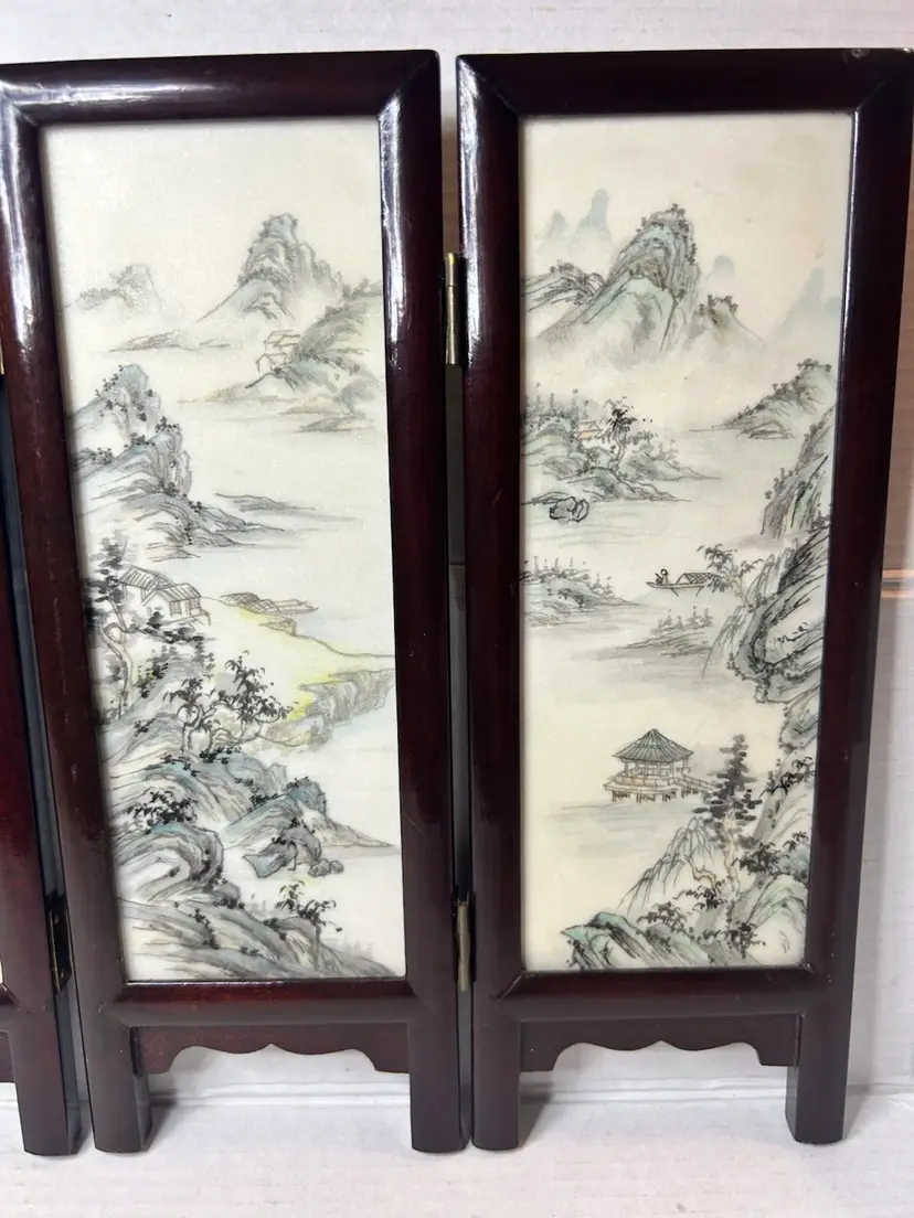 This small vintage Chinese table screen features intricate watercolor paintings on soapstone panels, showcasing traditional Chinese culture and craftsmanship. The delicate and detailed artwork on the panels adds a touch of elegance and history to any room. Perfect for collectors of Chinese artifacts or those interested in Asian cultures, this unique piece is sure to be a standout addition to any decor.