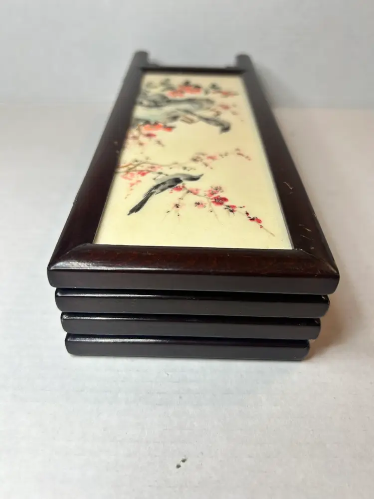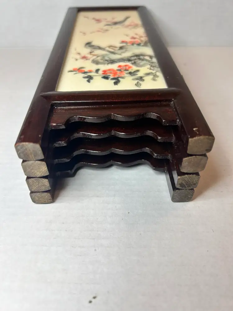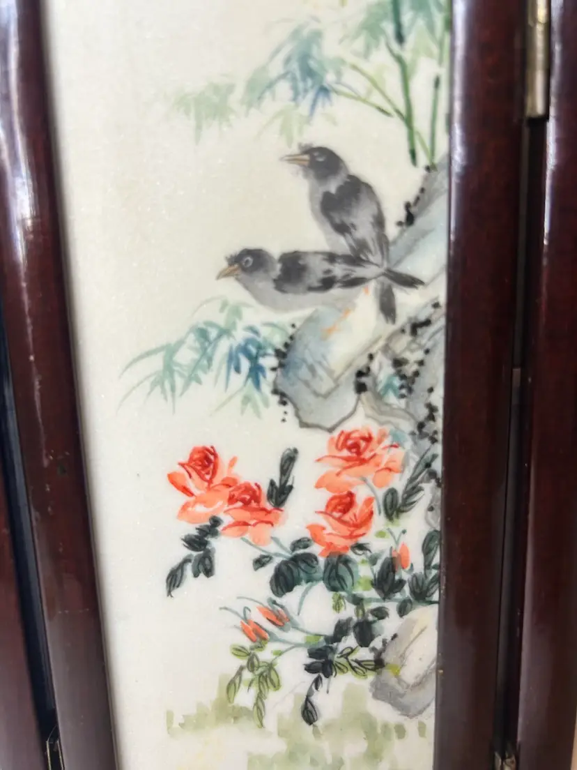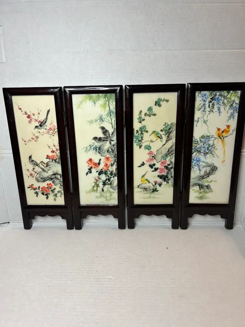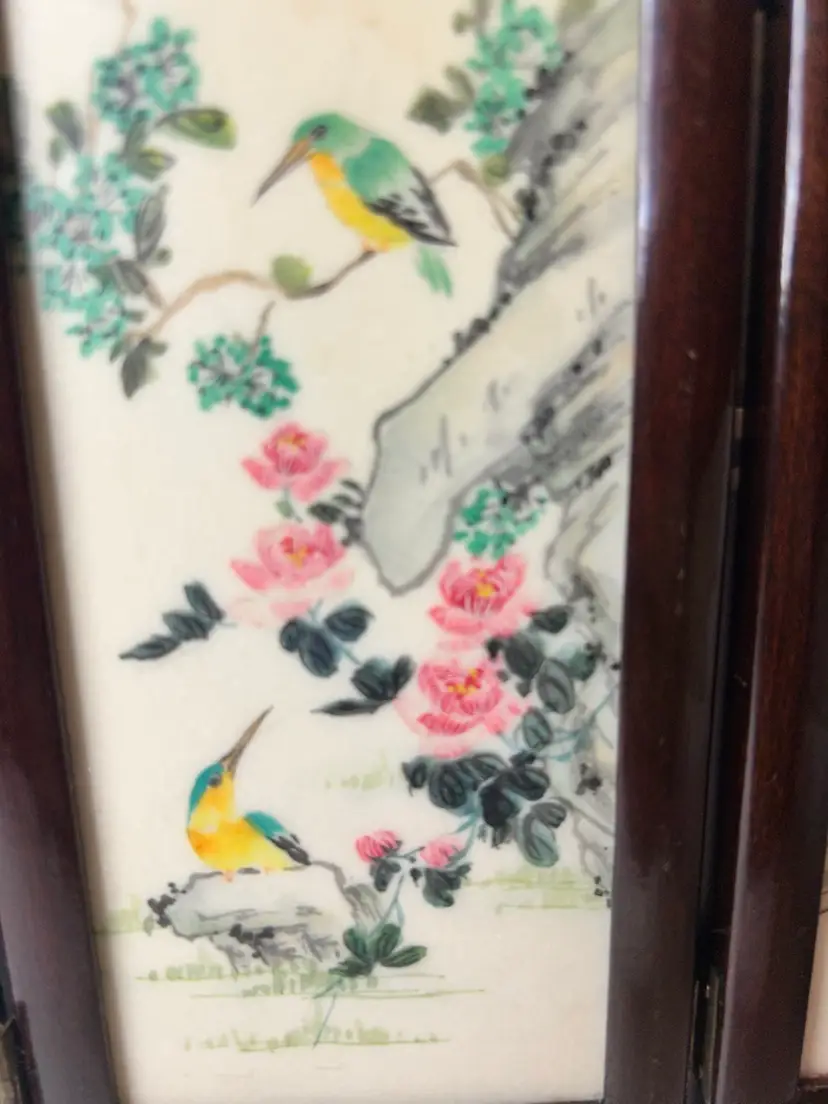 This small vintage Chinese table screen features intricate watercolor paintings on soapstone panels, showcasing traditional Chinese culture and craftsmanship. The delicate and detailed artwork on the panels adds a touch of elegance and history to any room. Perfect for collectors of Chinese artifacts or those interested in Asian cultures, this unique piece is sure to be a standout addition to any decor.