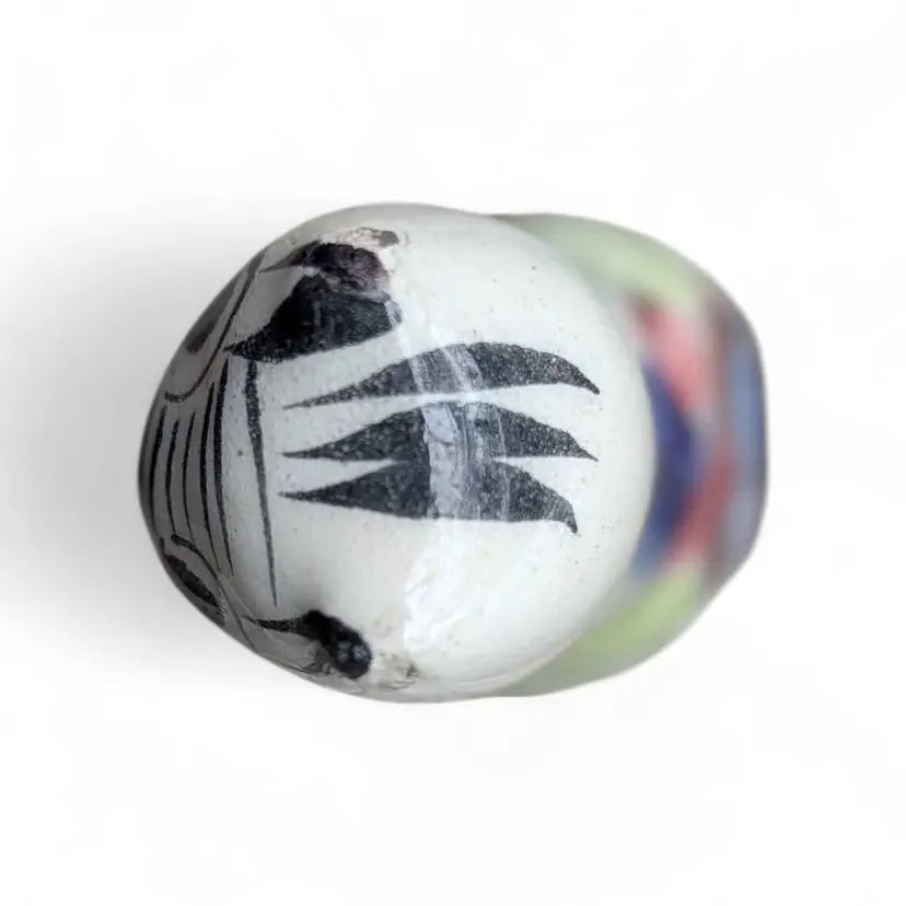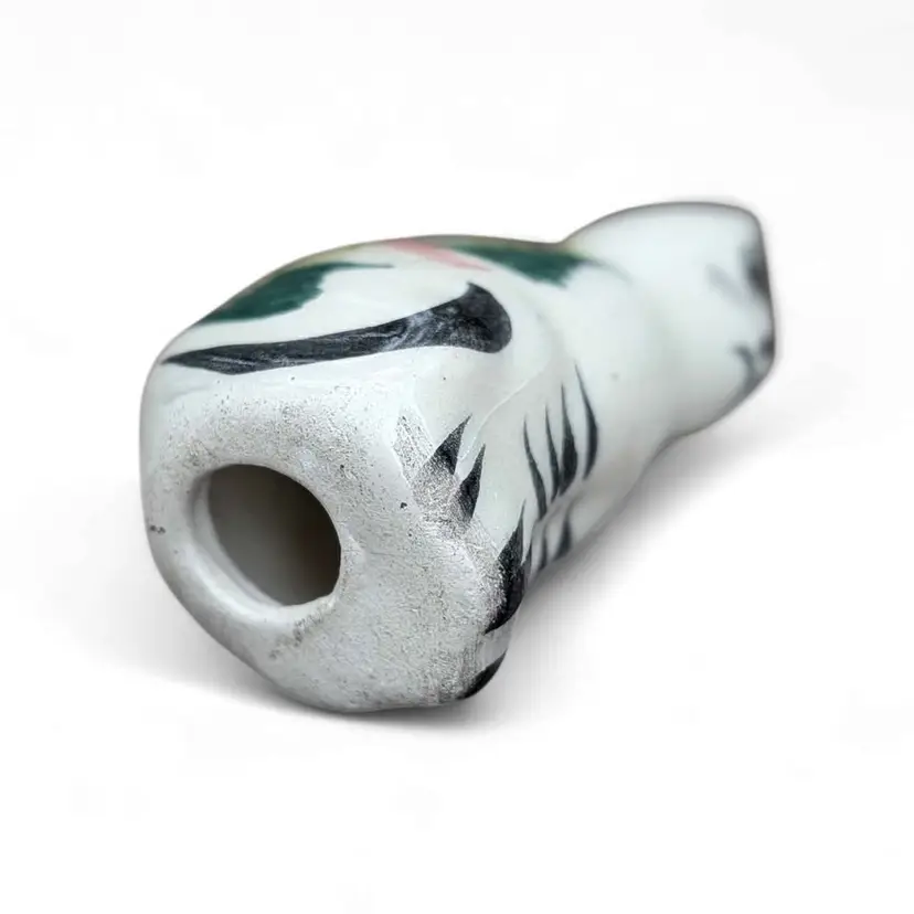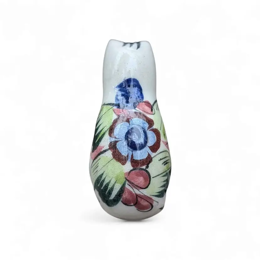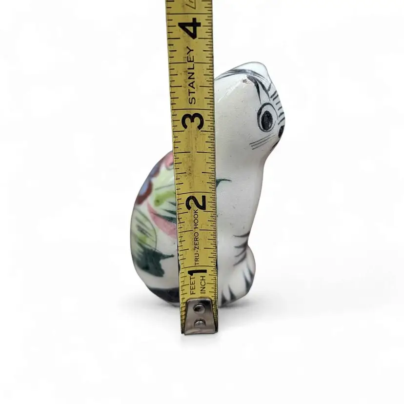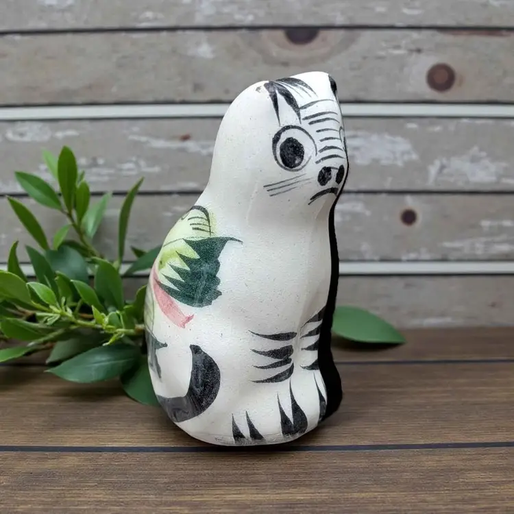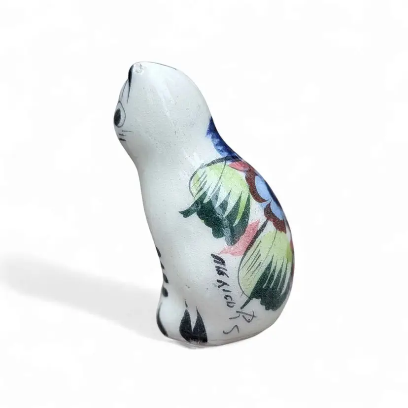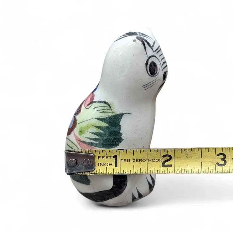 Small Vintage Pottery Mexican Tonala Folk Art Cat Figurine. This is an adorable Tonala cat figurine - it is hand painted with a botanical and floral design and colors are earthy but vibrant. This is in overall fair condition - both ears have some minor chipping as shown in photos - and it is signed on the side. This would make a great addition to any Tonala collection or a great gift for a cat lover! This is about 3.5" tall and 1.5" wide.