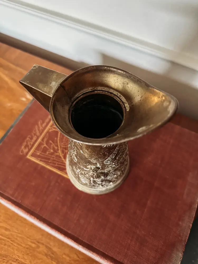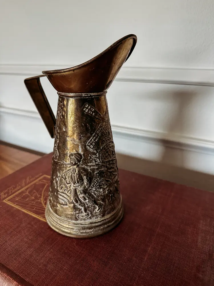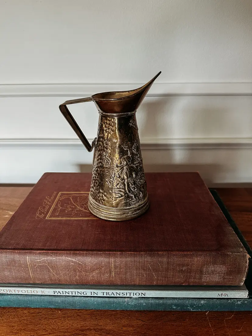 Vintage brass pitcher with relief style design. Use as a flower vase or simply as decor on its own! A lovely addition to a European style home! Can be left with patina or polished! measures 7.75" tall