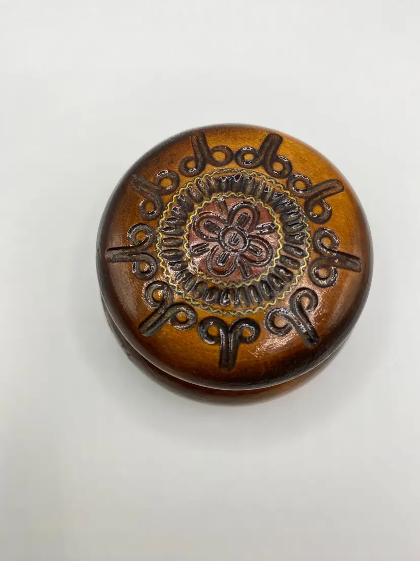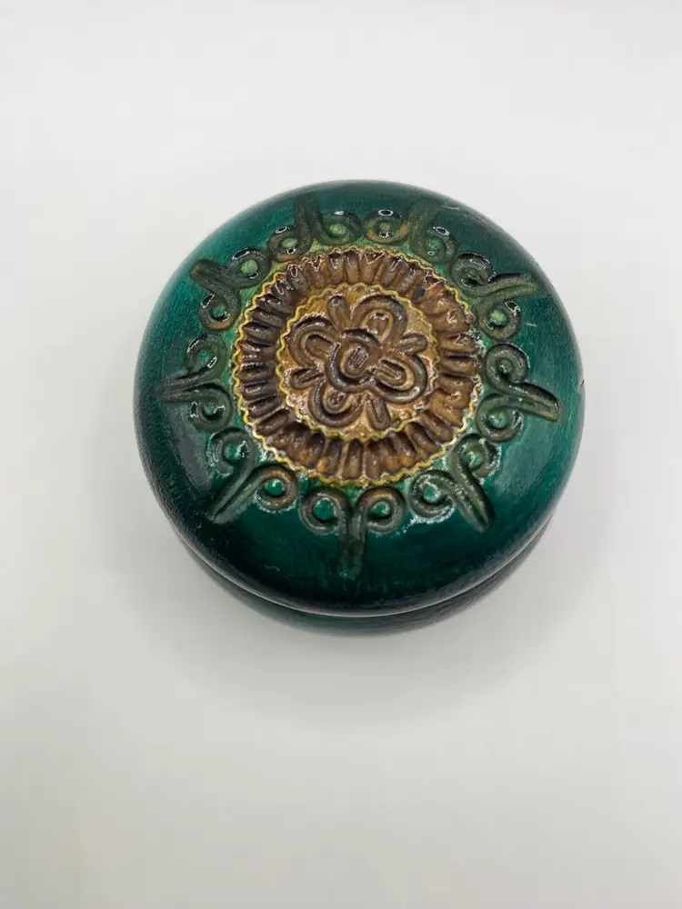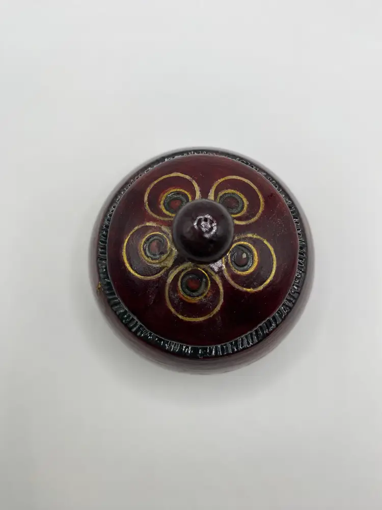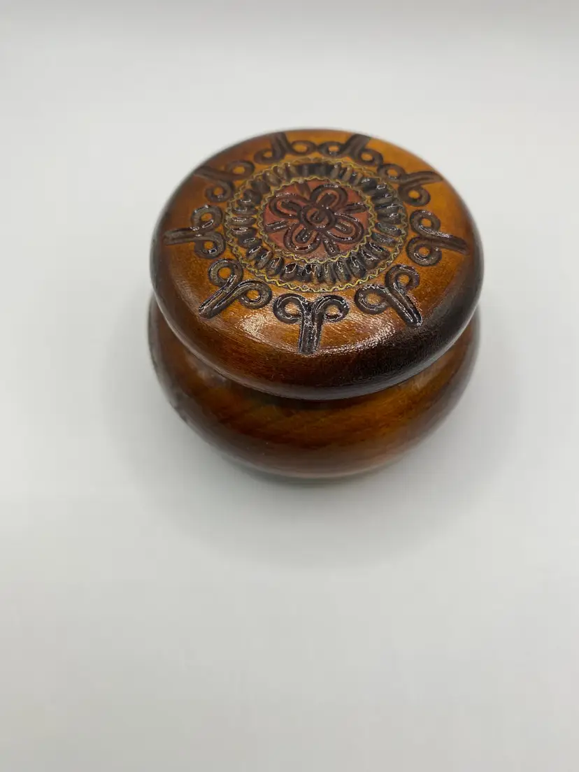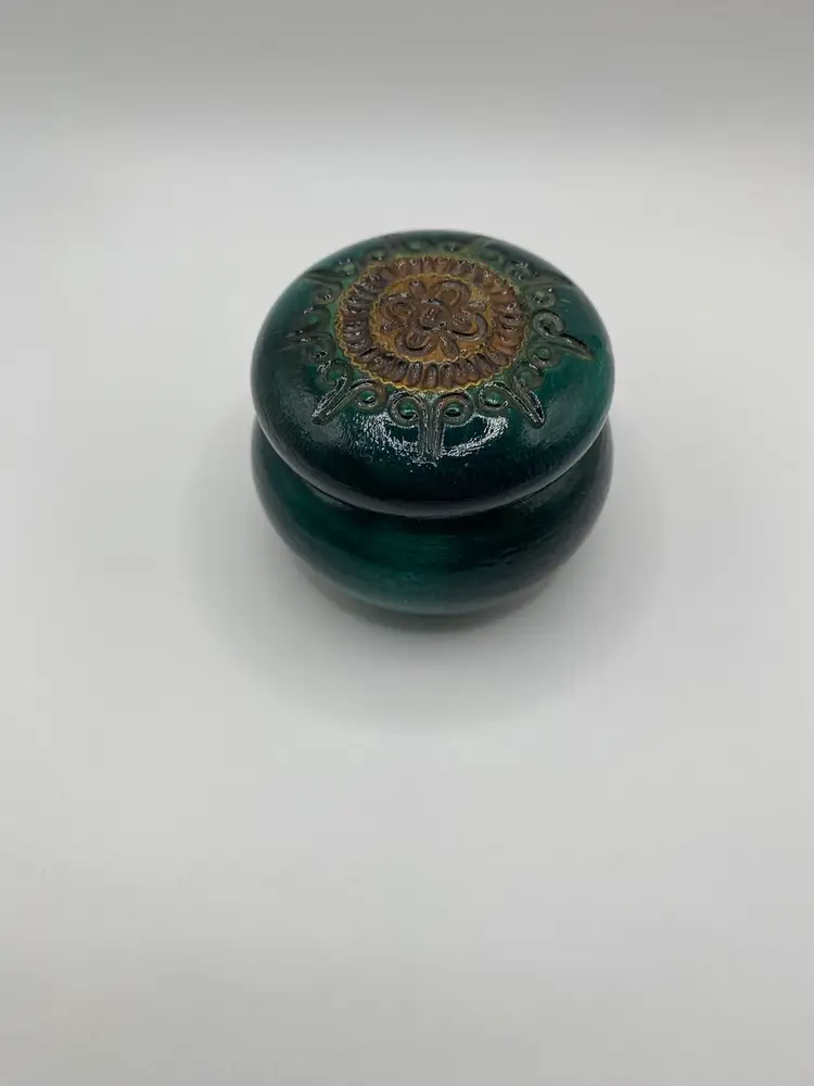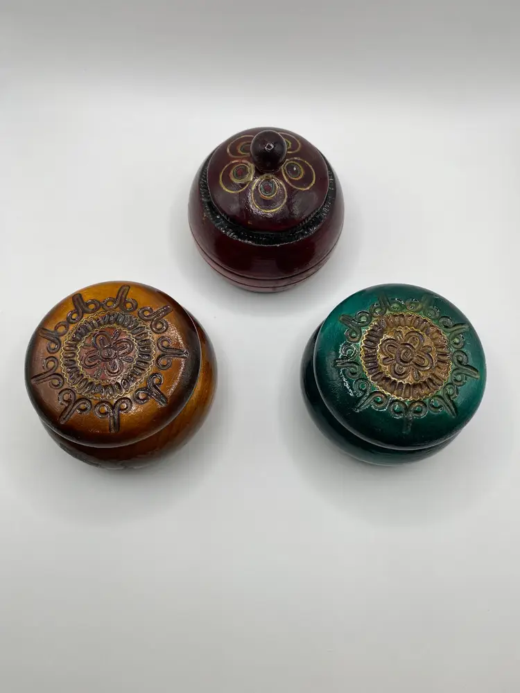 Beautiful small wooden hand carved trinket boxes. Each is a different color: Brown, Red, Green. Lot of 3. Good condition.