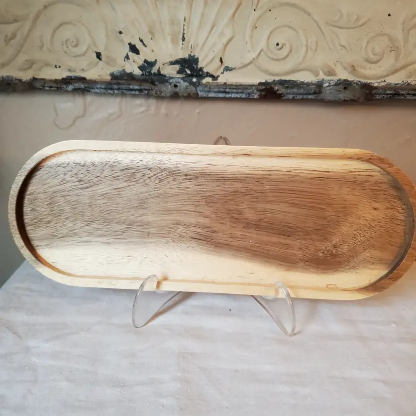 This small wooden tray is great for the kitchen counter to hold condiments, candles etc. 11 1/4 x 4".