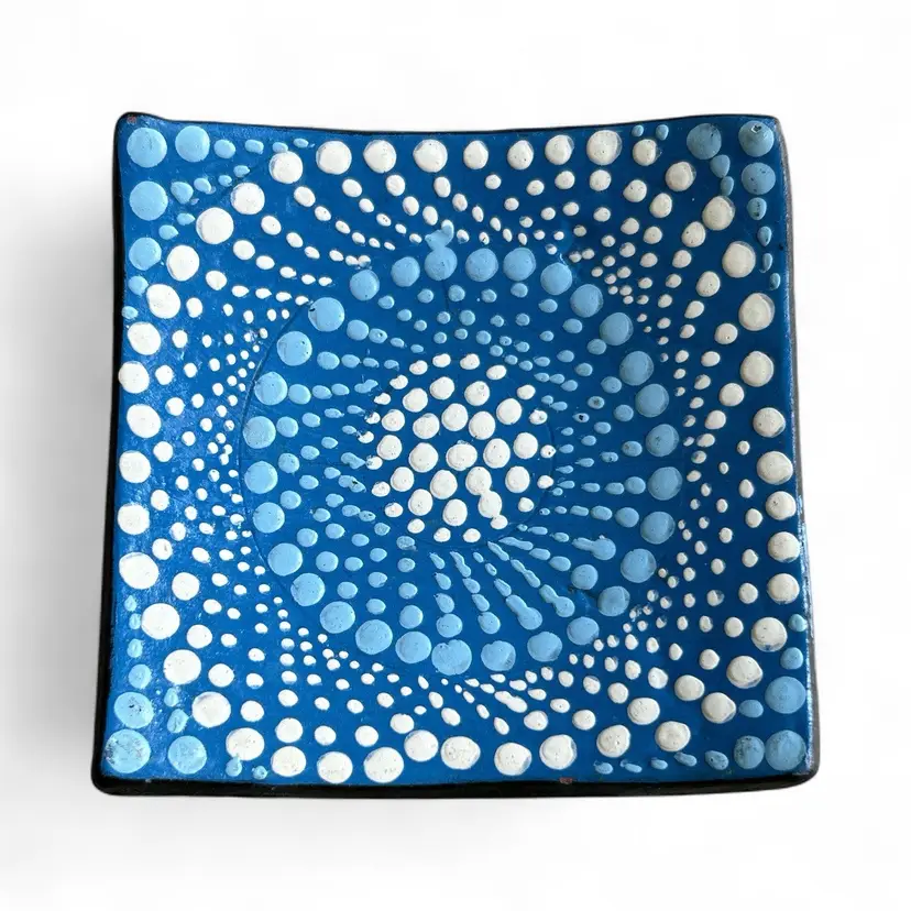 Brighten up your space with this vibrant blue ceramic dish featuring a mesmerizing dot mandala design. Perfect for holding trinkets or as a decorative piece. Size: 4” x 4”