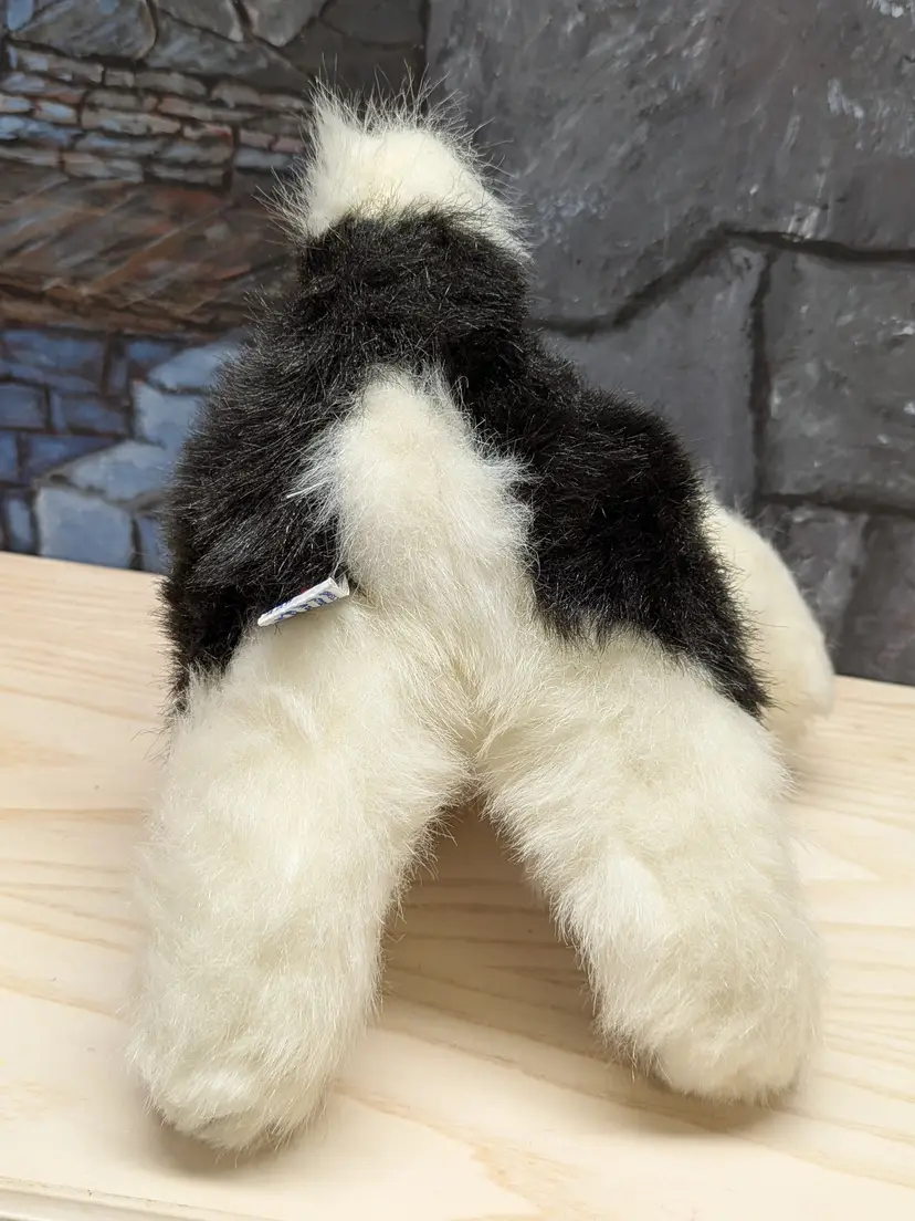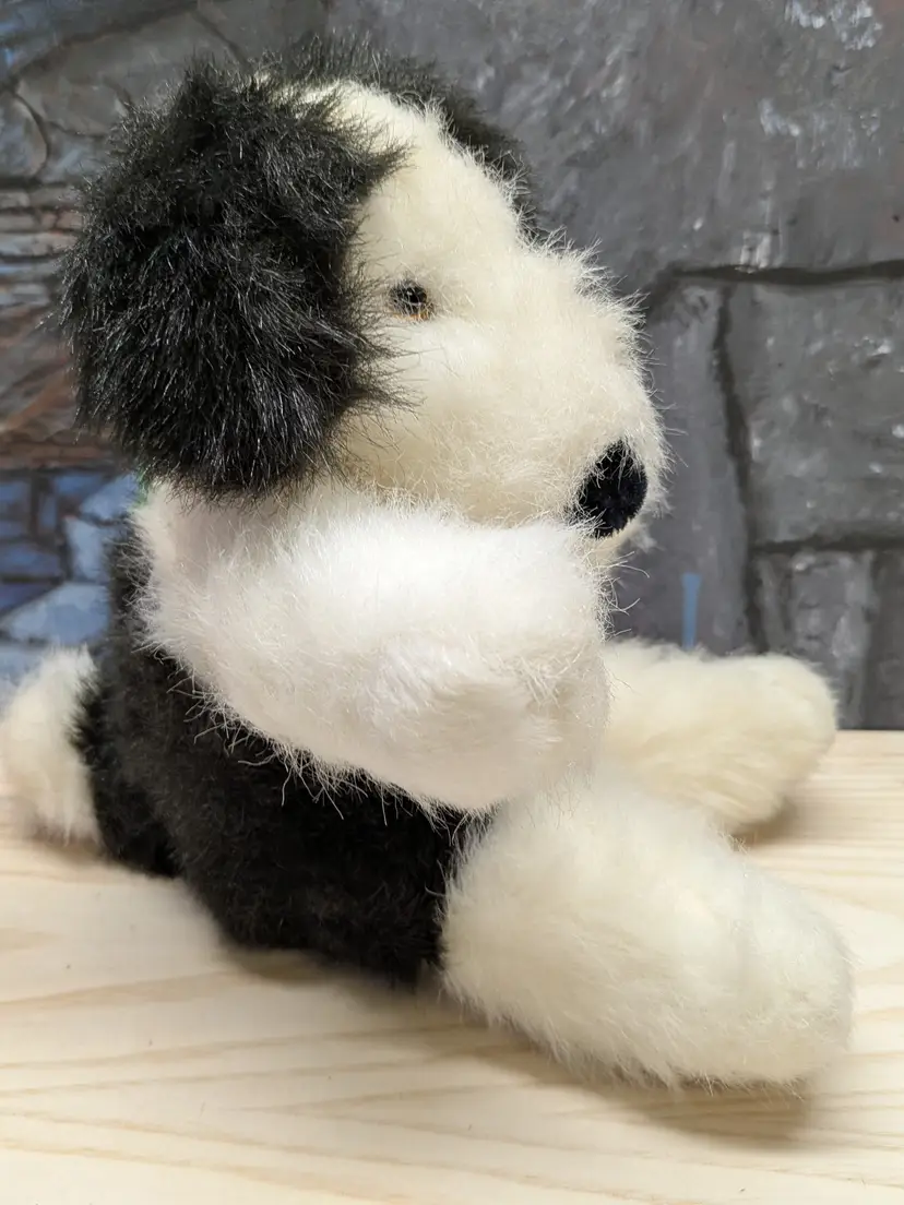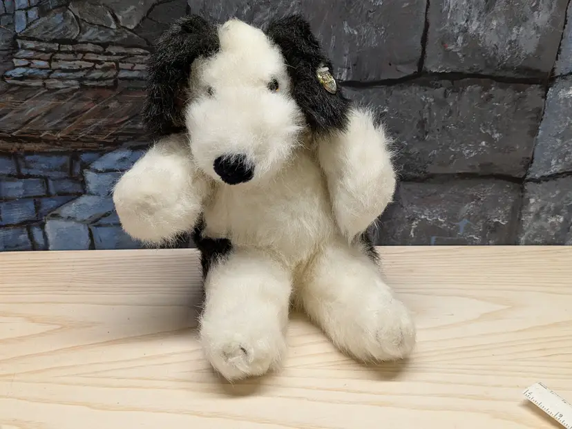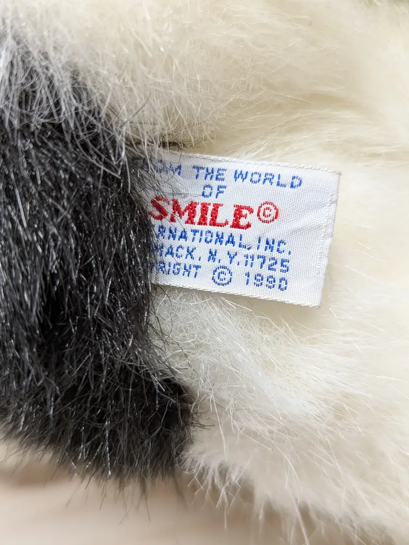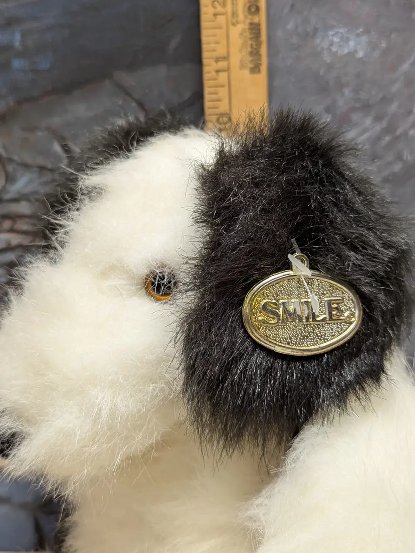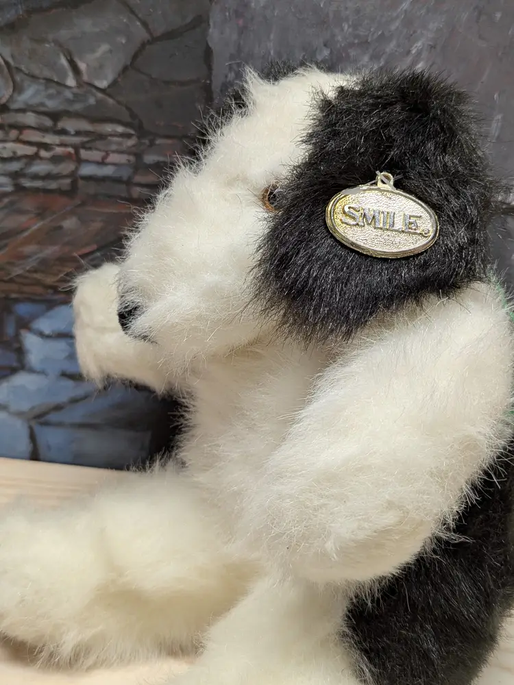 Smile International Dog Plush fuzzy furry soft lovable puppy Mut sheep dog 10"Tall 1990 Black White Stuffed Animal Sitting Vintage . Plastic eyes with a black felt nose. Was he your childhood buddy Great condition Clean with no damage. There are no holes no weird smells. Please check the photos for details. Comes from a smoke free home. We do have pets.