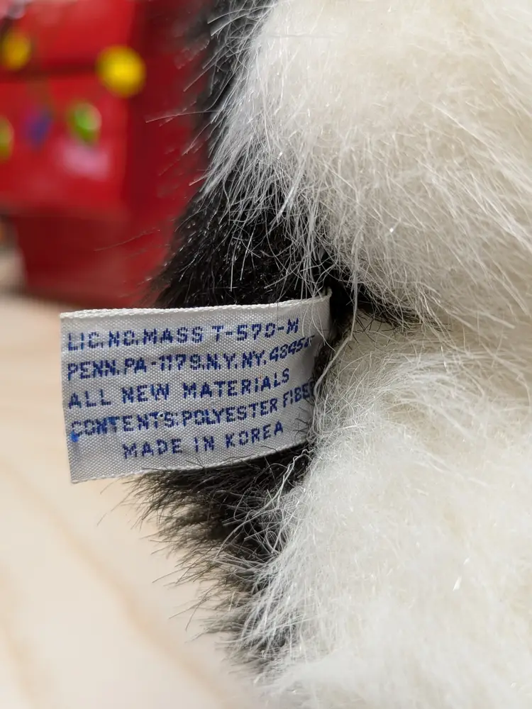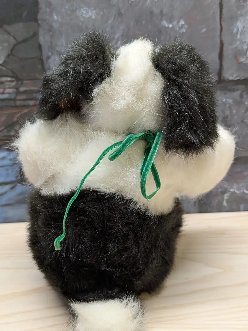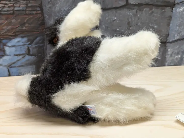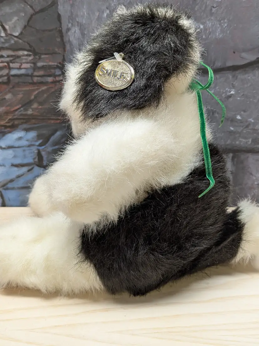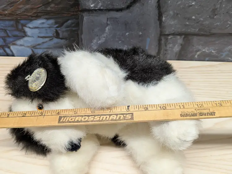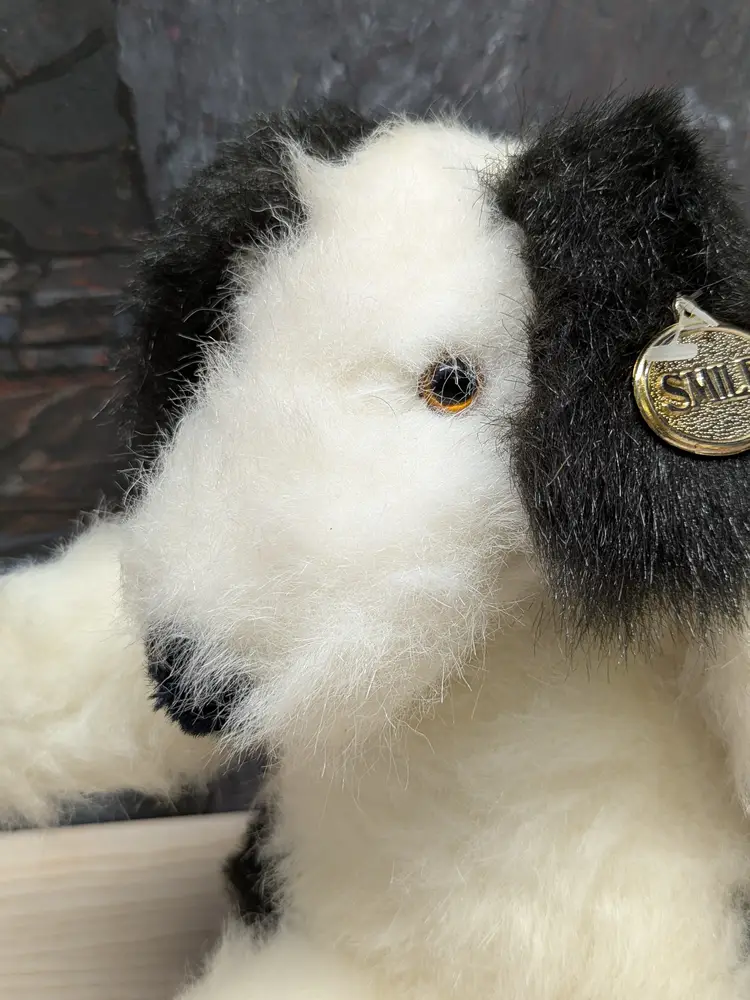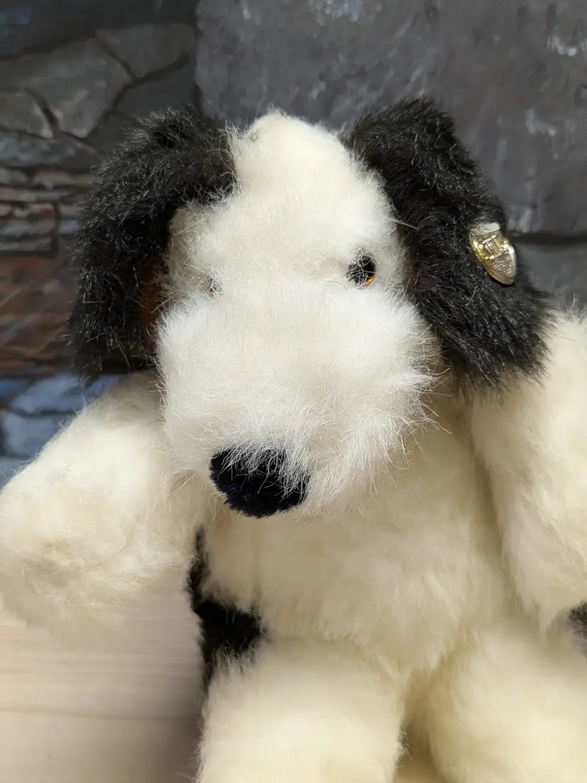 Smile International Dog Plush fuzzy furry soft lovable puppy Mut sheep dog 10"Tall 1990 Black White Stuffed Animal Sitting Vintage . Plastic eyes with a black felt nose. Was he your childhood buddy Great condition Clean with no damage. There are no holes no weird smells. Please check the photos for details. Comes from a smoke free home. We do have pets.