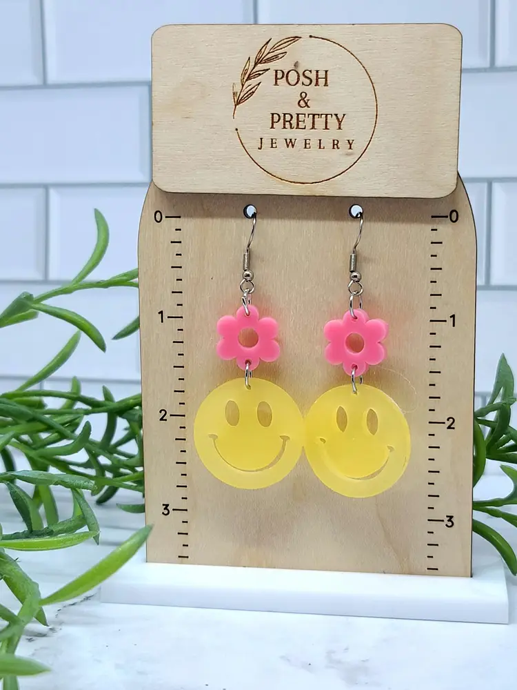 Brighten up your day with these Smiley Face Flower Dangle Earrings. Featuring cheerful yellow smiley faces paired with cute pink flowers, these earrings add a fun and playful touch to any outfit. Made from lightweight acrylic with stainless steel earring hooks. Approximately 2.5" long.