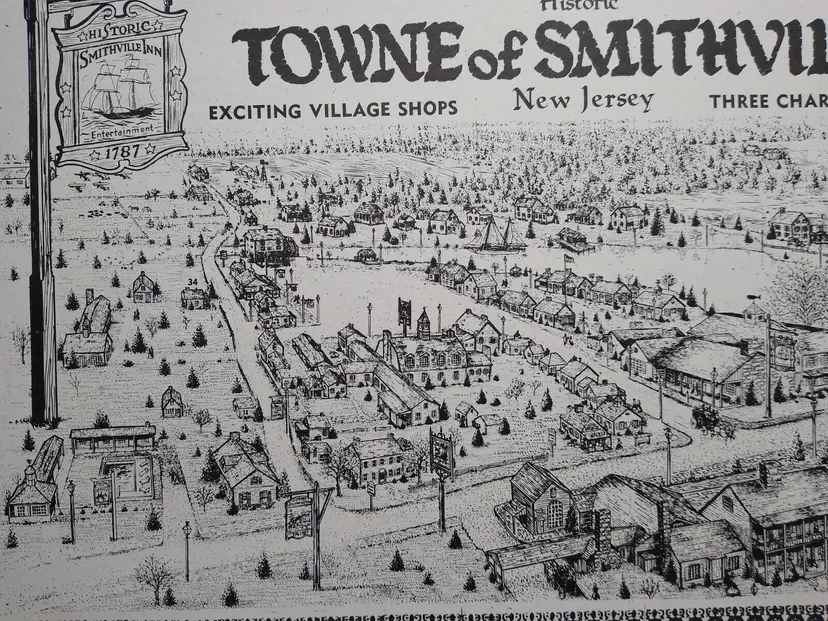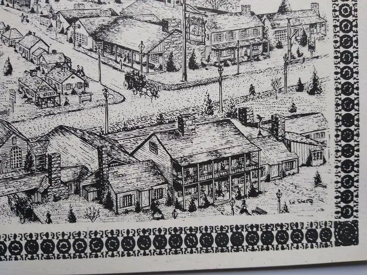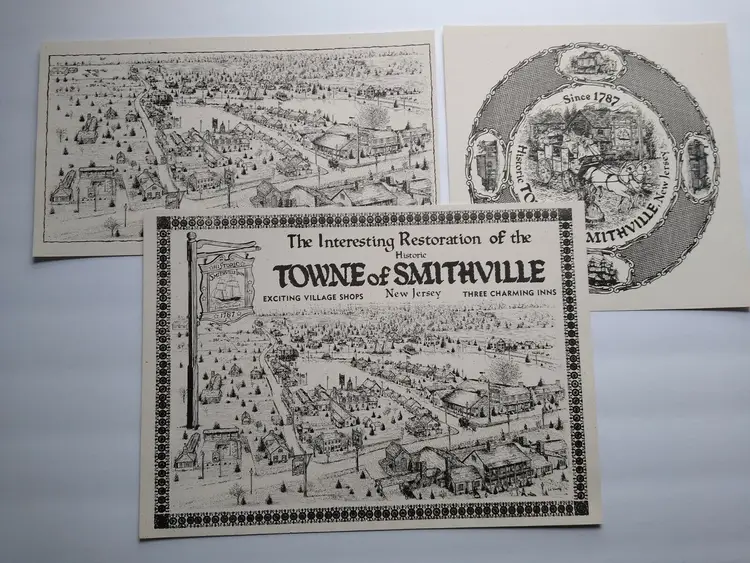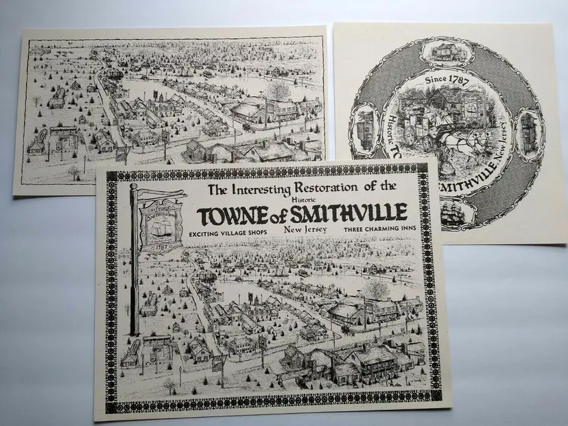 Vintage set of (3) different thick stock paper prints or menu artwork sheets? All is great clean condition with only minor edge wear. They show the Smithville, New Jersey village and a sign that reads Historic Smithville Inn Entertainment 1787. The largest one is about 10.5" X 15". The smallest is 10" X 10" size. Two prints are signed by artist Ed Sheetz.
