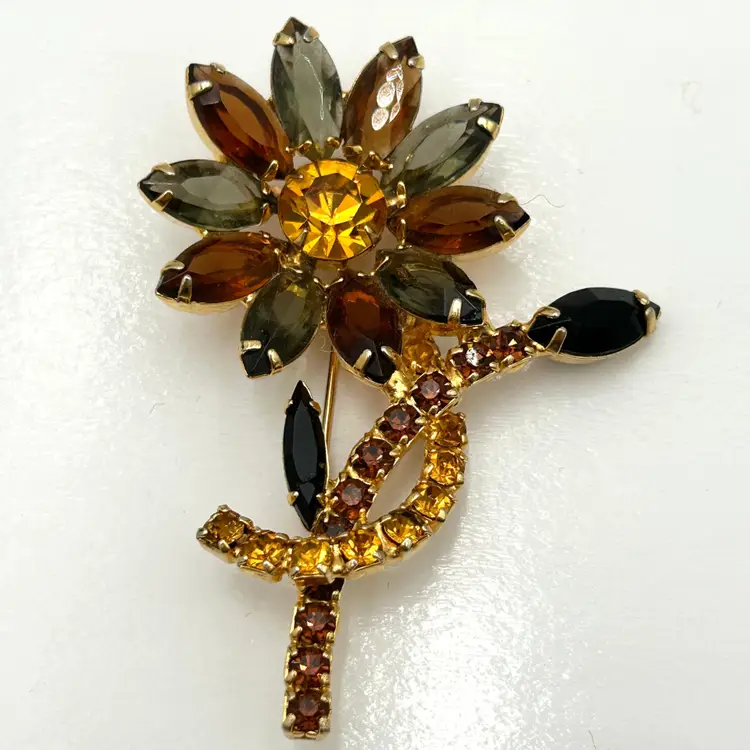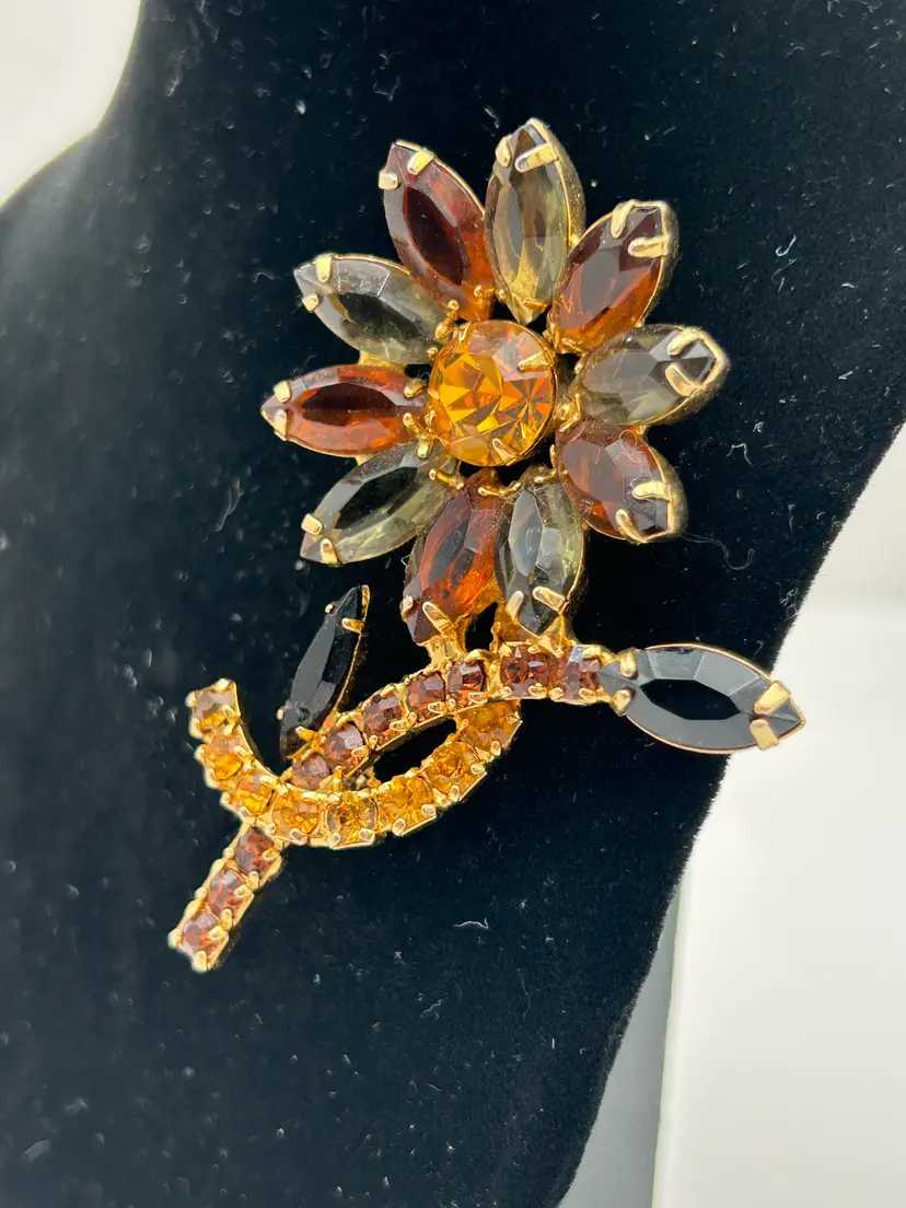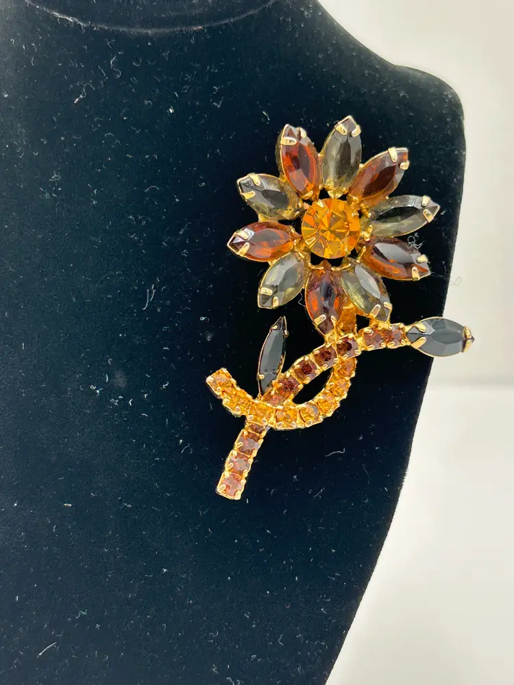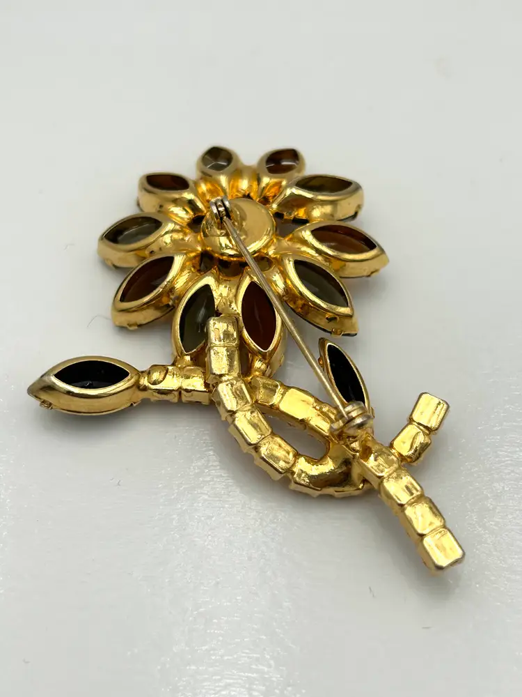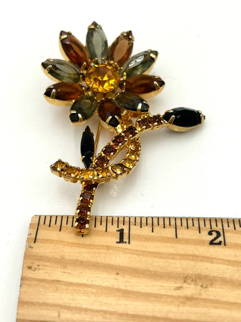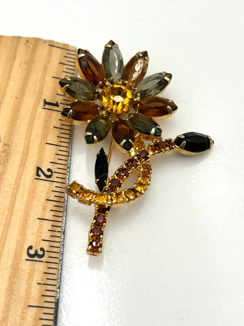 This is a stunning piece of vintage jewelry with three different colors of rhinestones in a gold tone setting. The flower petals are a smokey gray and amber with very dark stone leaves and colorful stems. The back has a c clasp that works well. It is about 3 inches tall and approximately 2 inches wide with the leaves included. The brooch has all of its stones and no issues.