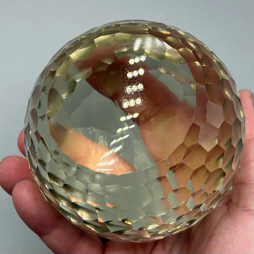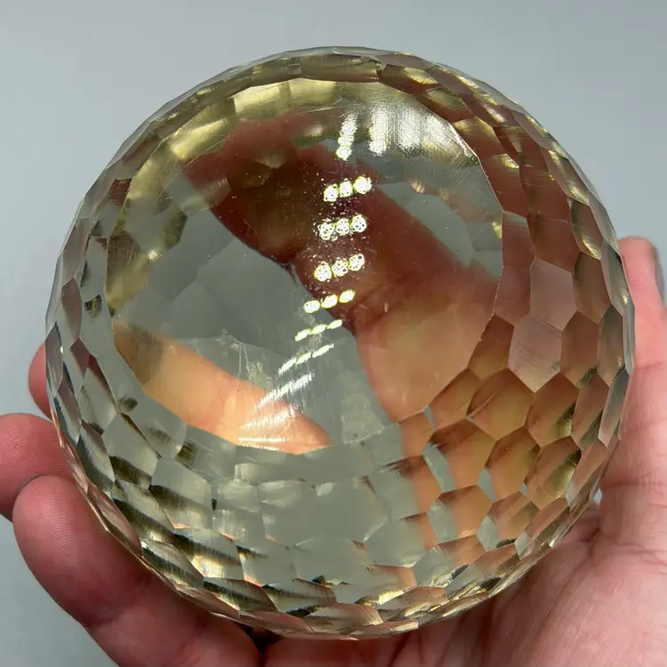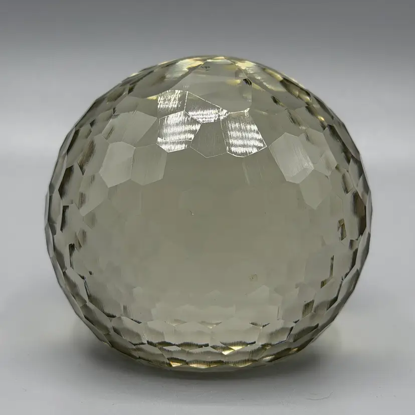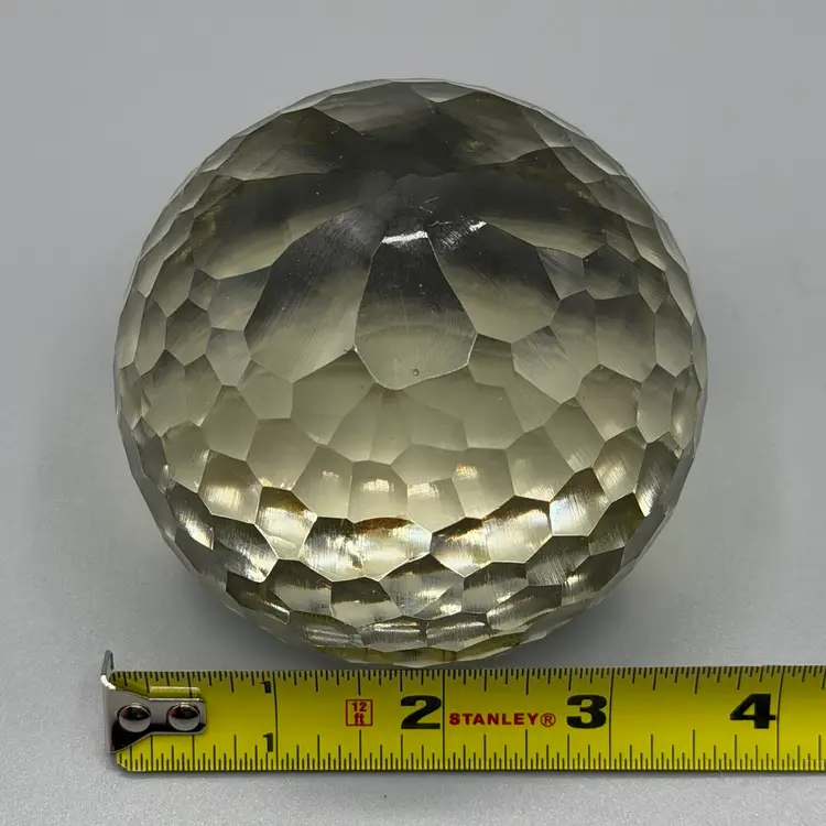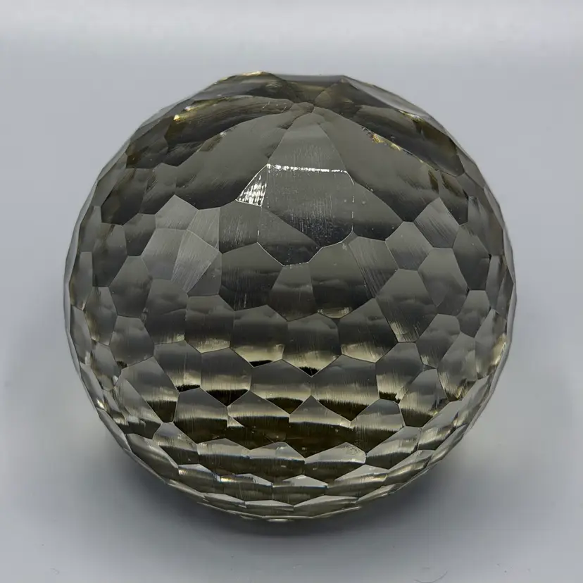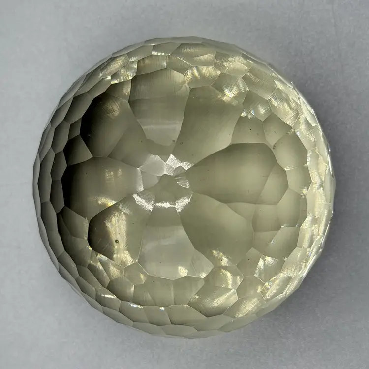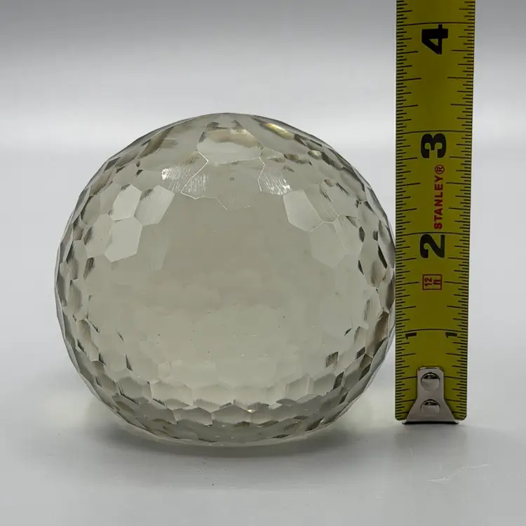 This interesting solid paperweight has been cut to give this intensely faceted look. Each cut is slight dipped/curved giving it almost a rustic look. The bottom is nicely polished and it is unsigned. It is about 3-1/4 inches tall.