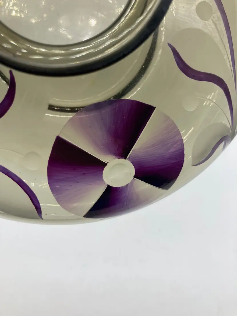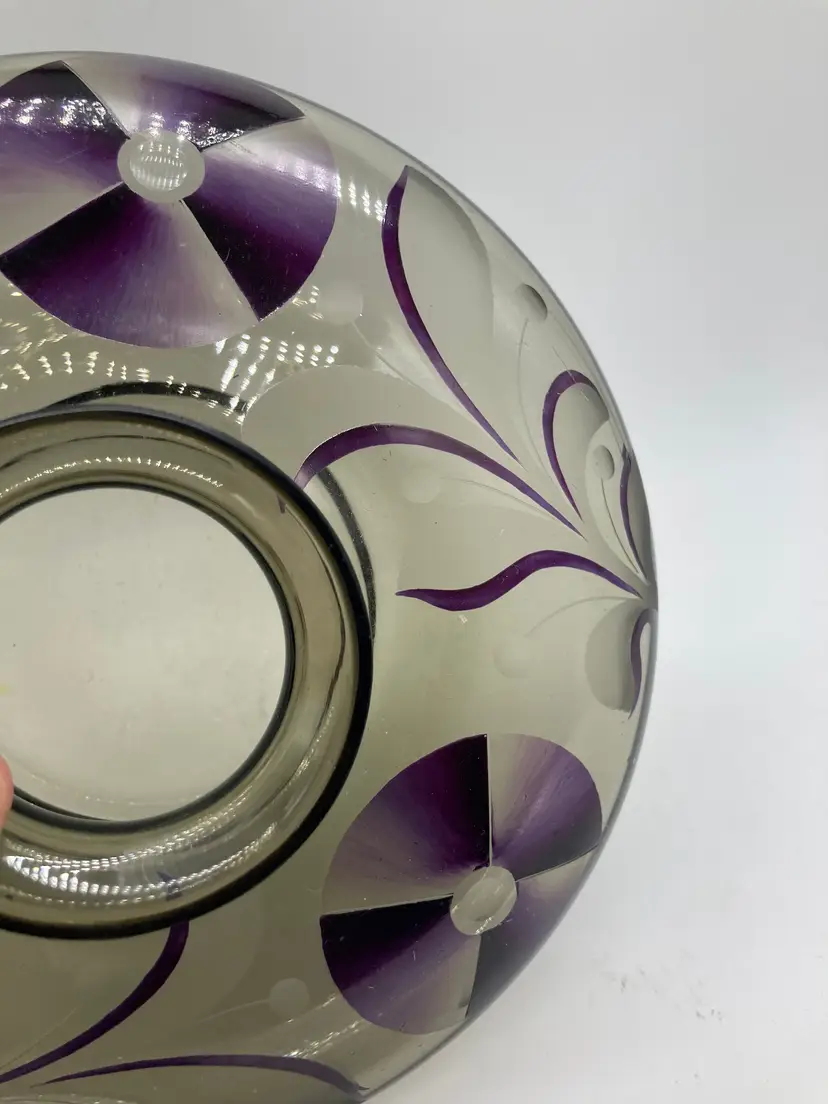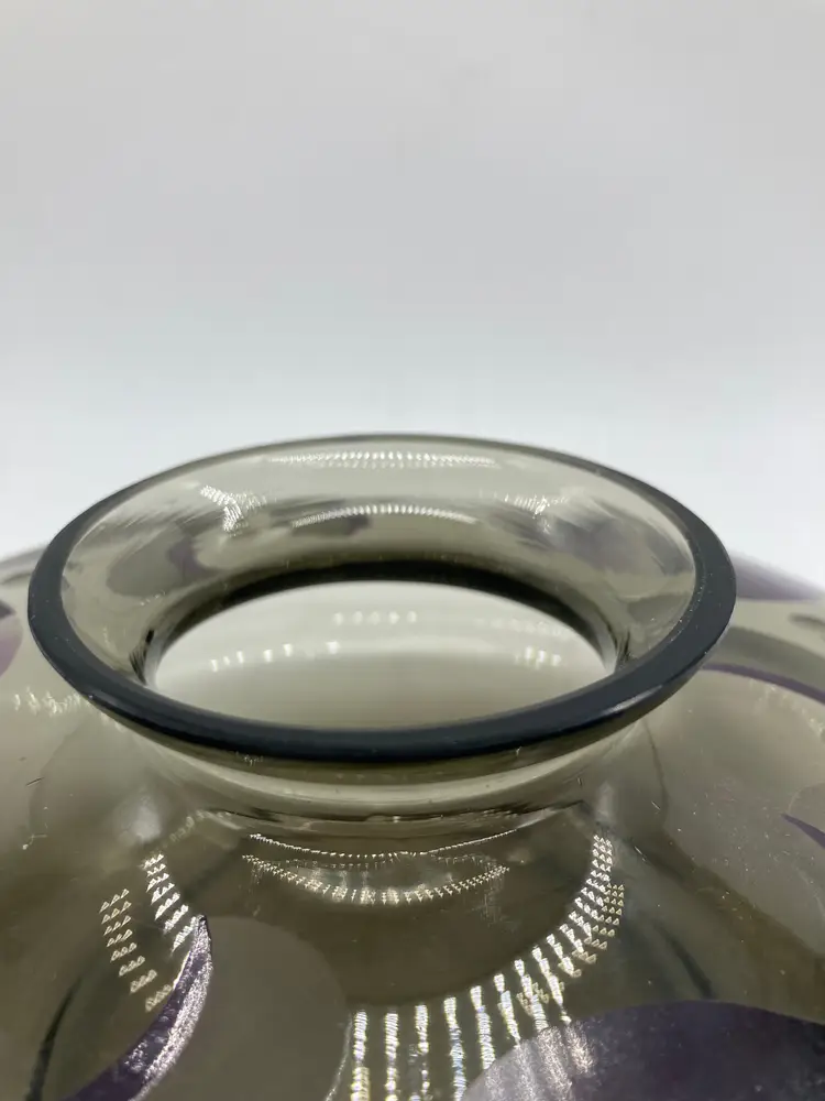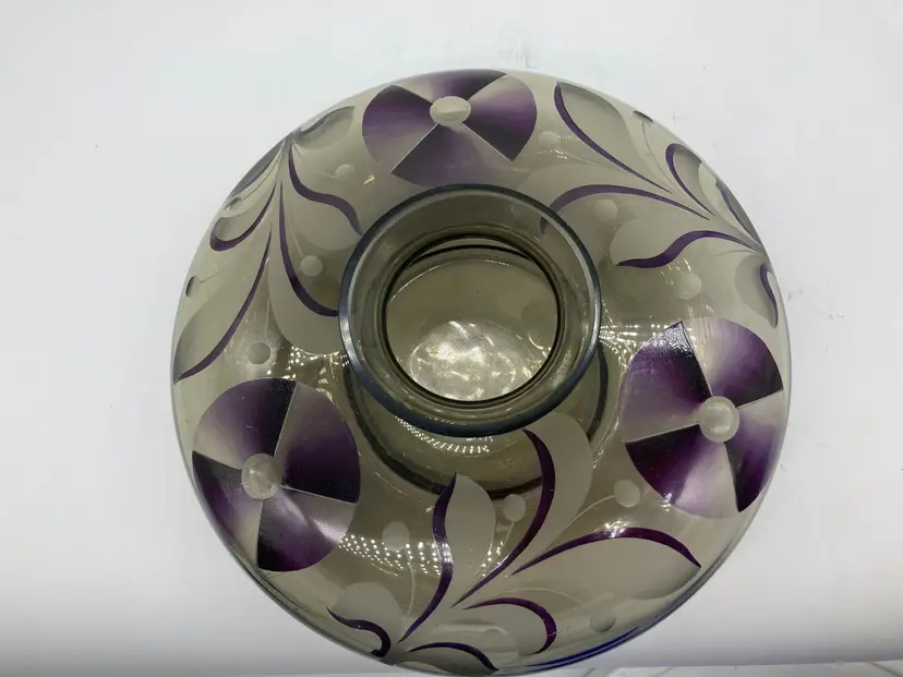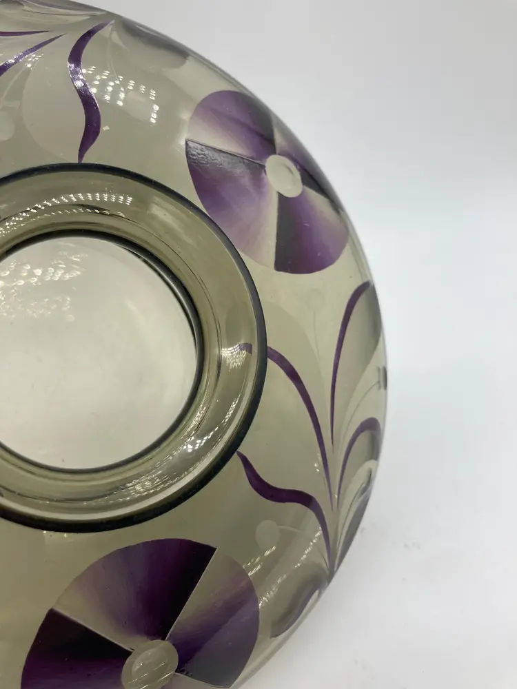 This is a stunning vase, hand made, etched stylized Art Deco leaf and flower motif that has depth, texture, colour and mystery. No signature on base, but very similar in style to some glass from Sabino Vernox Paris, circa 1930s. No chips, even on the neck opening, and the purple applied paint is vivid and deep. Measures 8.5” diameter, 3.5” high. Rare collector piece.