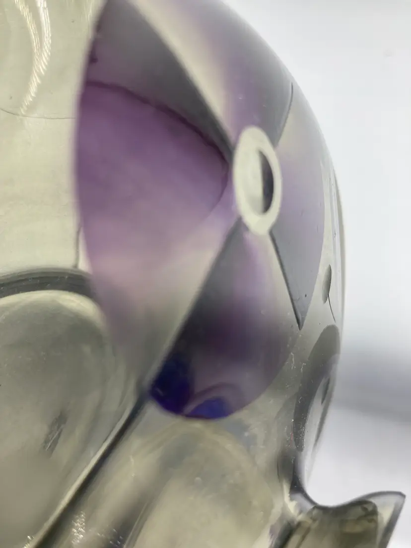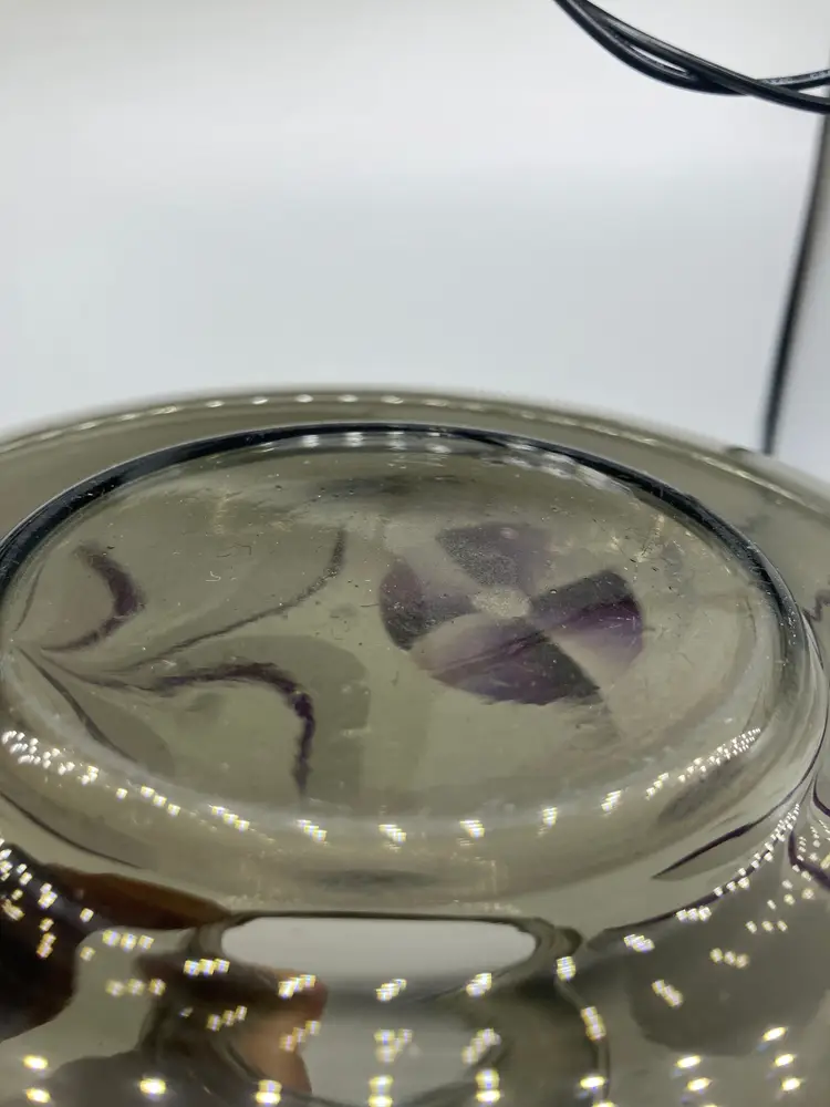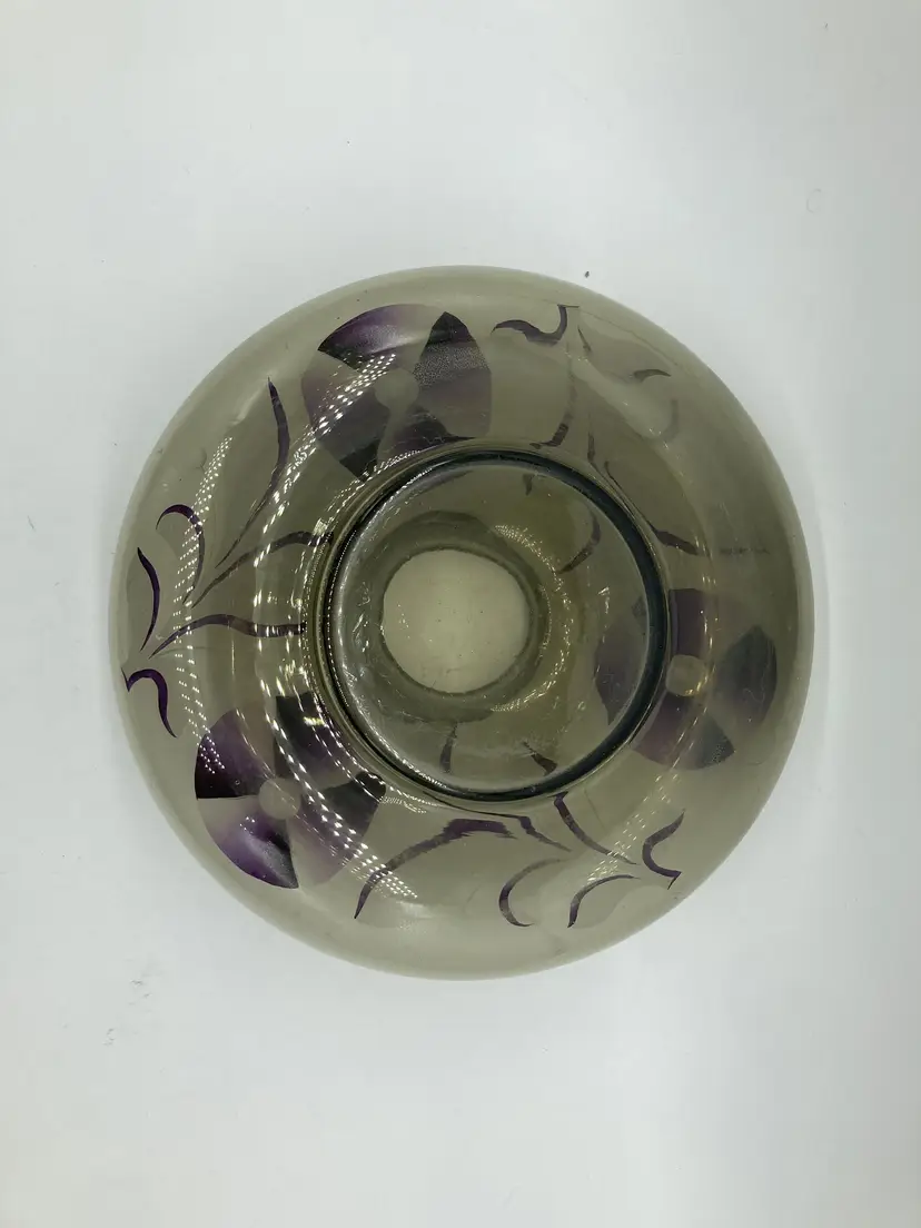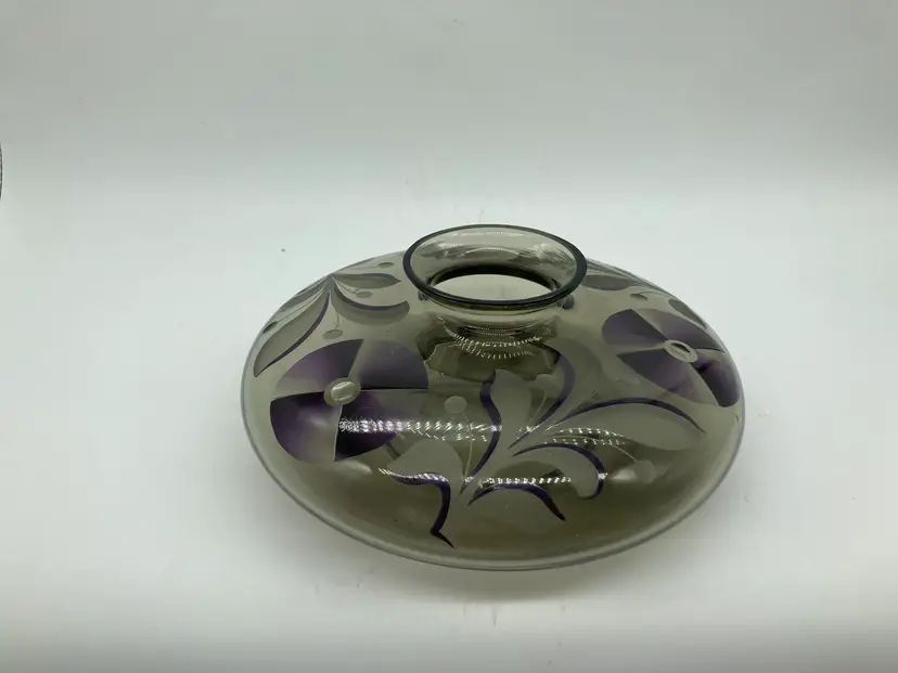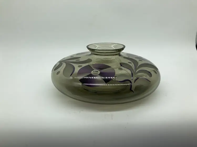 This is a stunning vase, hand made, etched stylized Art Deco leaf and flower motif that has depth, texture, colour and mystery. No signature on base, but very similar in style to some glass from Sabino Vernox Paris, circa 1930s. No chips, even on the neck opening, and the purple applied paint is vivid and deep. Measures 8.5” diameter, 3.5” high. Rare collector piece.