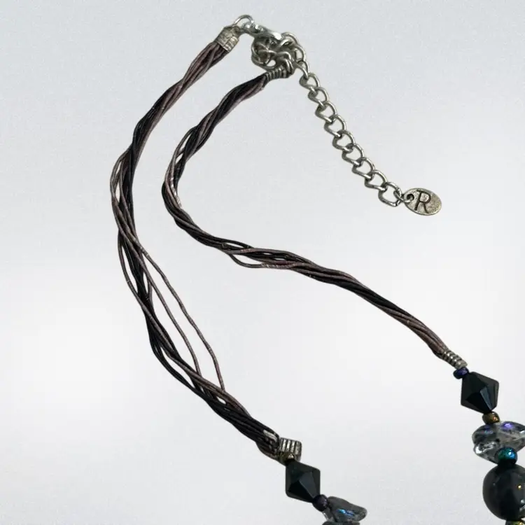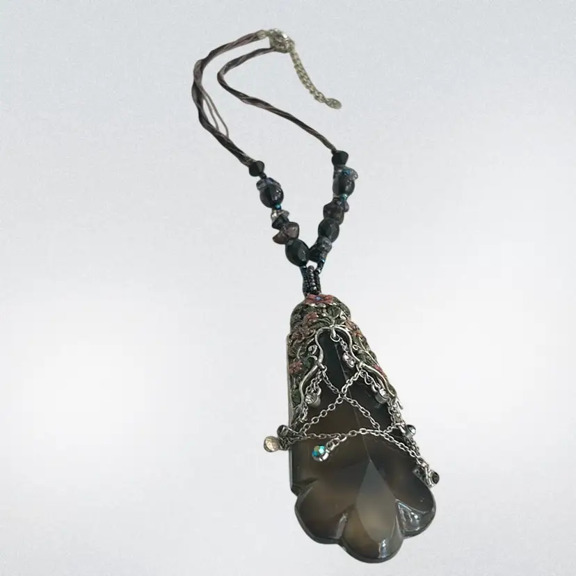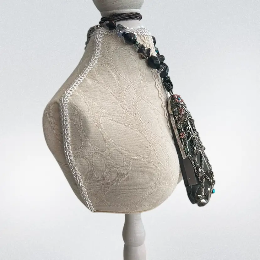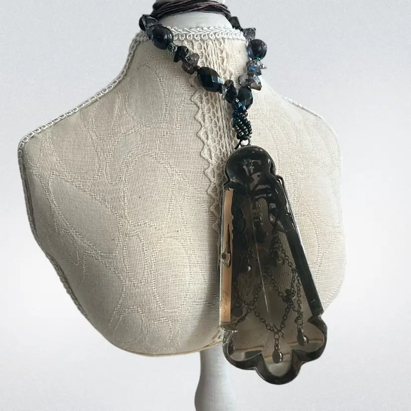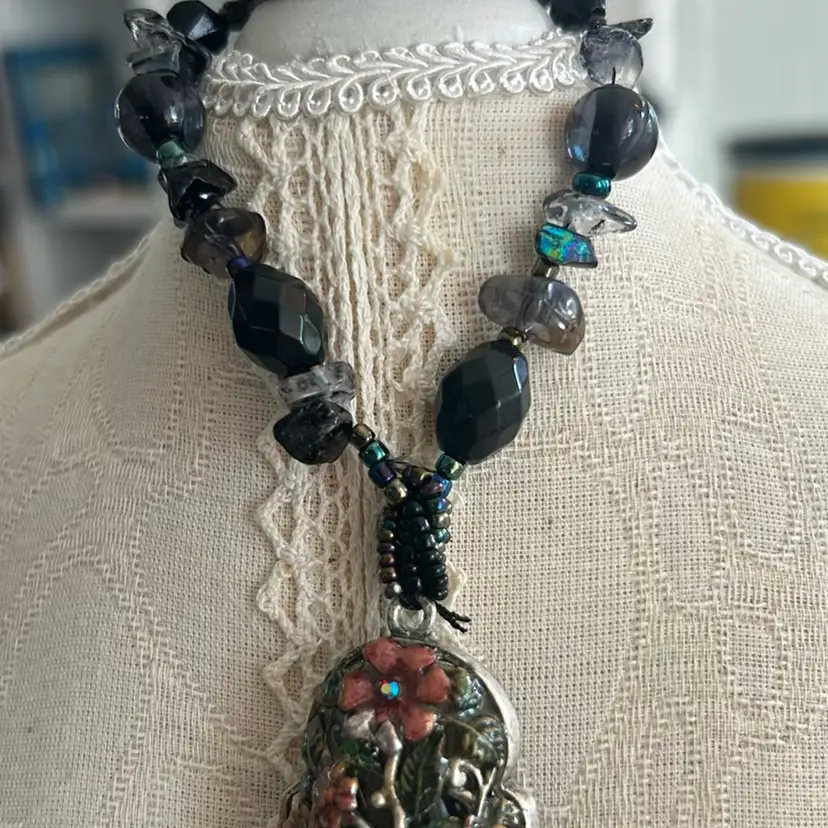 OOAK contemporary piece featuring a large, embellished pendant made of faceted glass. The pendant is adorned at the top with a floral garden design in enamels of pink, lavender, and green and is finished with small decorative chains at Faceted glass pendant, smoky quartz polished nugget beads, and enamel embellishments. The pendant measures approximately 3 inches long by 2 inches wide. The necklace itself is 18 inches long and includes a 3-inch chain extension. It weighs approximately 3 ounces. (BSA1.5)