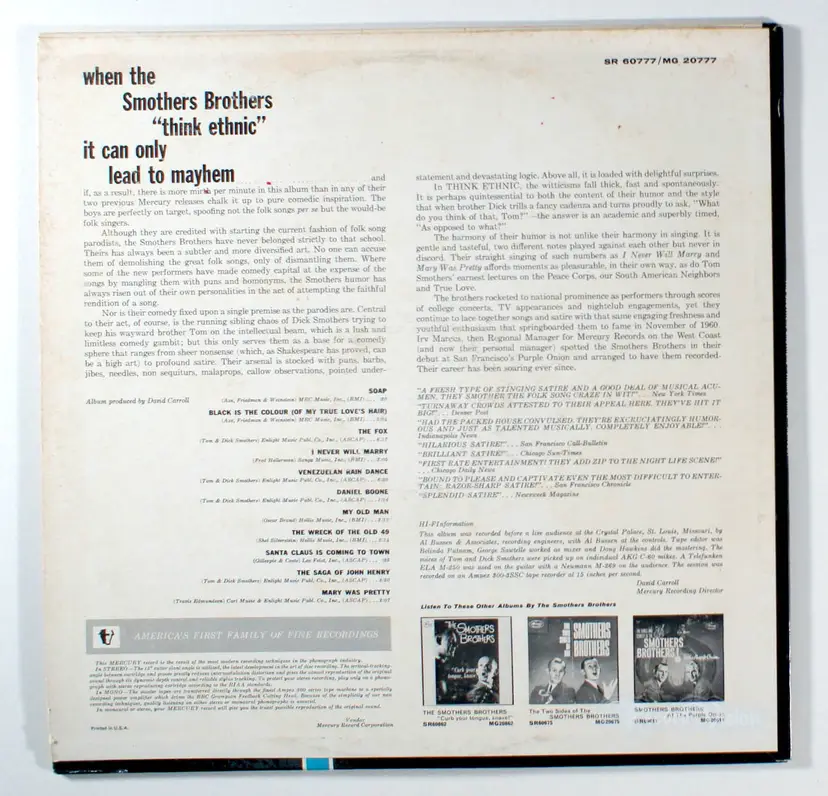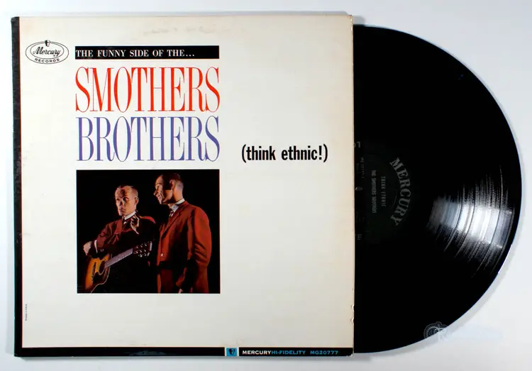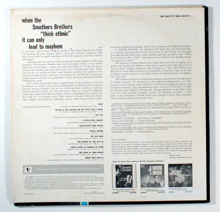 Think Ethnic! is the third comedy album of the Smothers Brothers. It reached No. 27 on the Billboard Pop Albums chart in 1964. Central to their act is the running sibling chaos of Dick Smothers trying to keep his wayward brother Tom on the intellectual beam; a comedy sphere that ranges from sheer nonsense to profound satire. Their arsenal is stocked with puns, barbs, jibes, needles, non sequiturs, malaprops, and delightful surprises. This album was recorded before a live audience at the Crystal Palace.